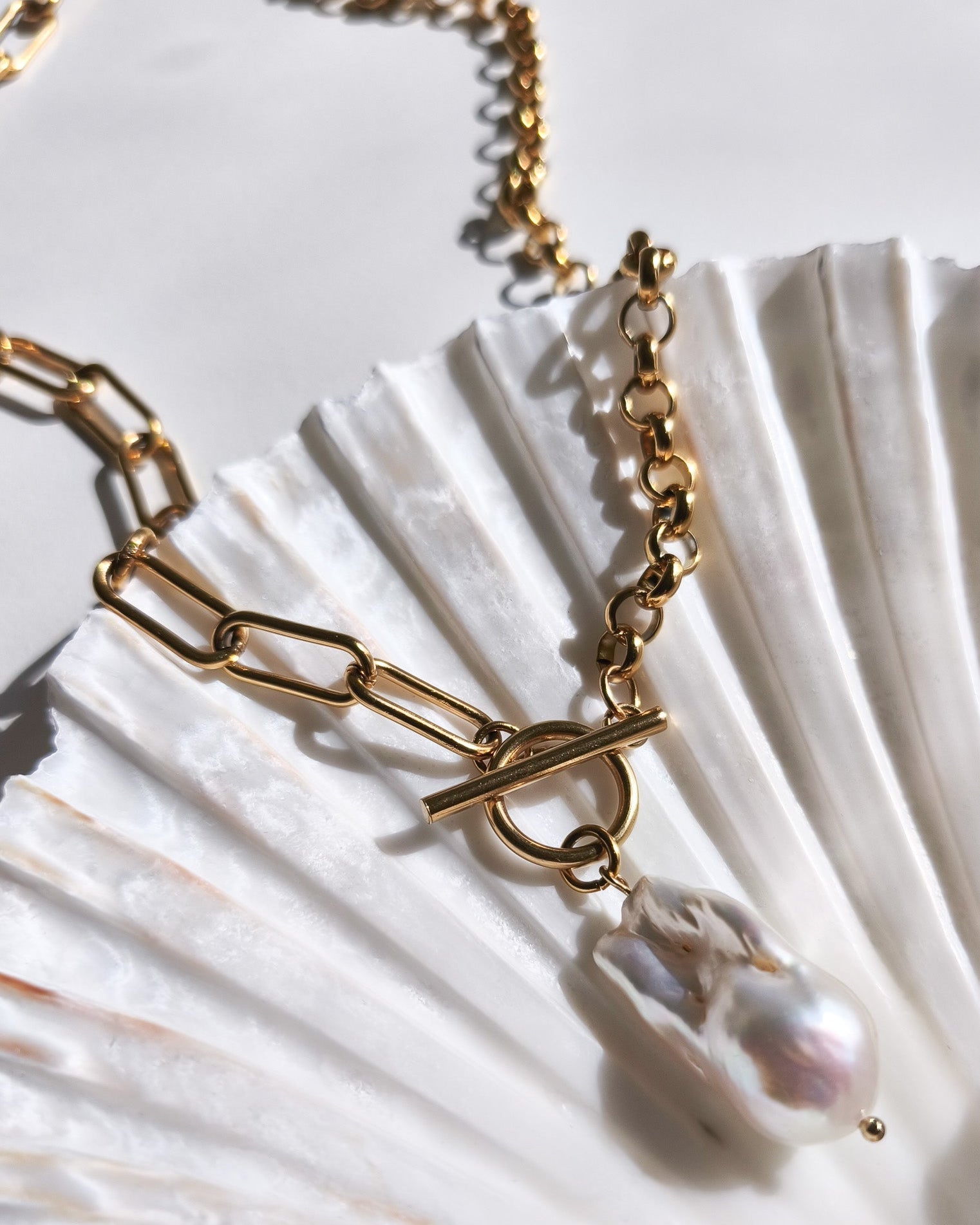 Asymmetrical necklace made of two types of chains with T-clasp and a large baroque pearl