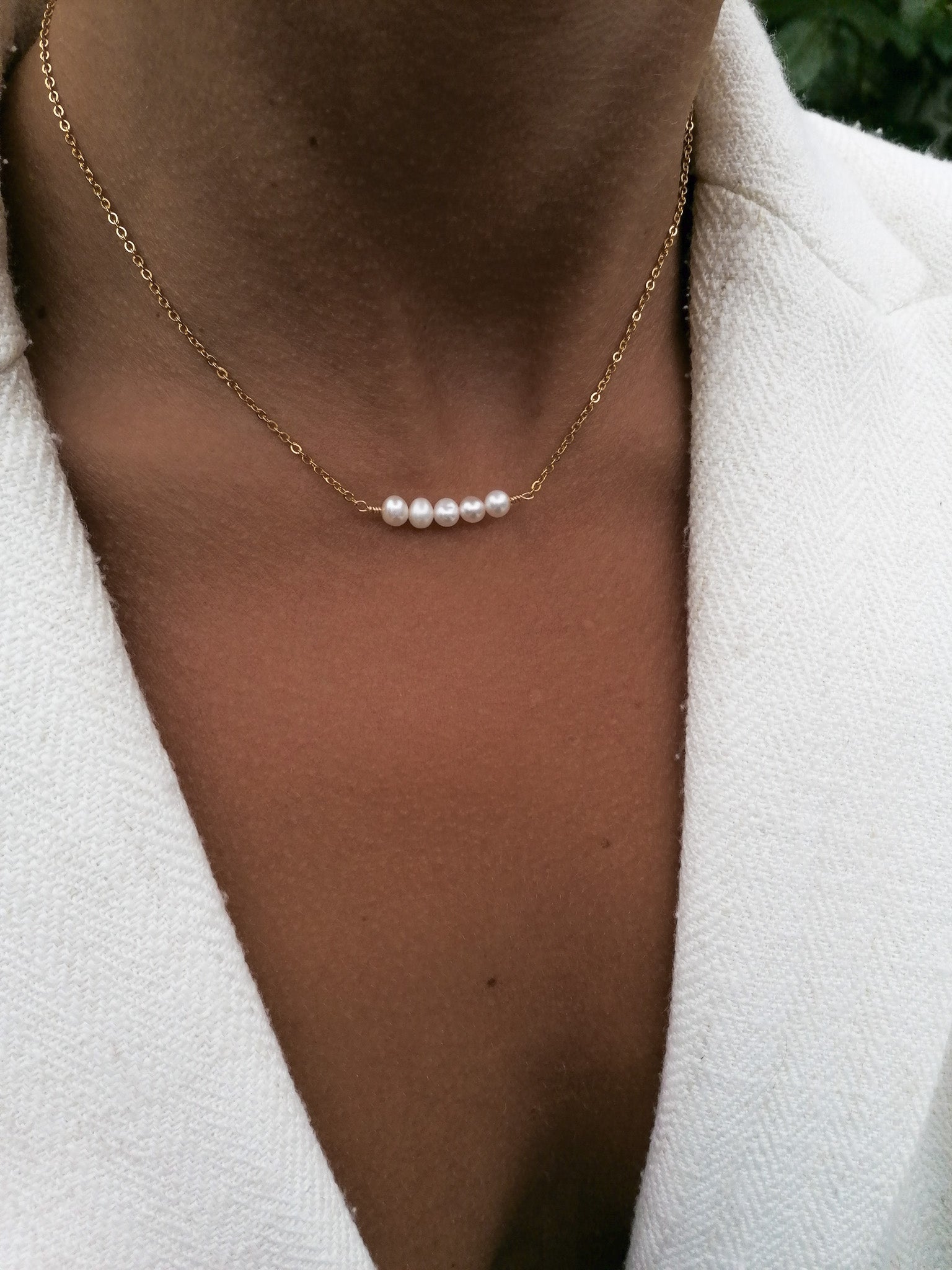 Five freshwater white pearls on a fine chain