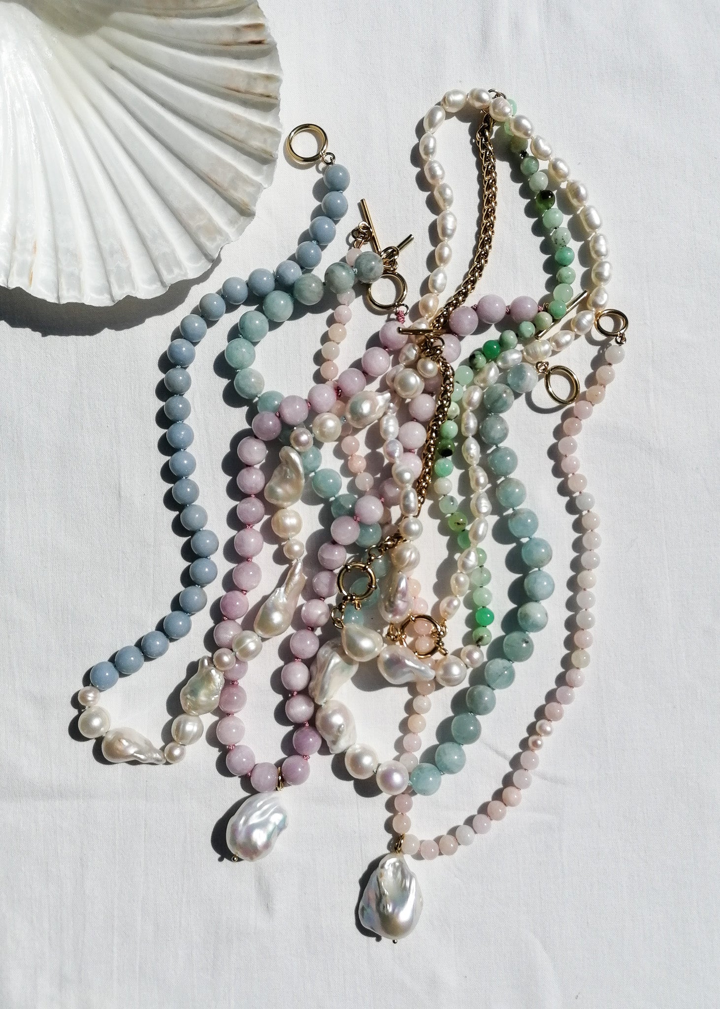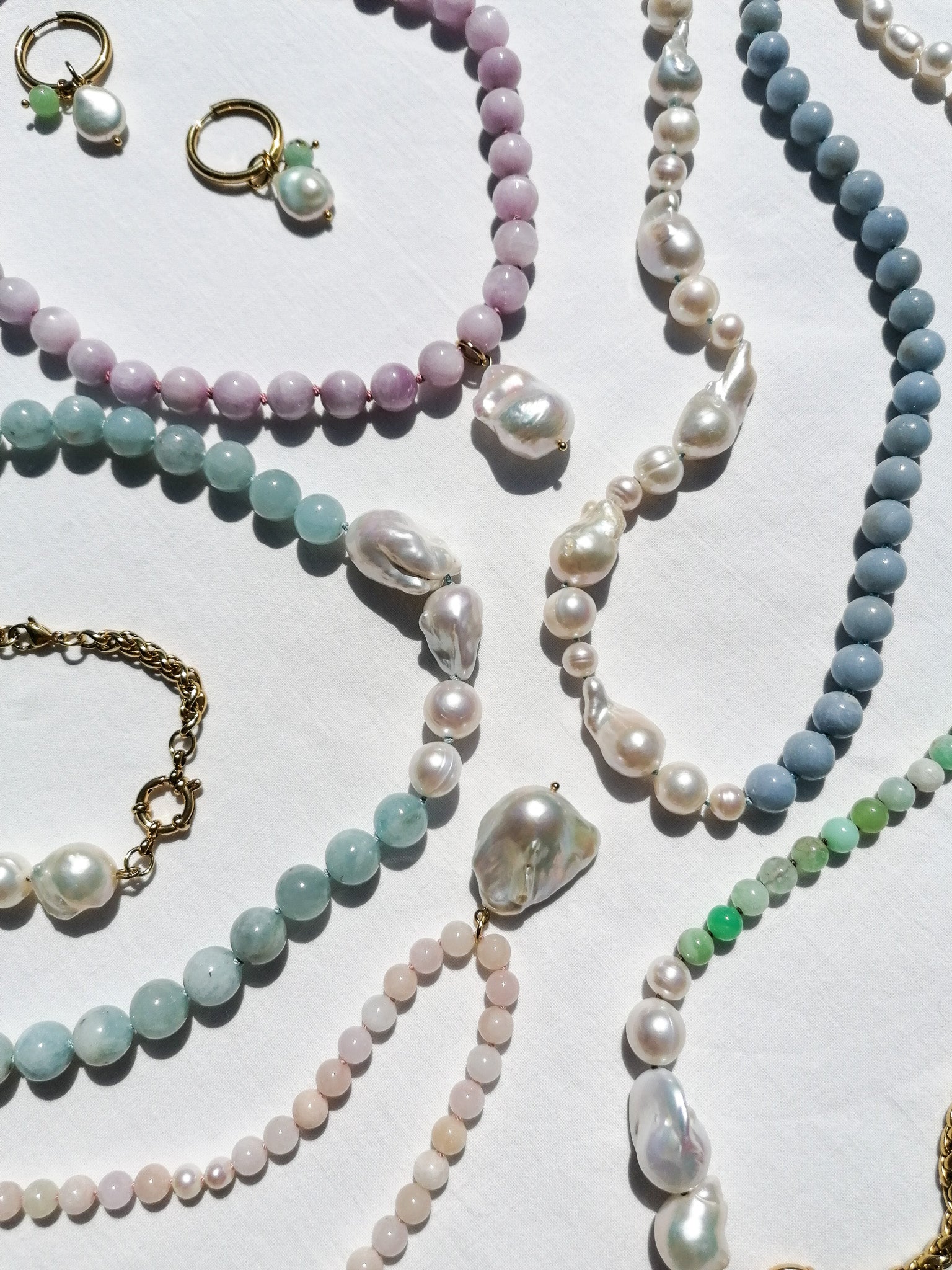 Pearls, minerals and gemstones should not come into contact with water, cosmetics or sweat - over time they will wear out more. I recommend removing all jewellery when doing sports, sleeping or other strenuous activities to extend their lifespan. The exception is all-metal jewellery made of steel without stones or pearls.