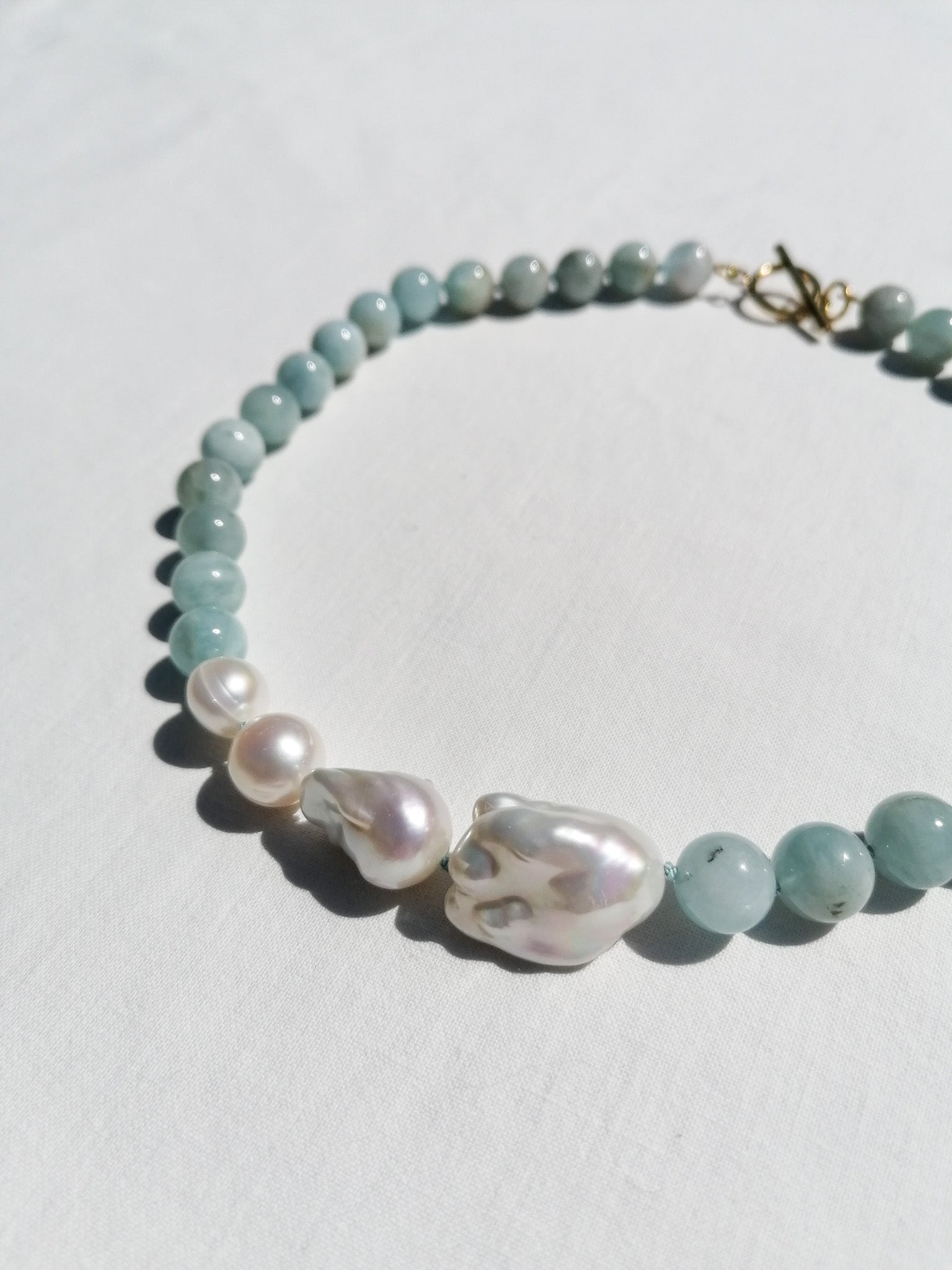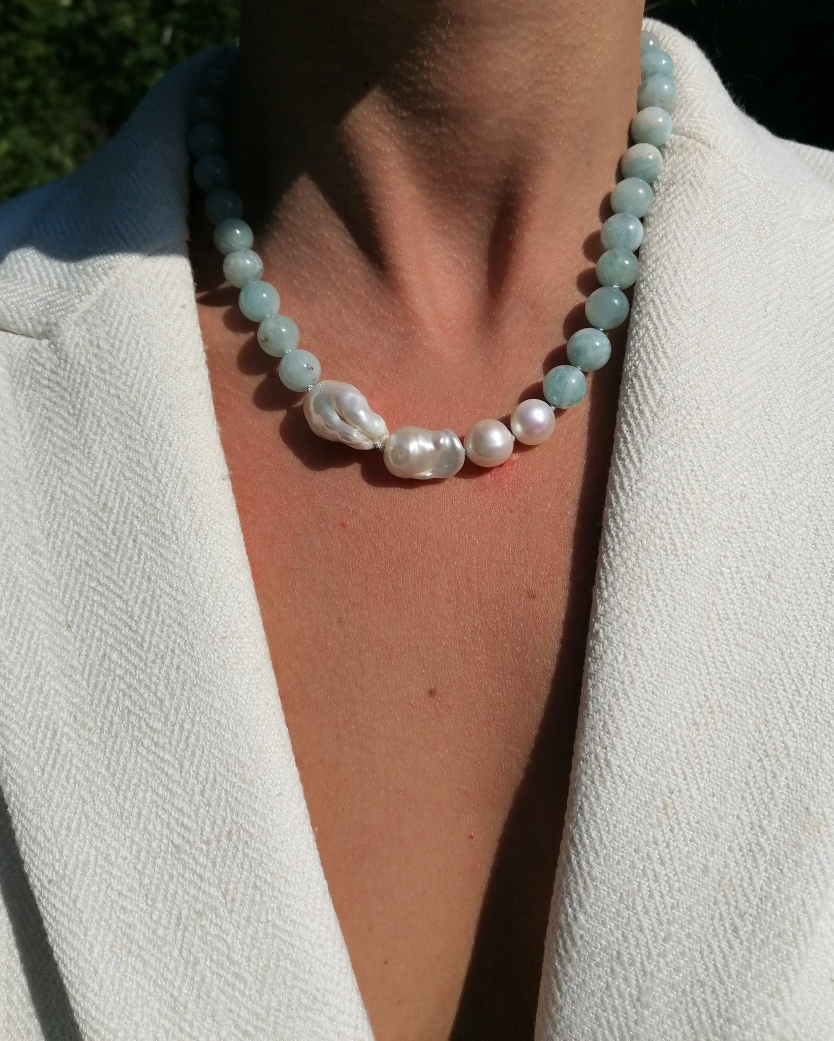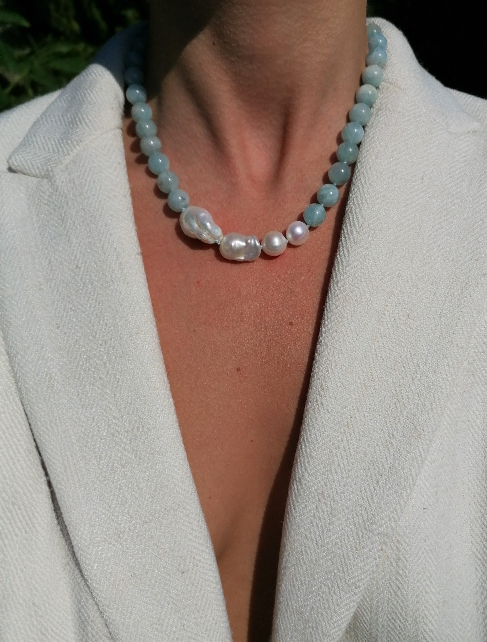 Asymmetrical necklace made of aquamarine and white freshwater baroque pearls