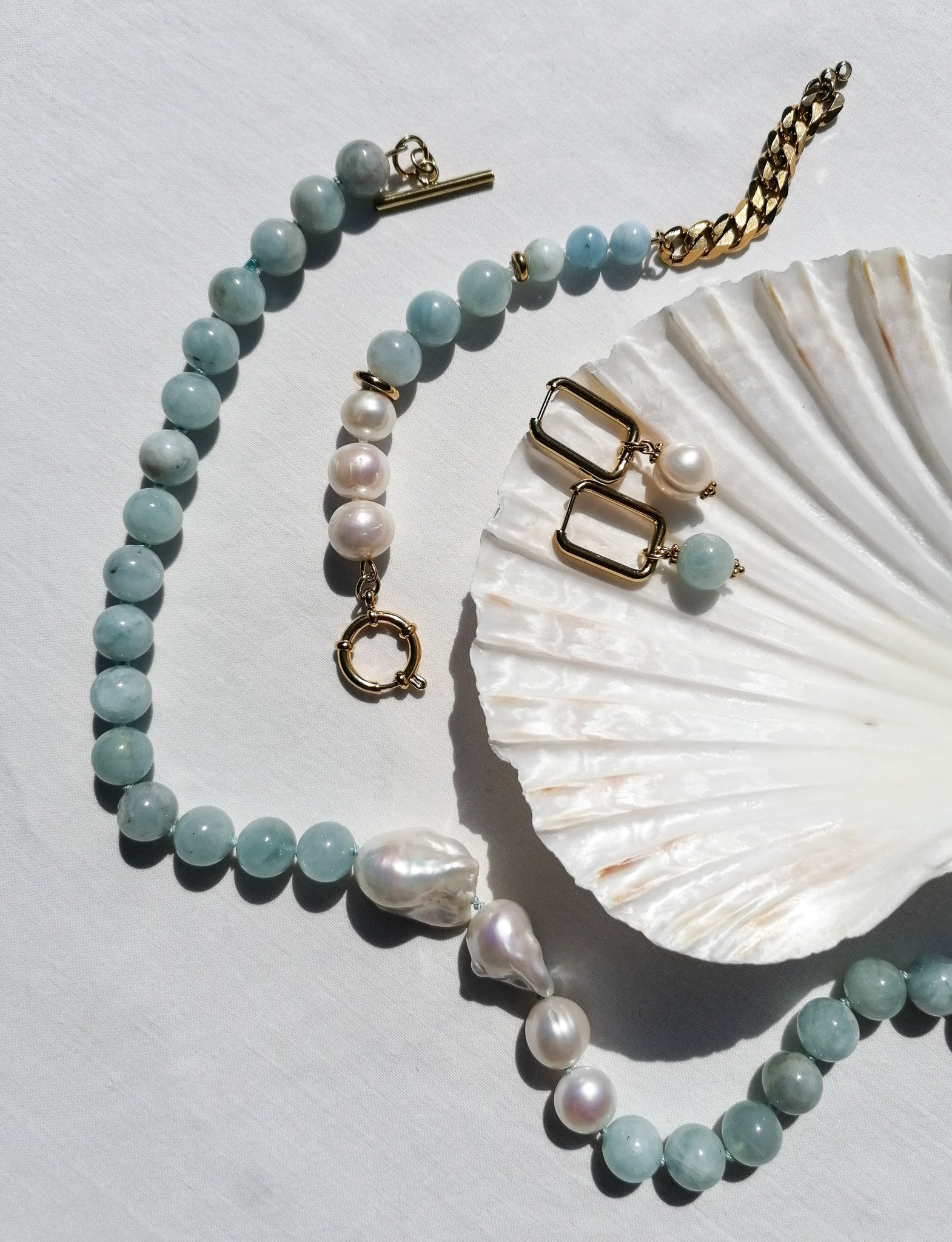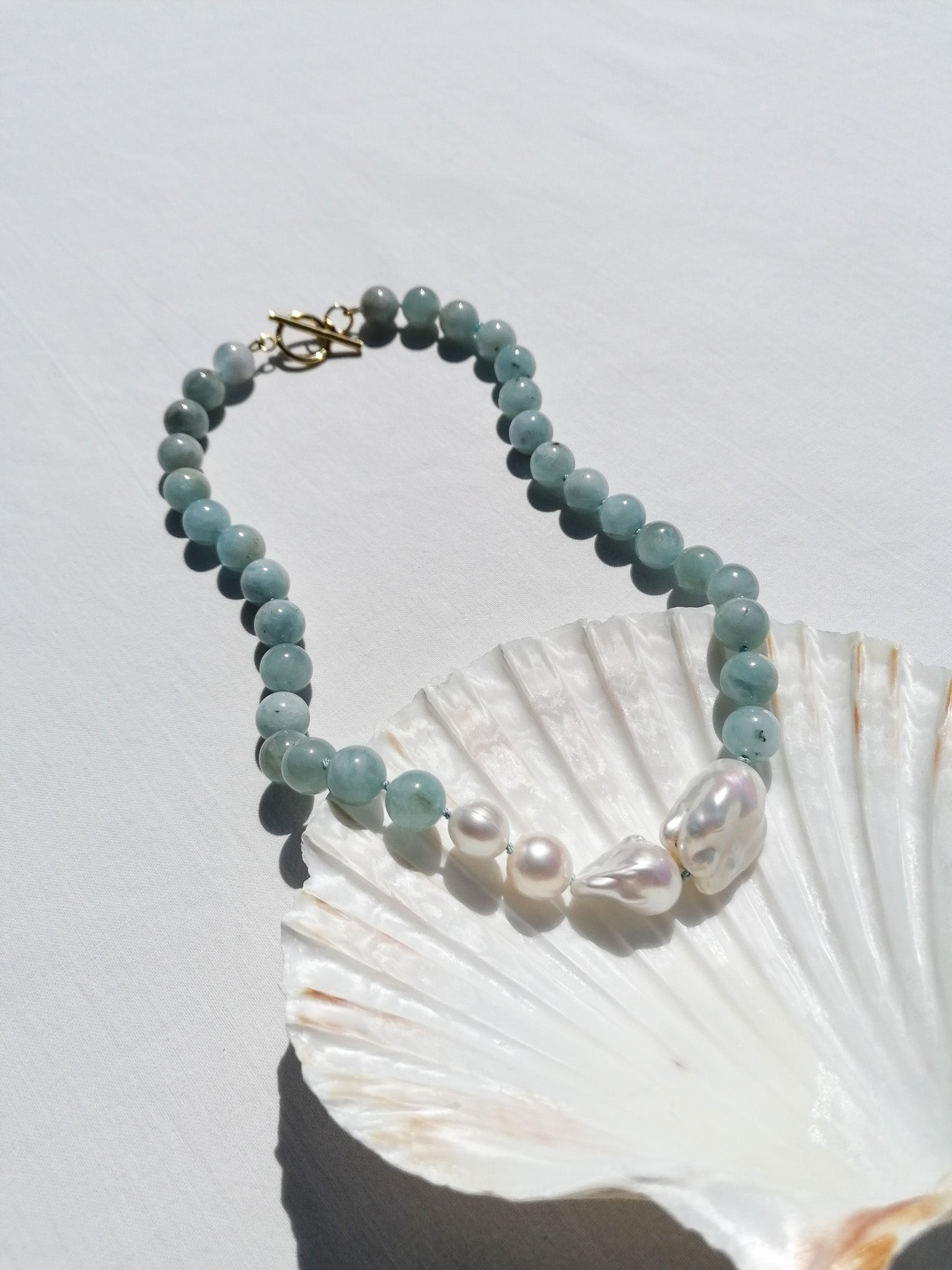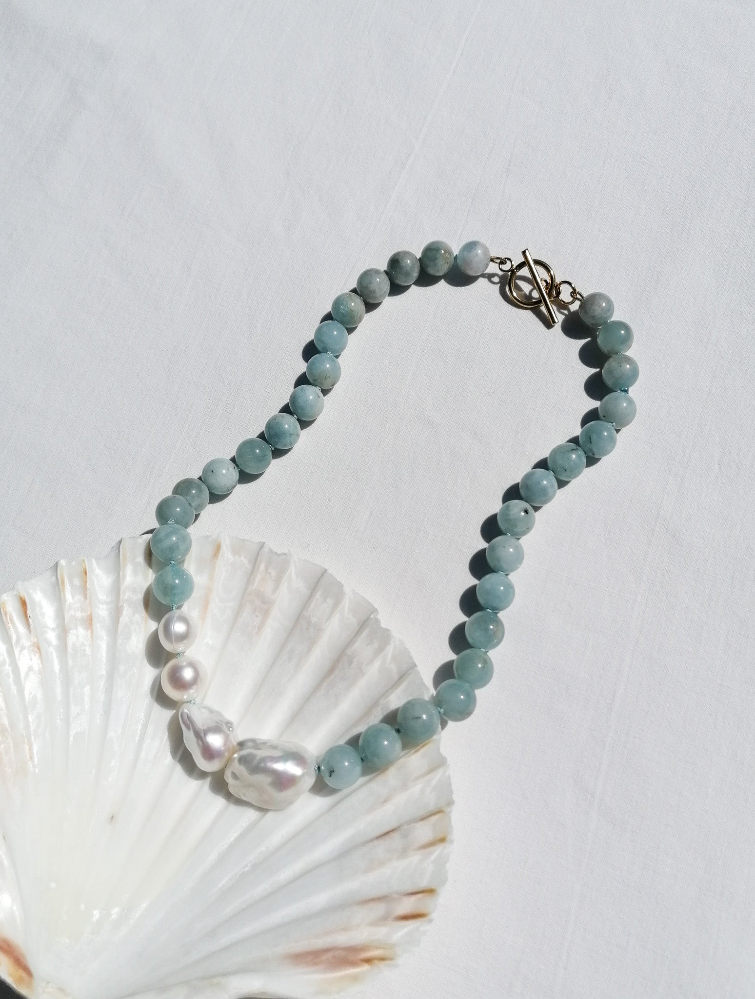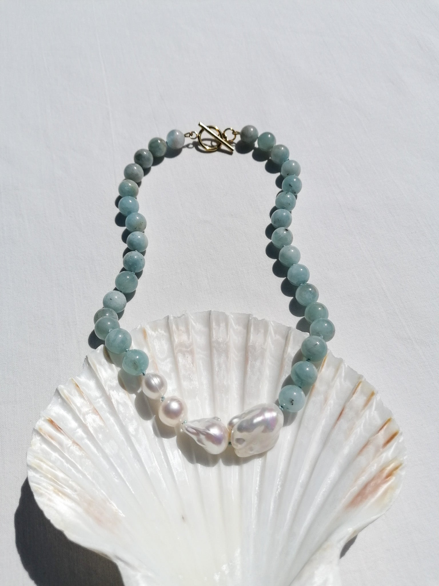 Asymmetrical necklace made of aquamarine and white freshwater baroque pearls