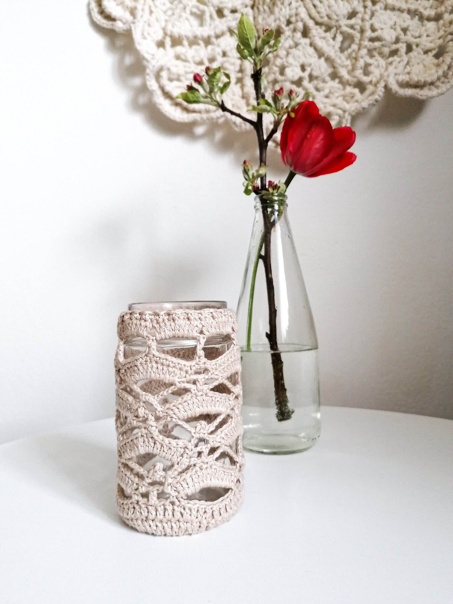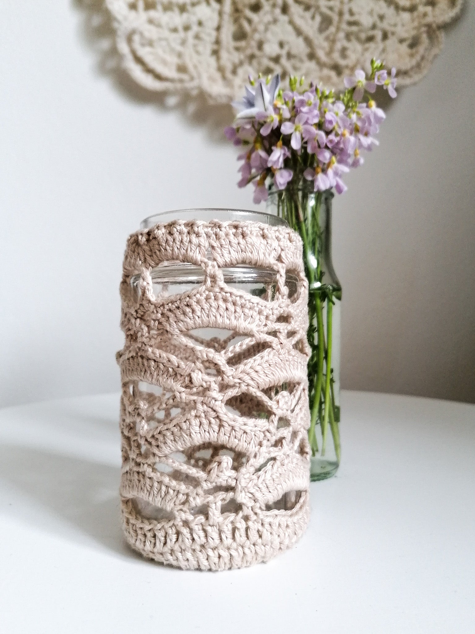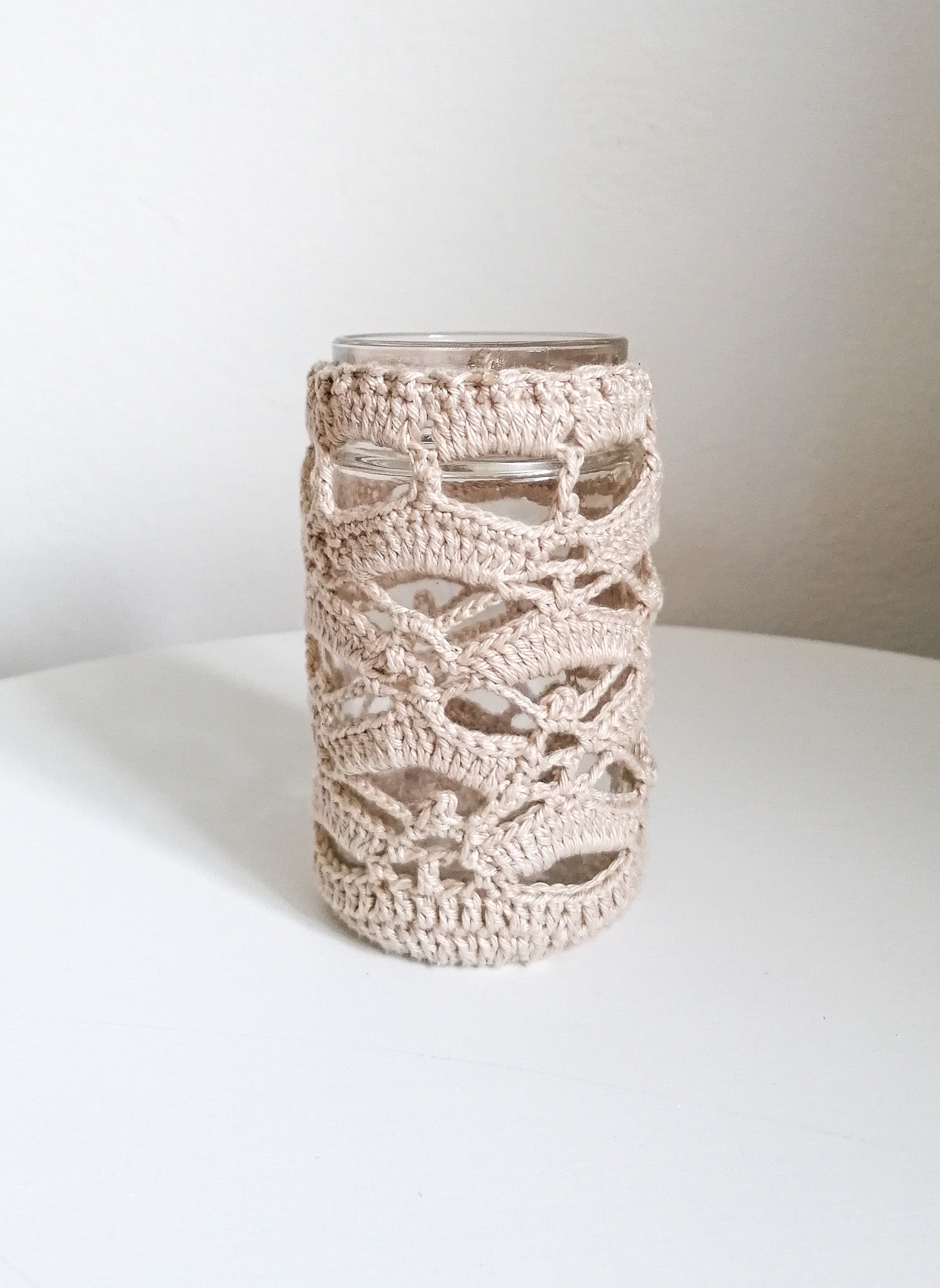 The crocheted cover can be removed and washed, and the glass can be washed if necessary.