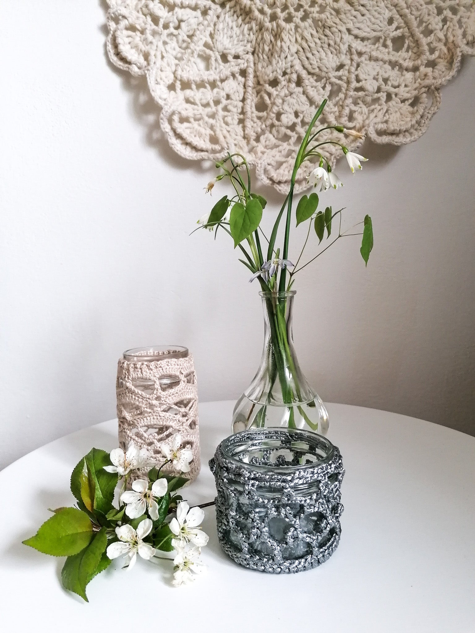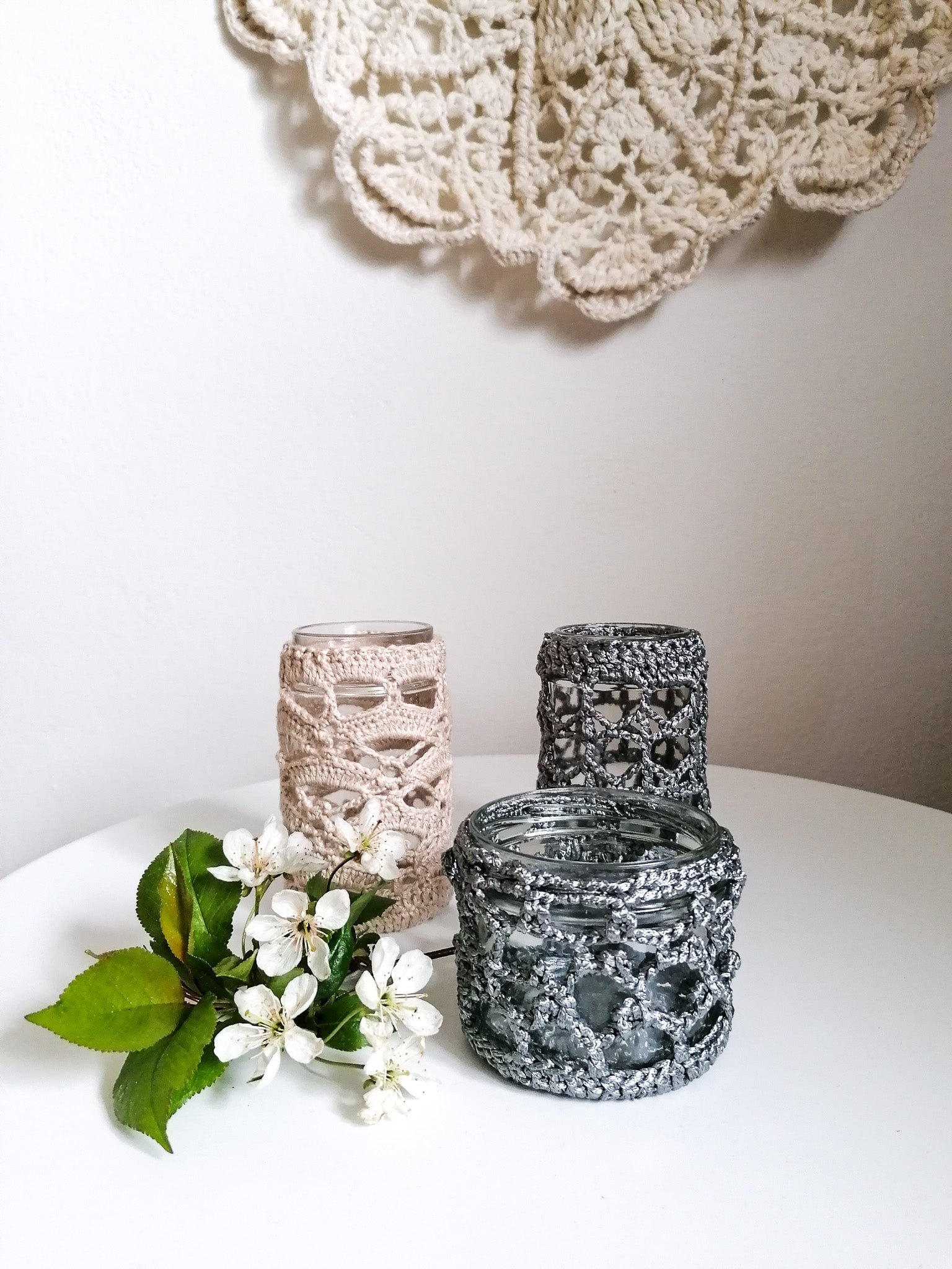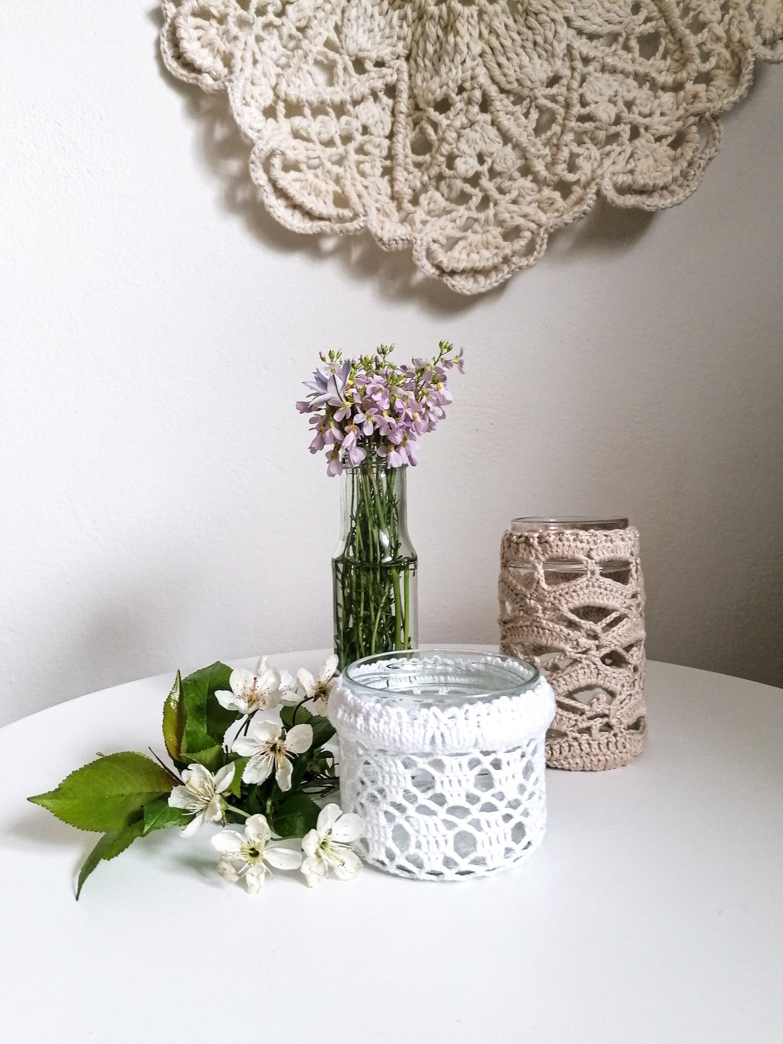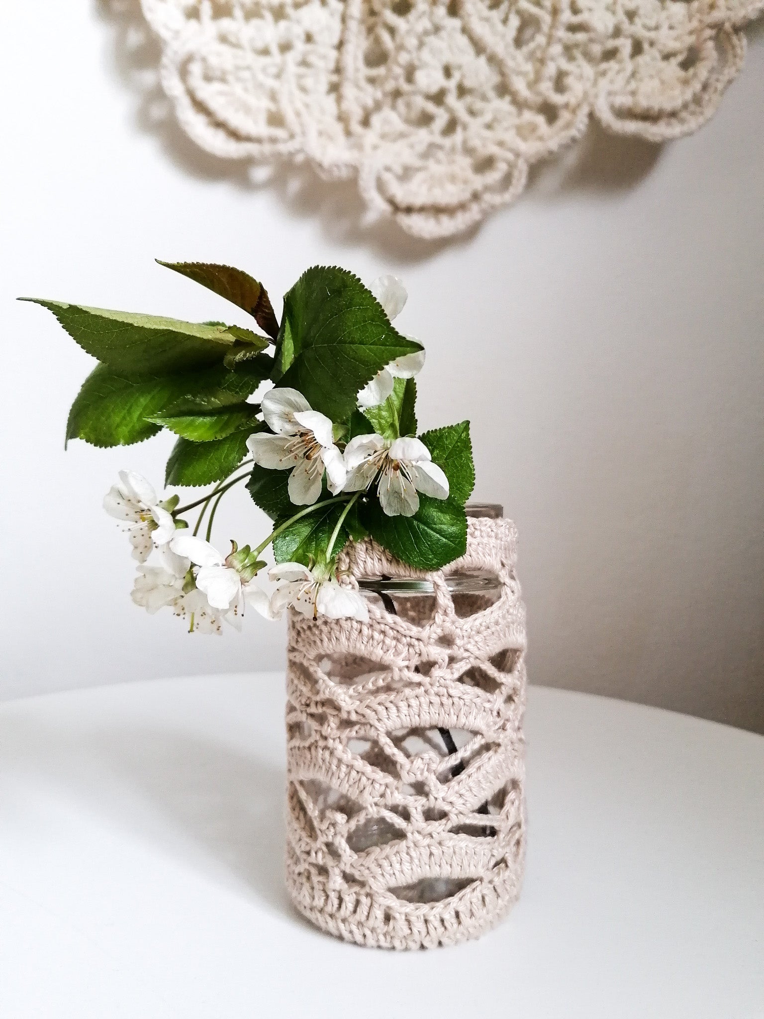 The crocheted cover can be removed and washed, and the glass can be washed if necessary.