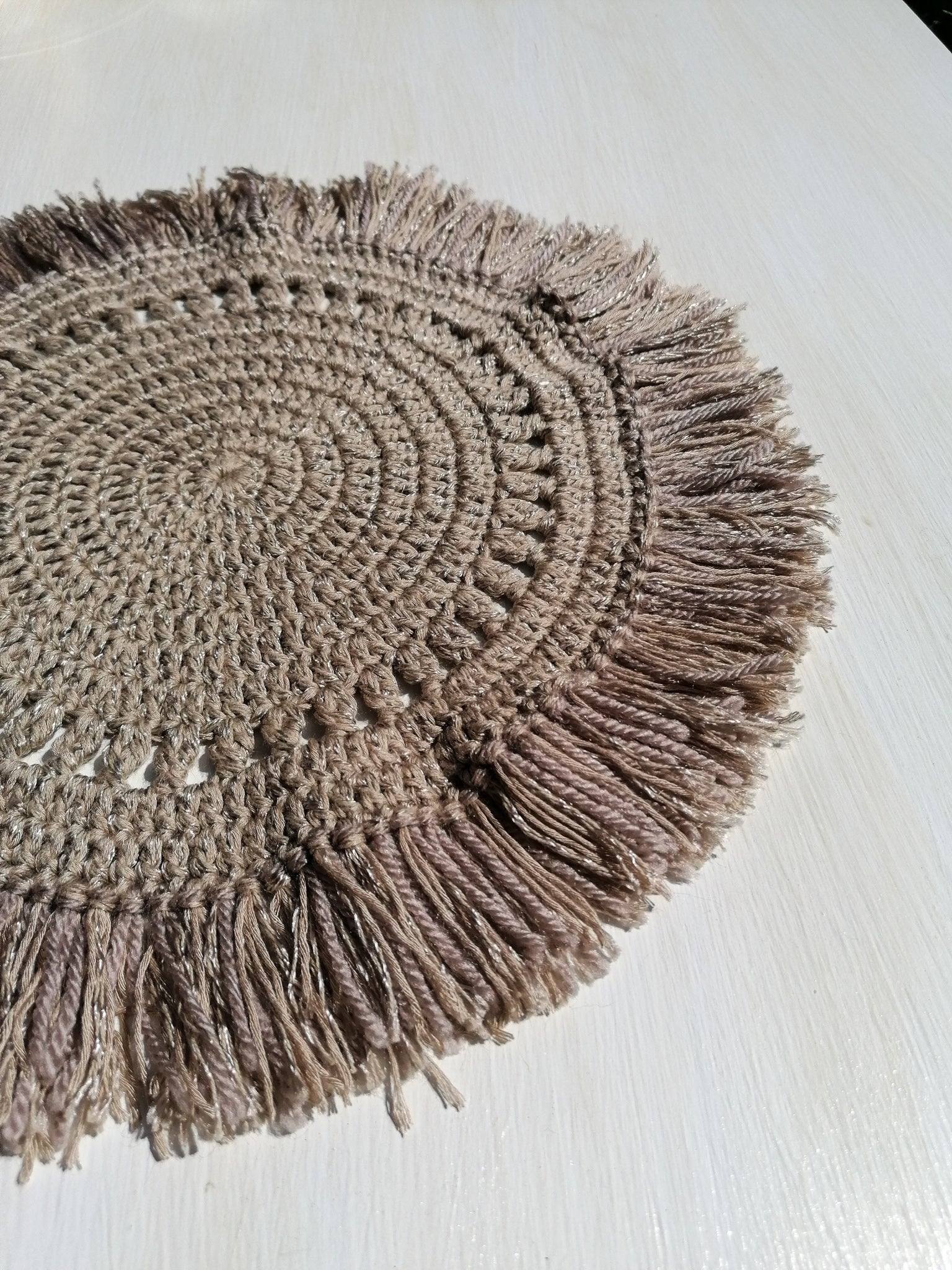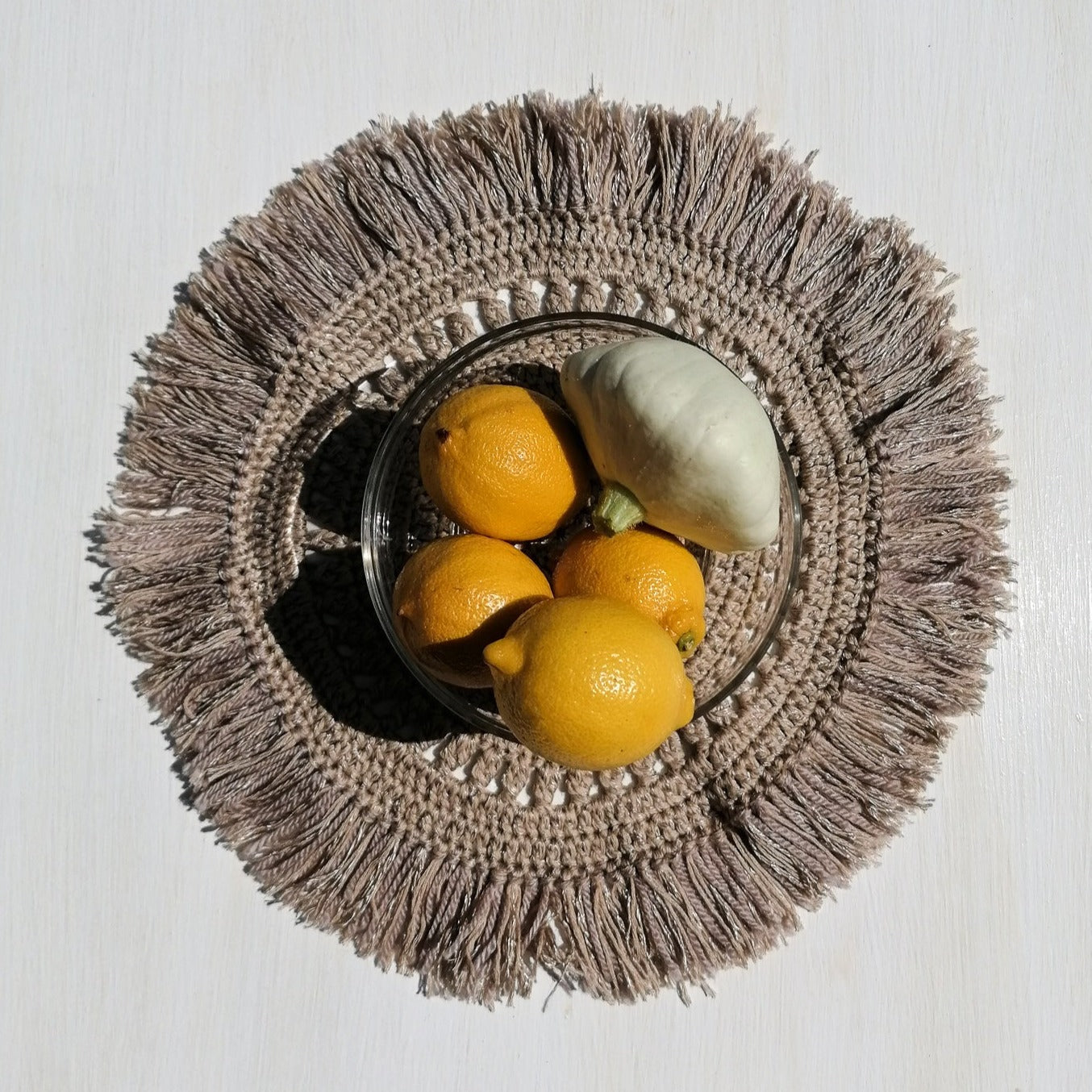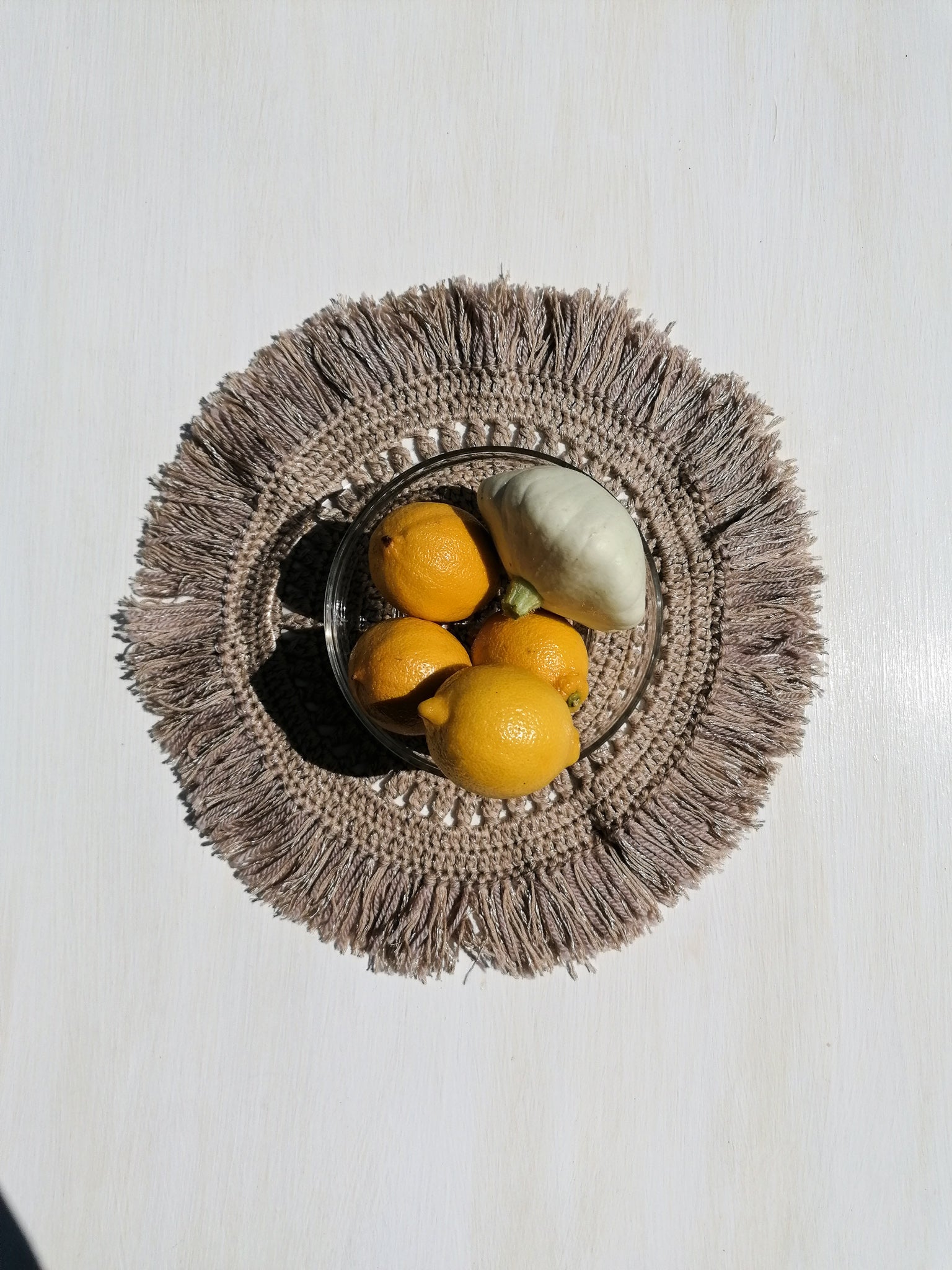 A crocheted blanket in a cool brown (or dark beige) color is great as a single placemat (for those who like to mix colors and shapes on the table), under a flower, vase, or bowl with decoration.