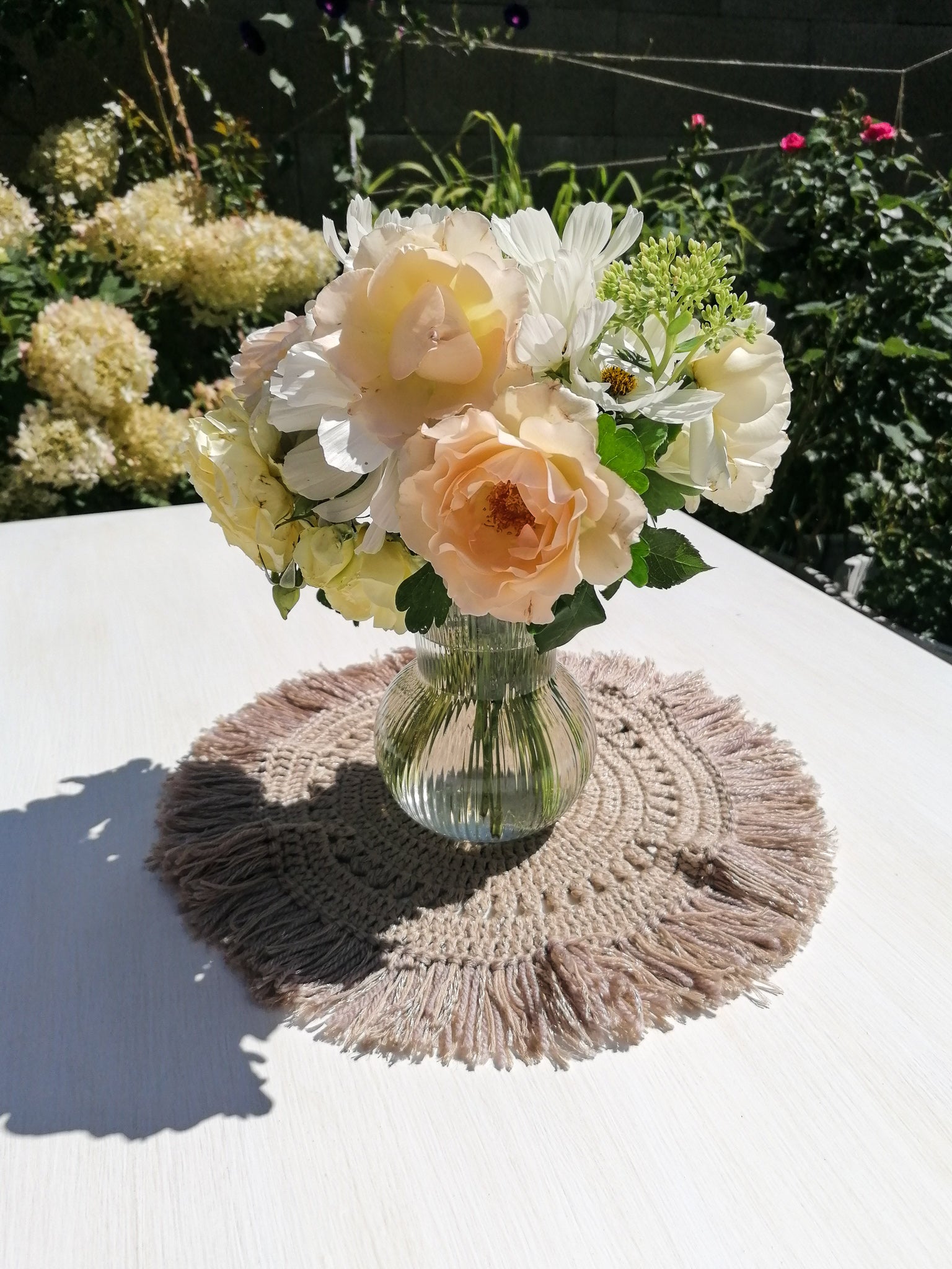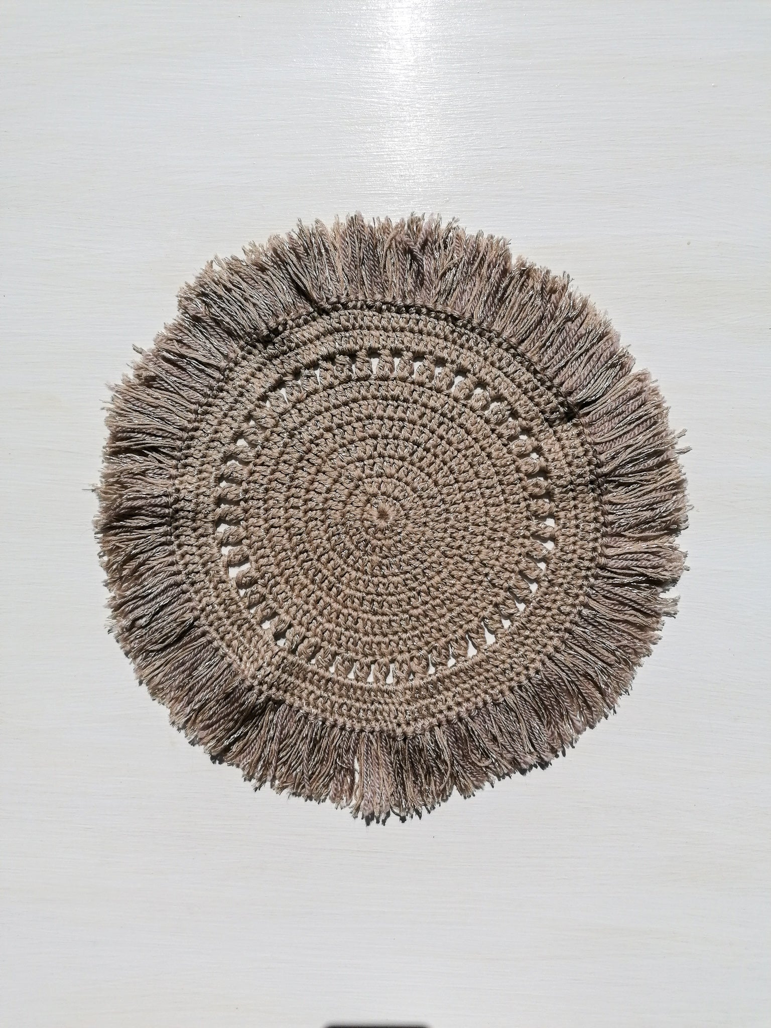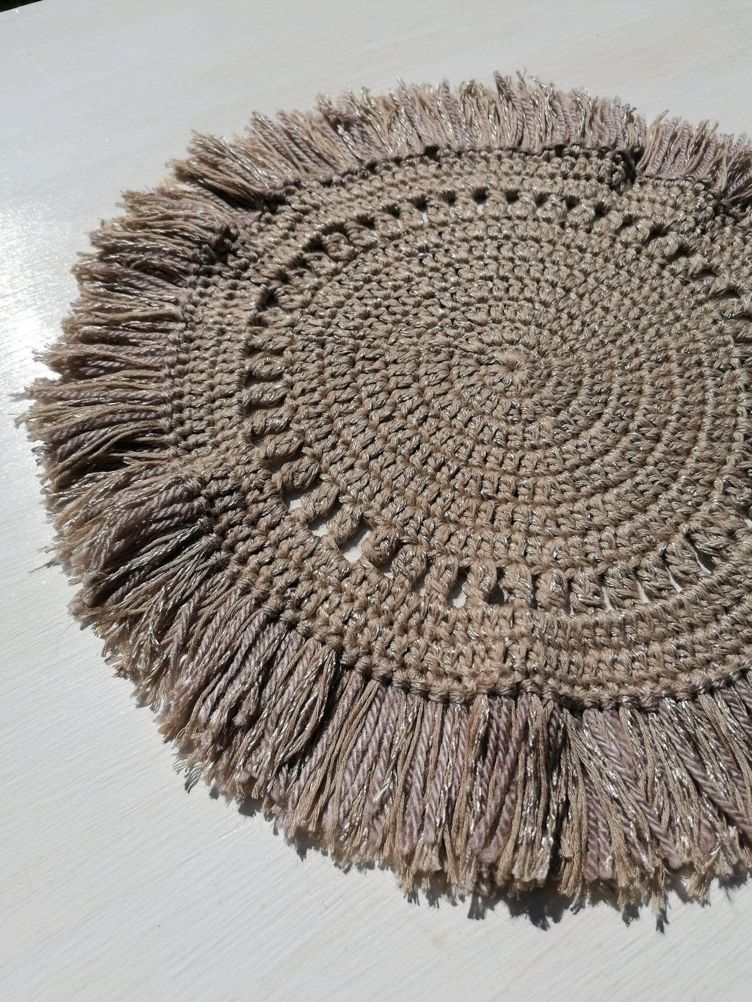 A crocheted blanket in a cool brown (or dark beige) color is great as a single placemat (for those who like to mix colors and shapes on the table), under a flower, vase, or bowl with decoration.