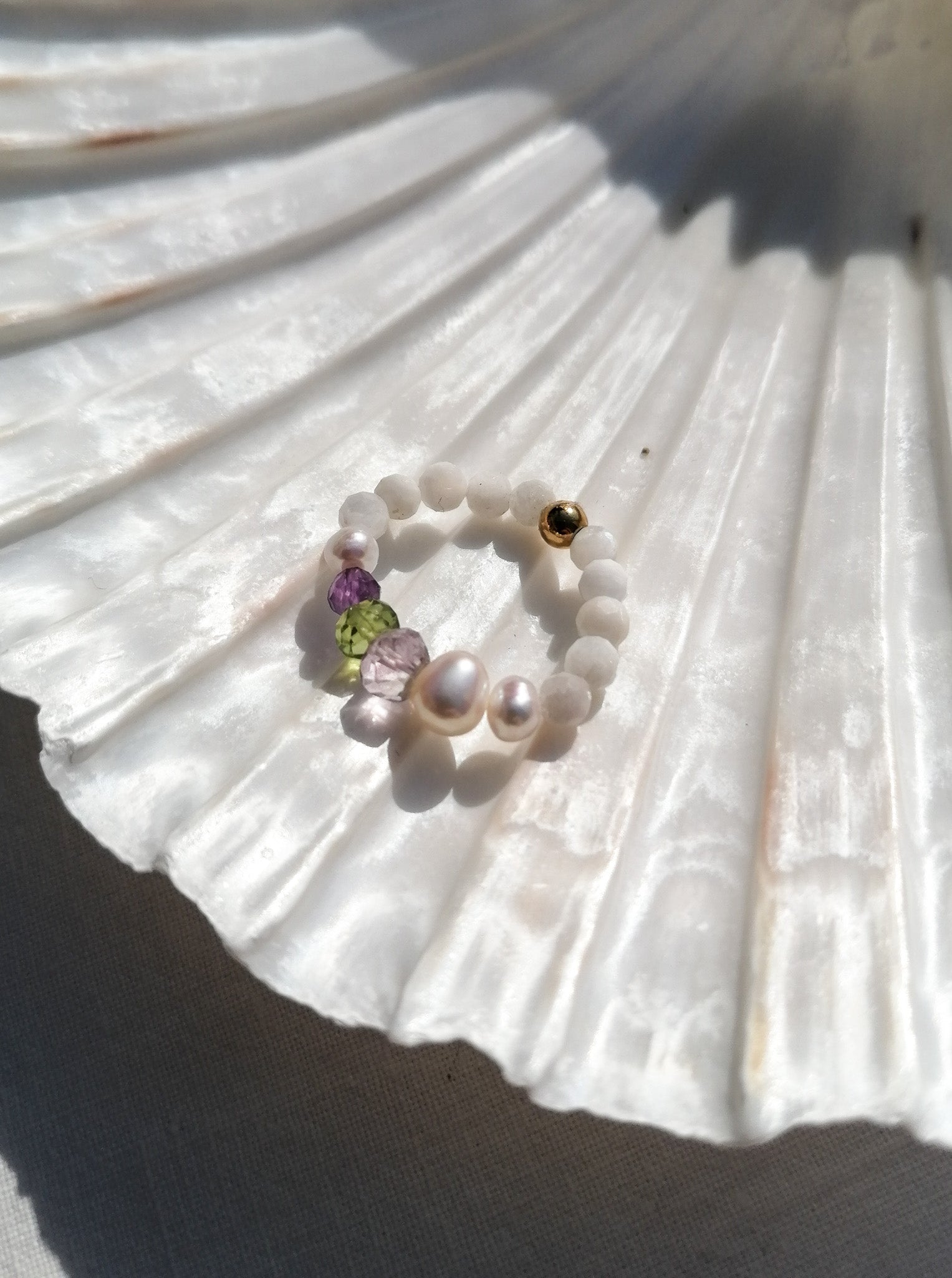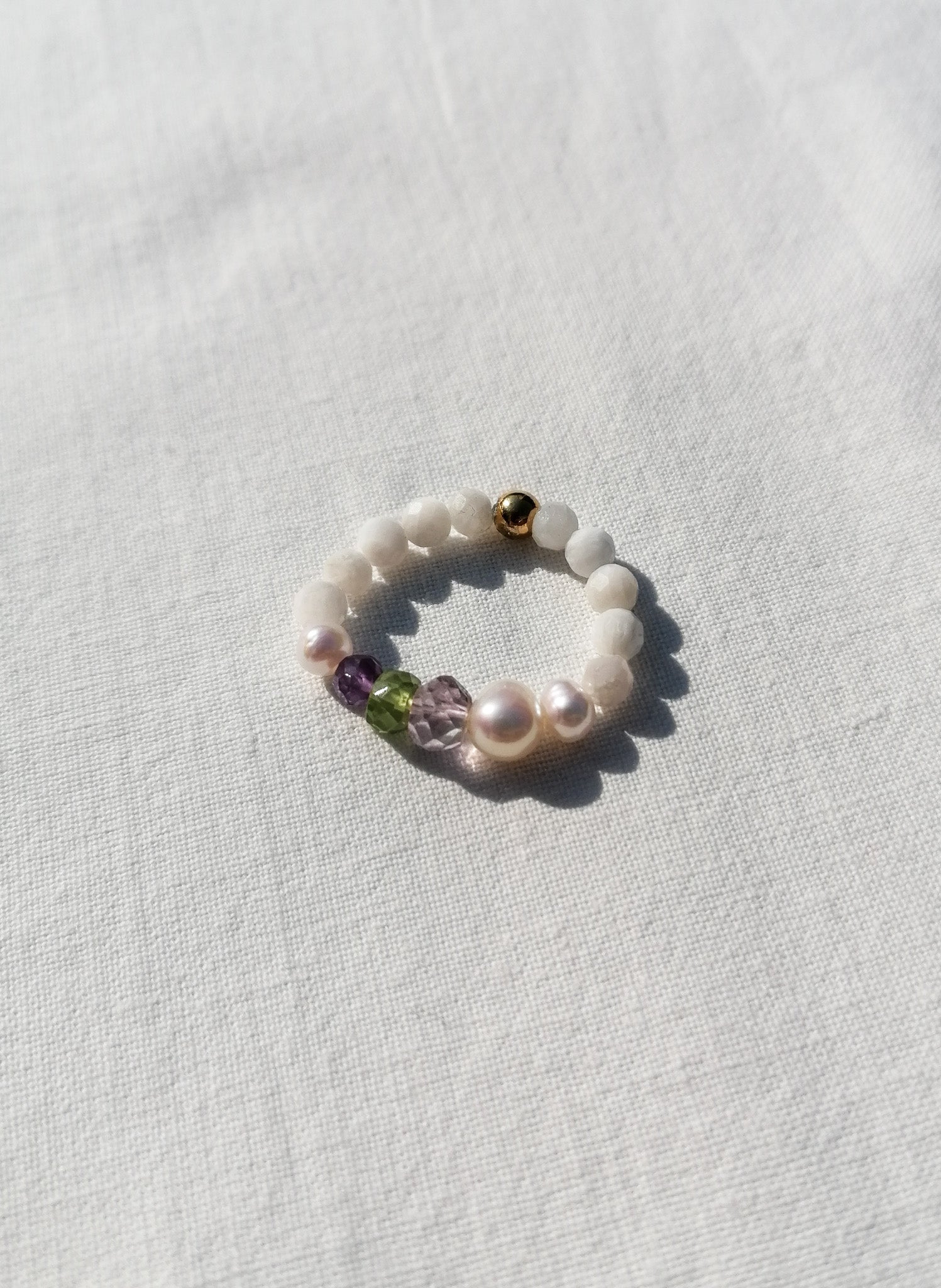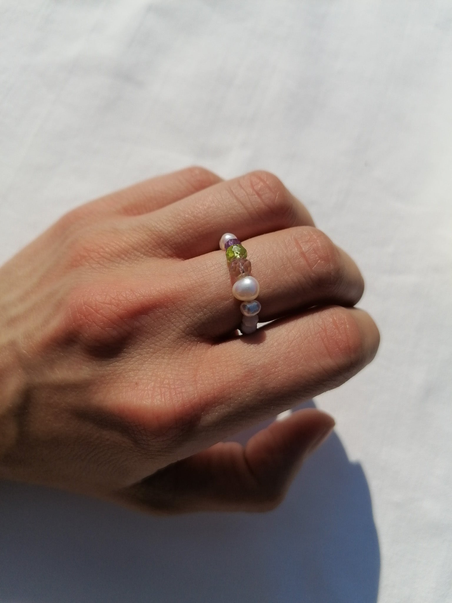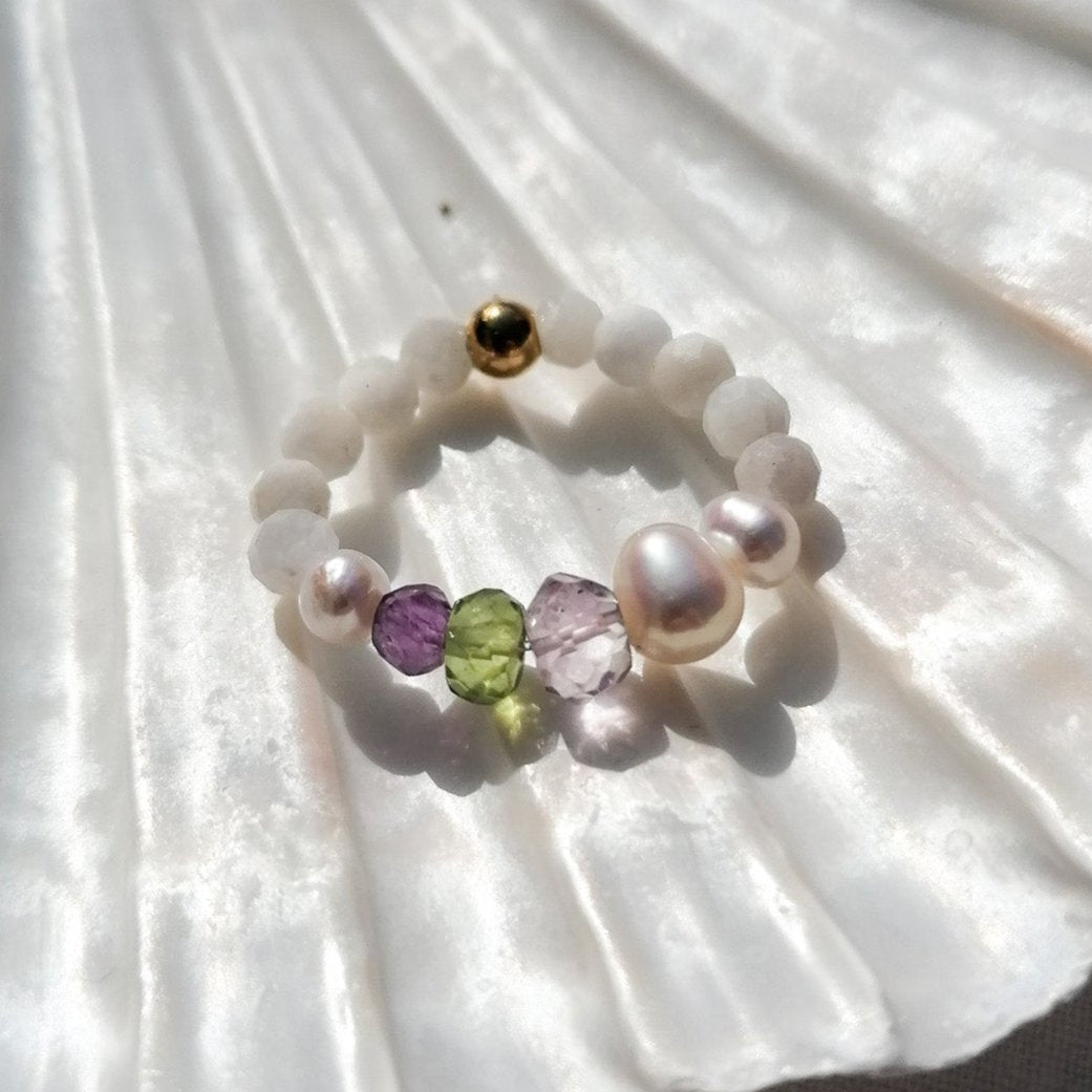 Elastic ring made of freshwater pearls, cut amethyst, peridot, moonstone beads and stainless steel