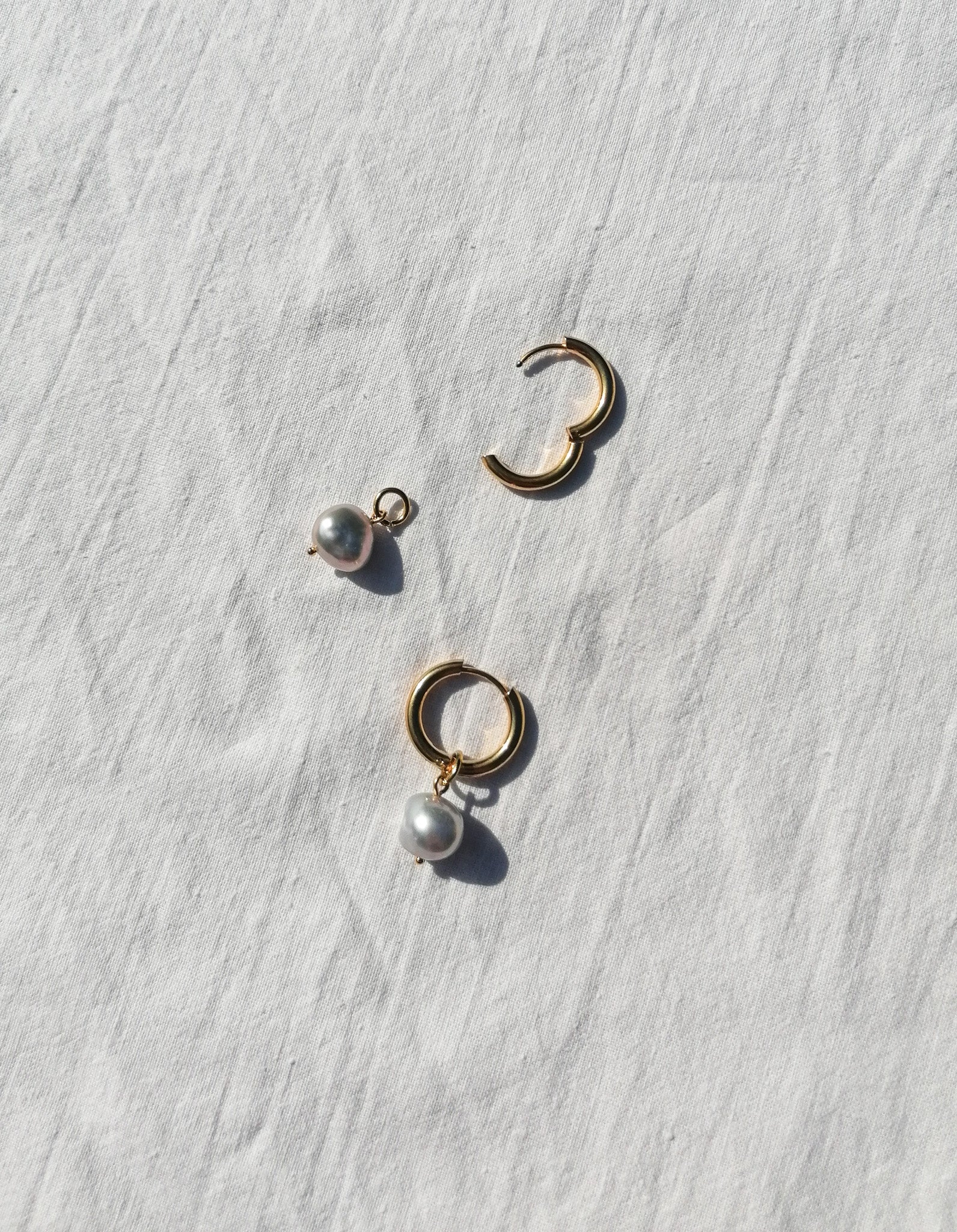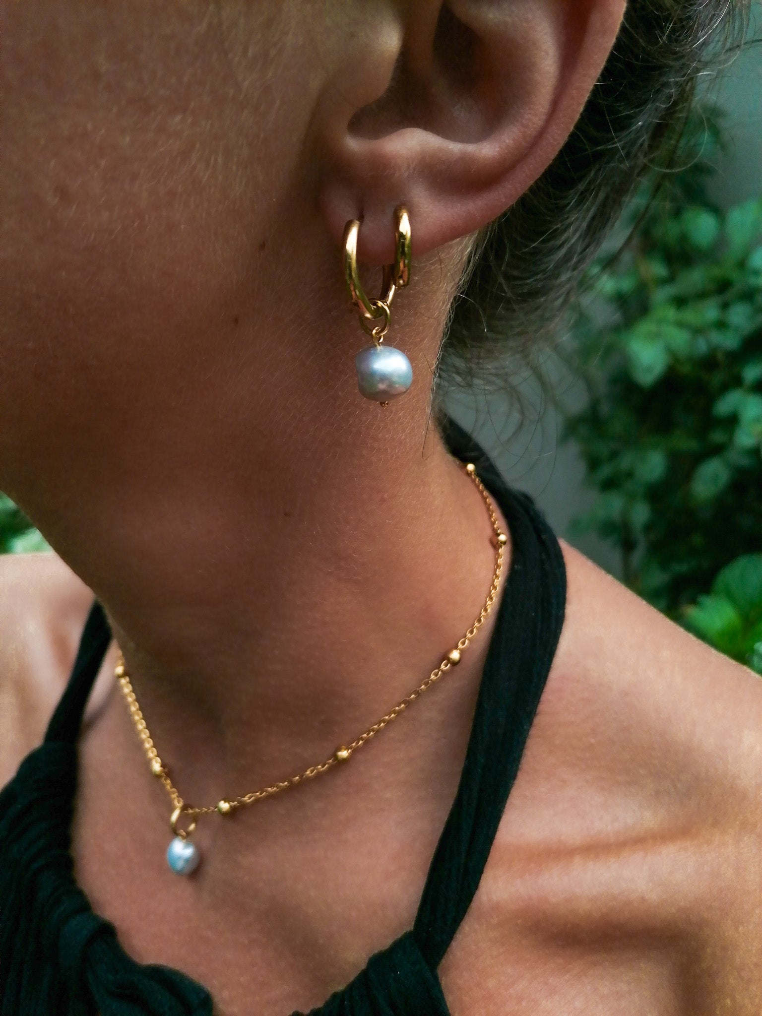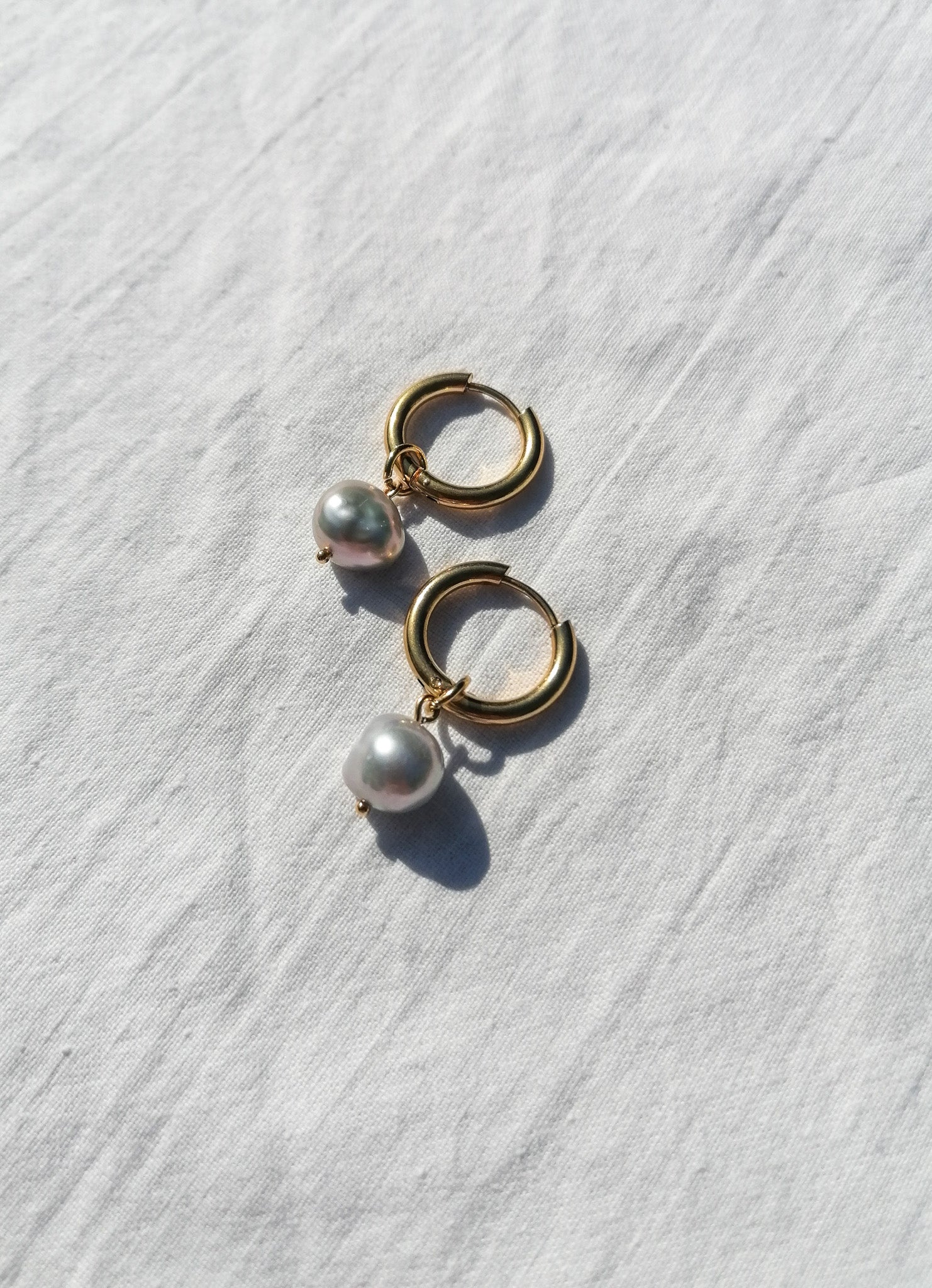 Gray baroque pearl charms on waterproof gold stainless steel hoops
