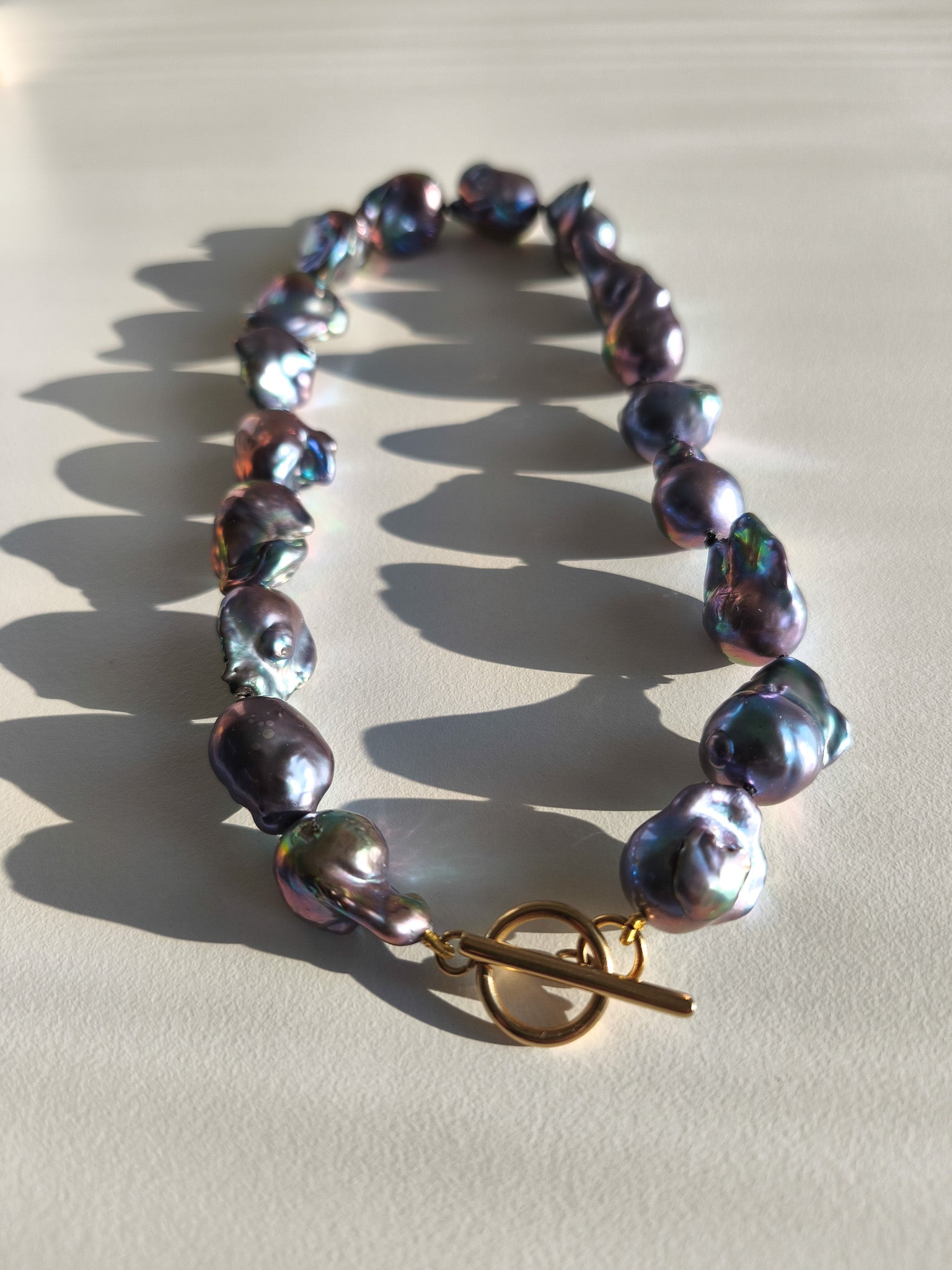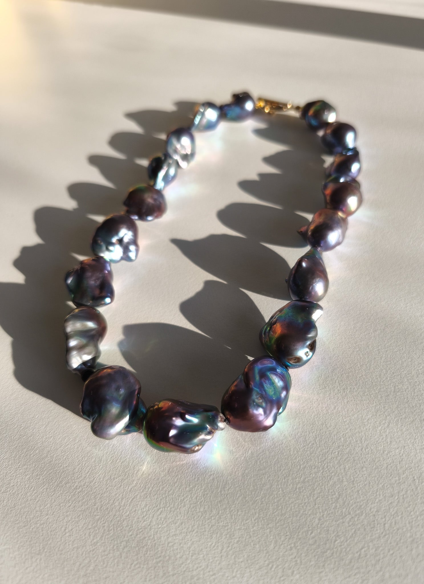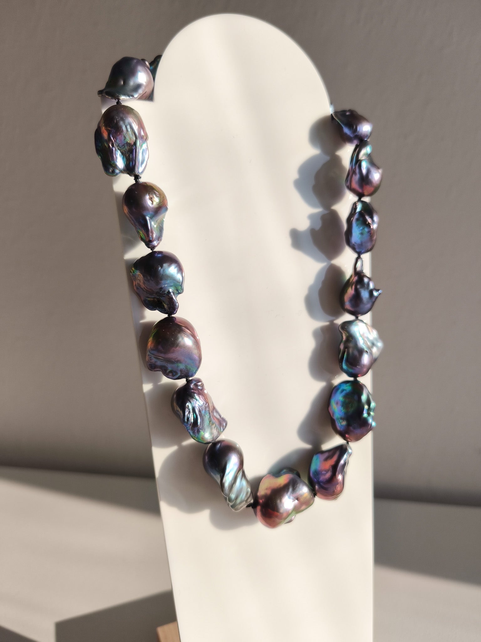 A unique necklace made of large baroque "flameball" pearls, the color is black/blue with reflections in the colors of peacock feathers