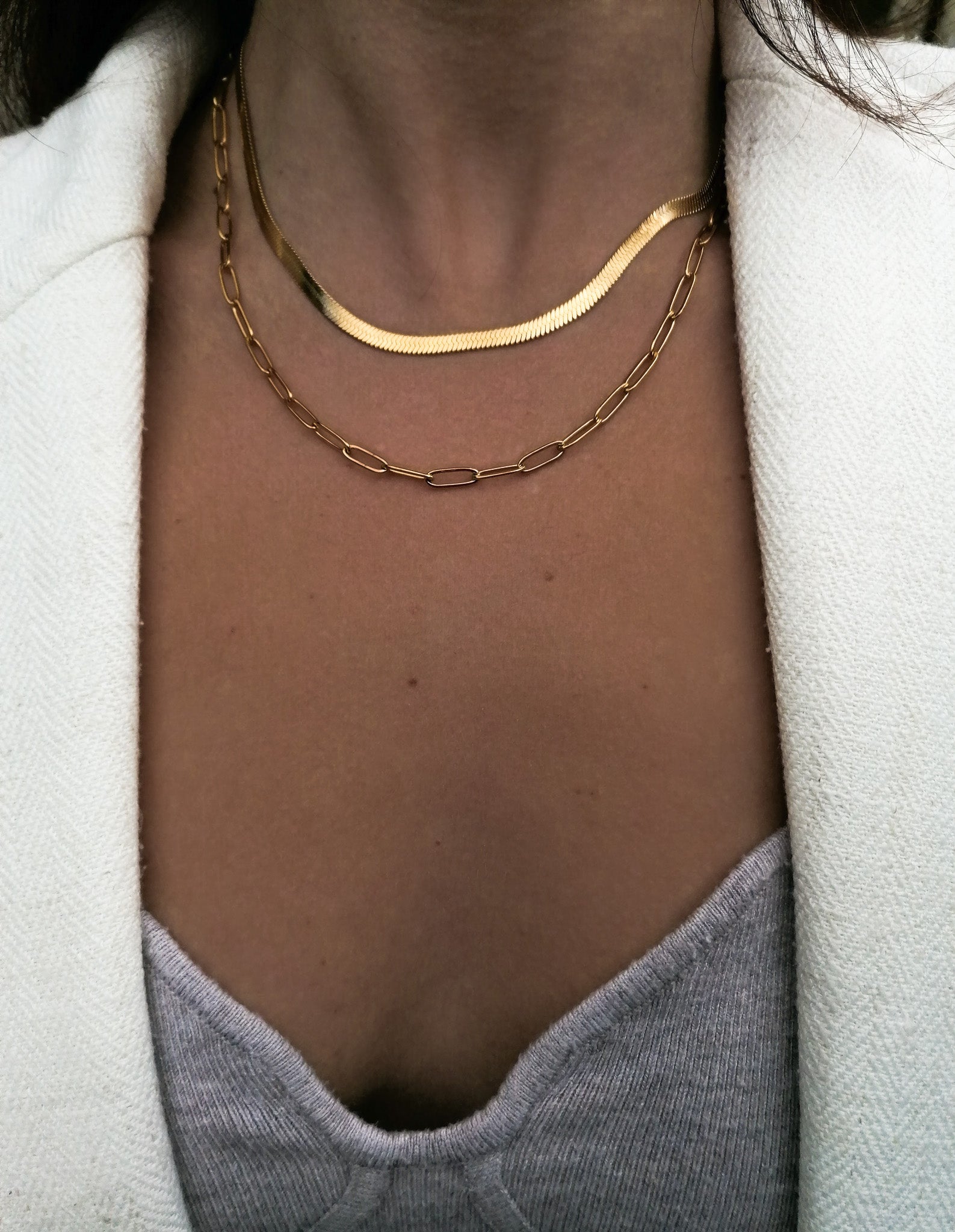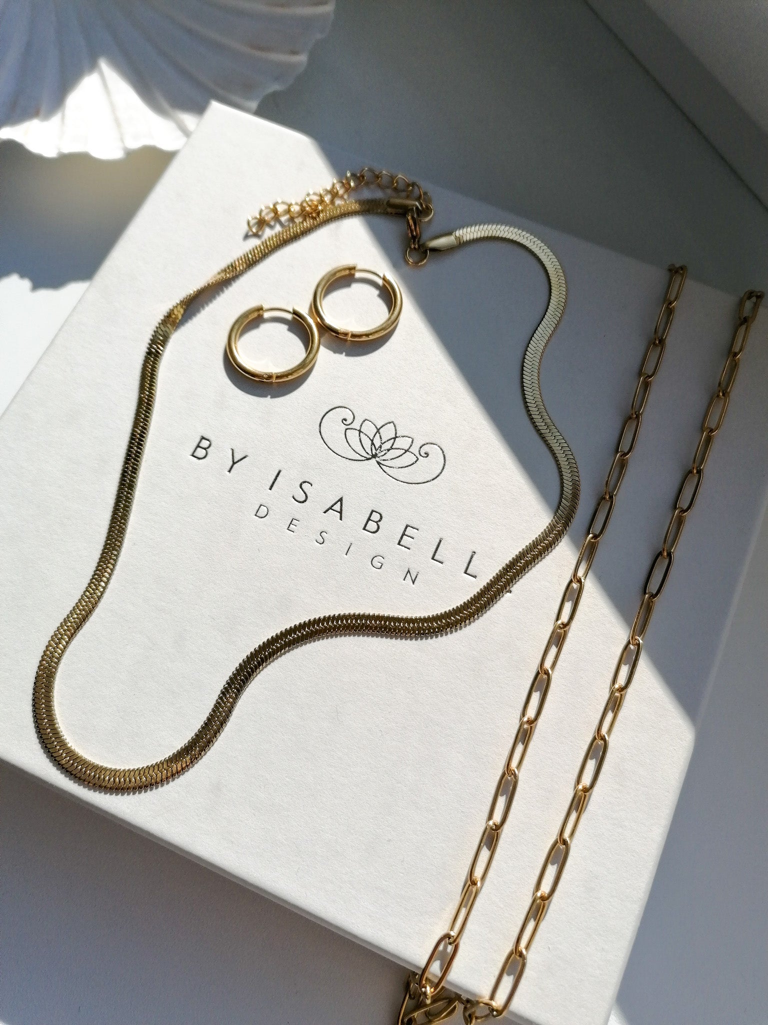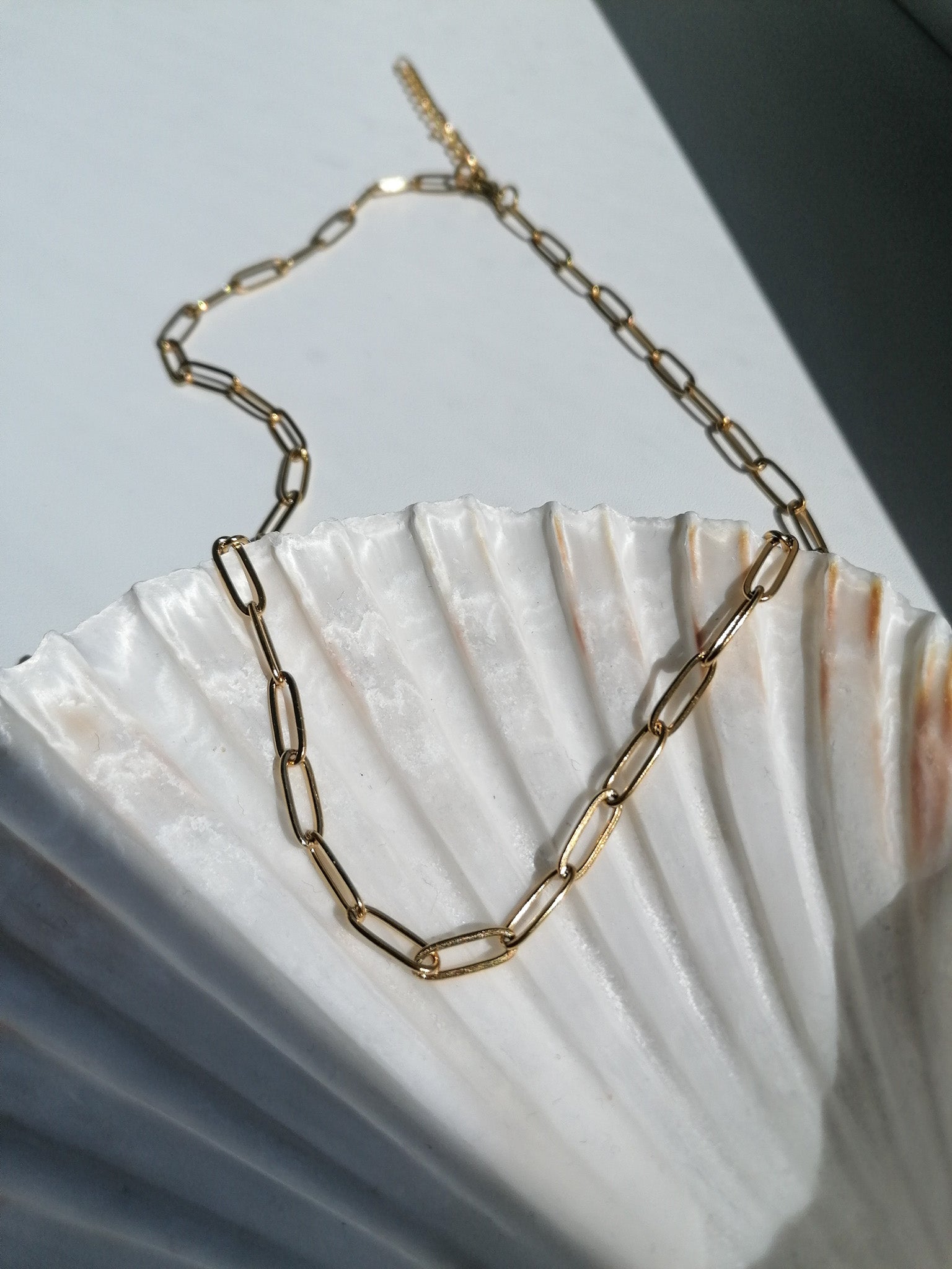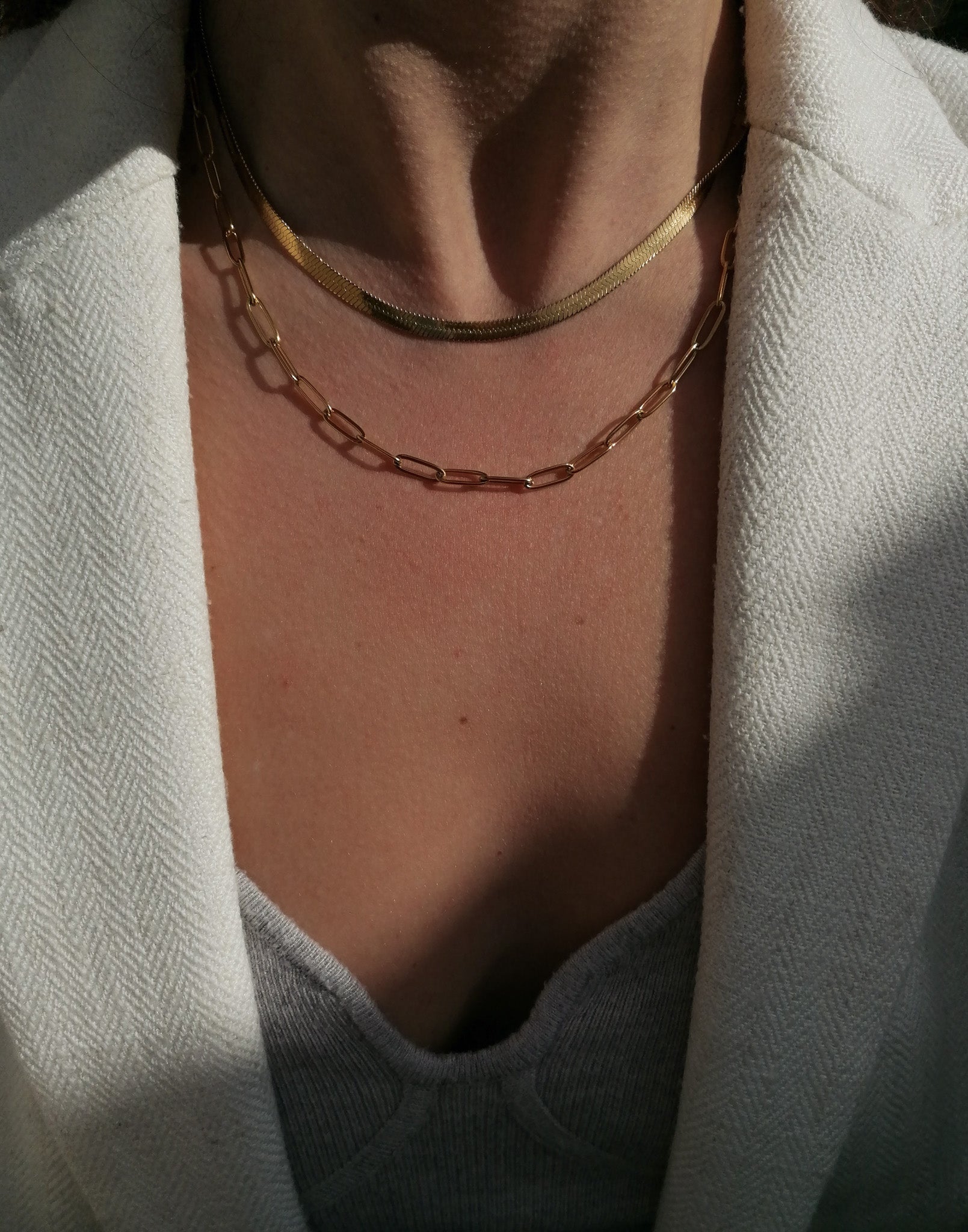 The base metal of our jewelry is stainless steel, which is why the resulting color is a little darker, not completely bright, as with gold-plated brass (a gold filled) or silver.