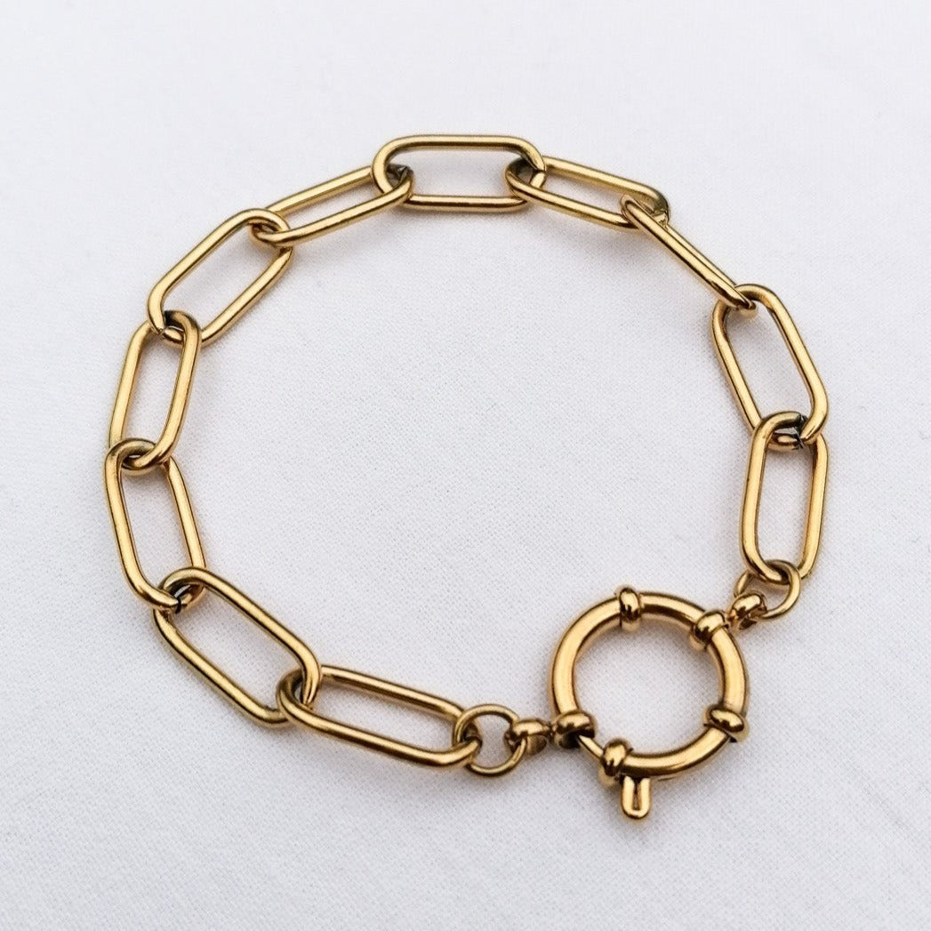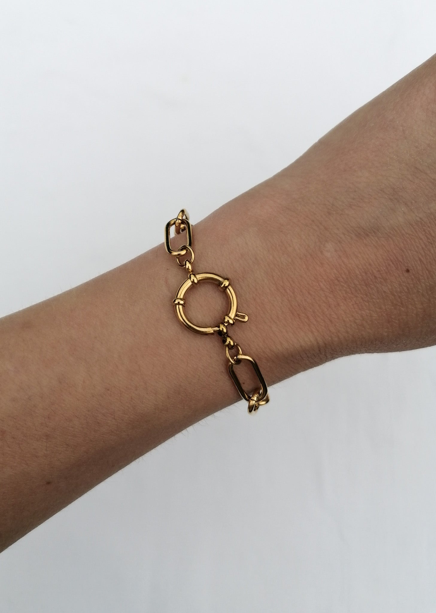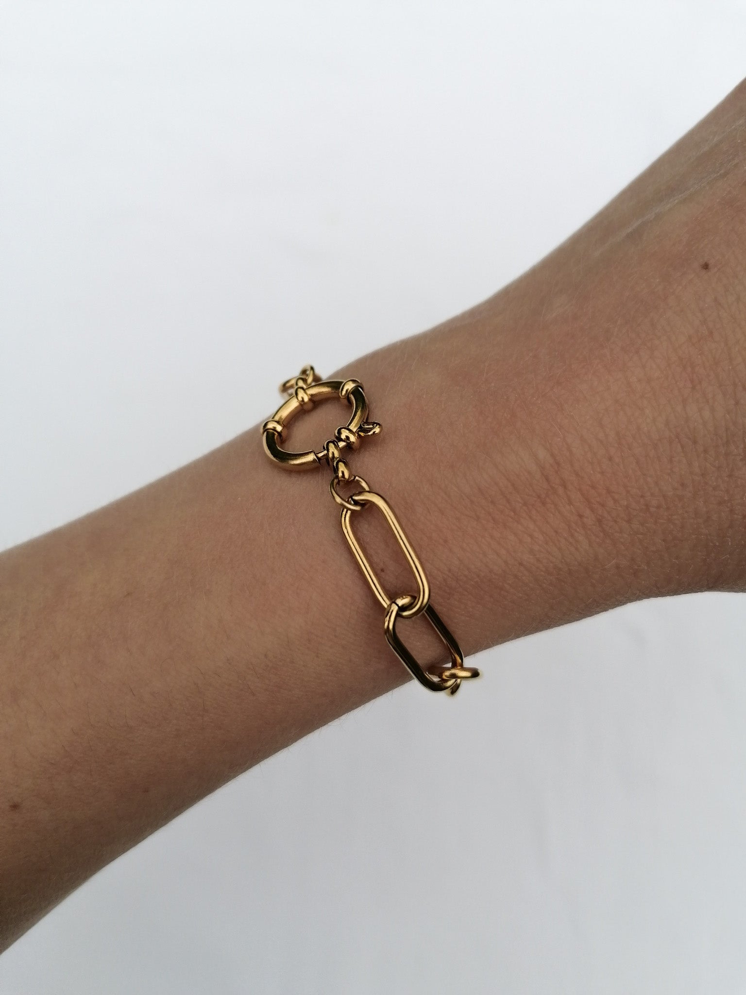 A striking bracelet made of a thicker link chain with a large navy clasp