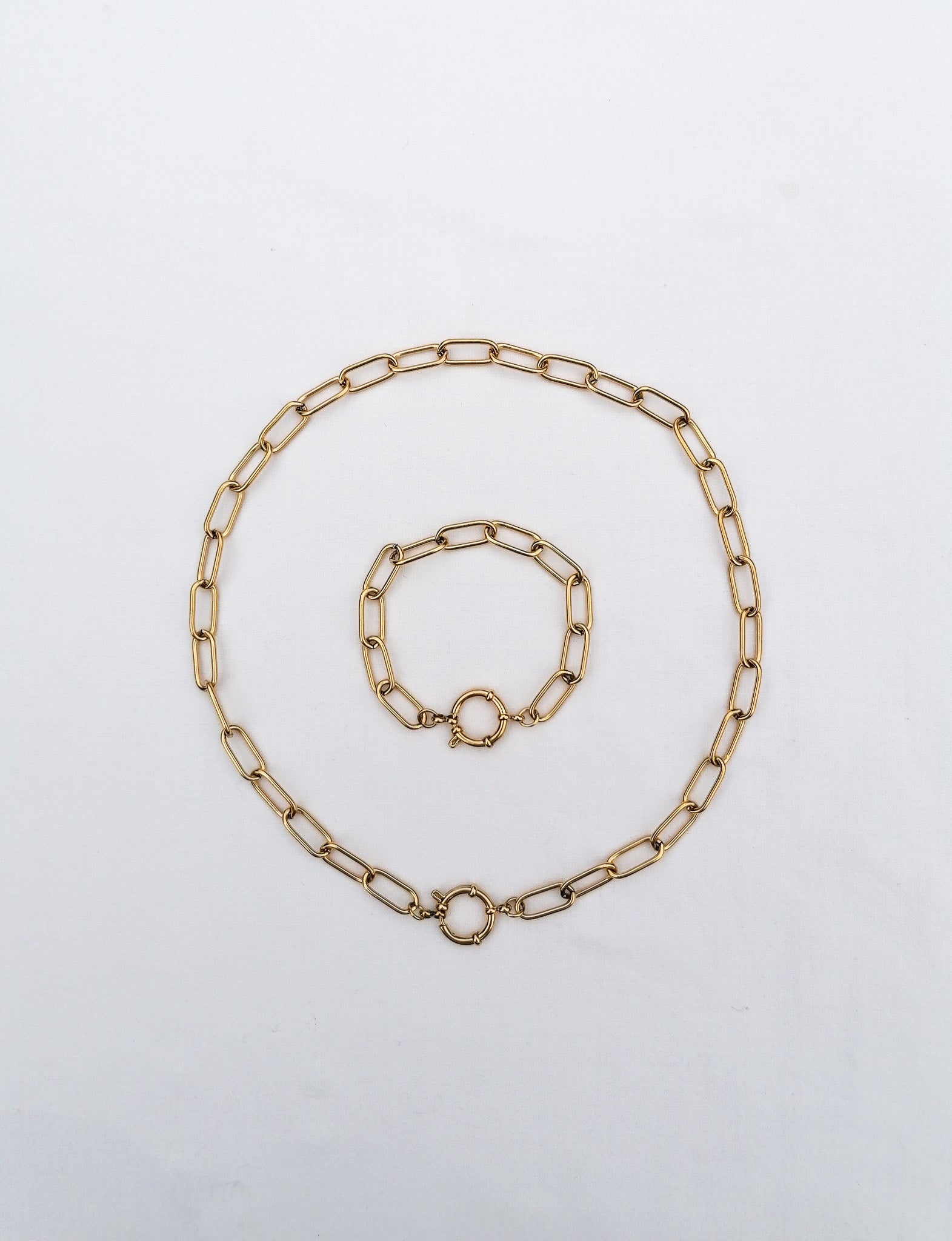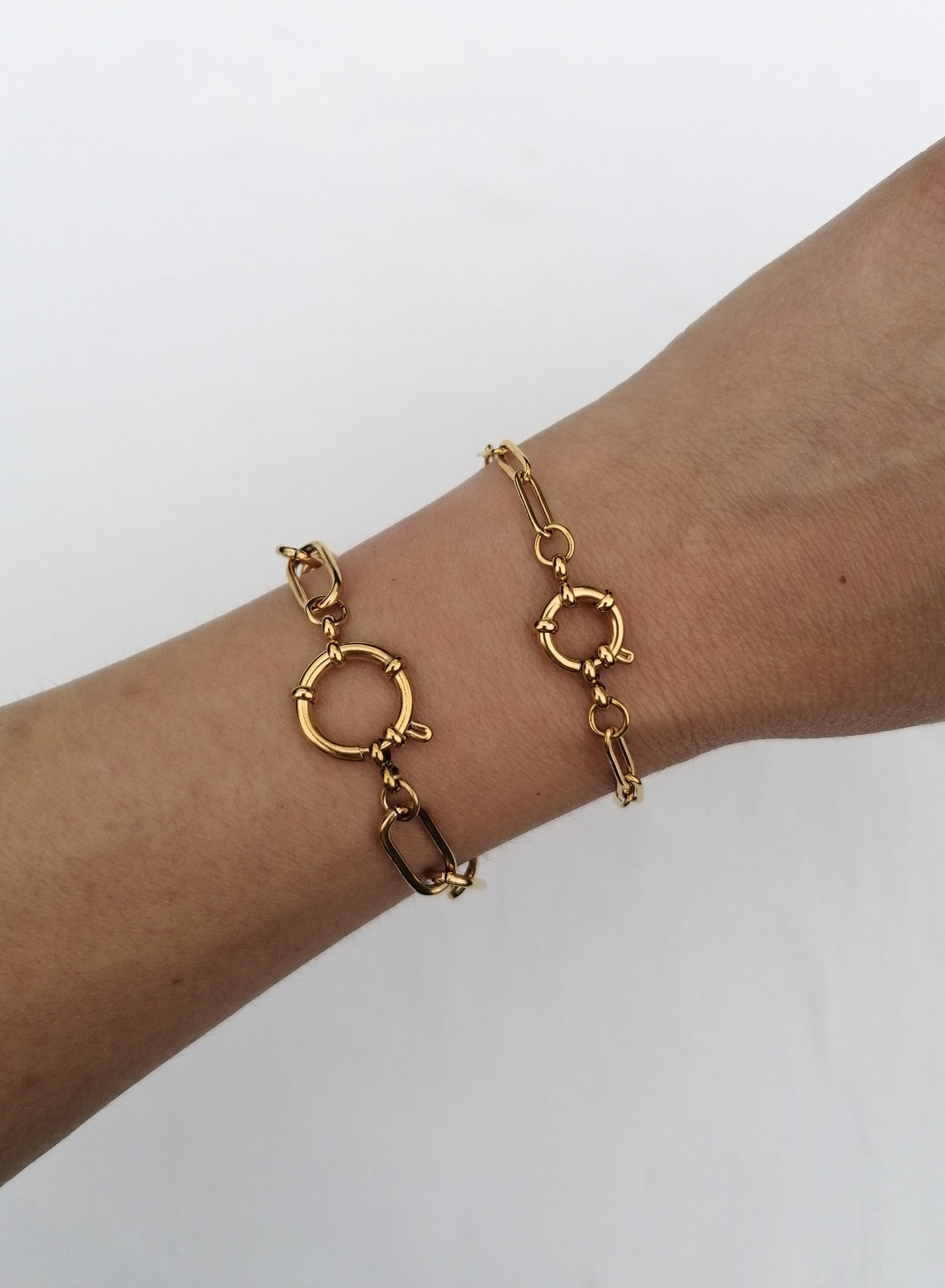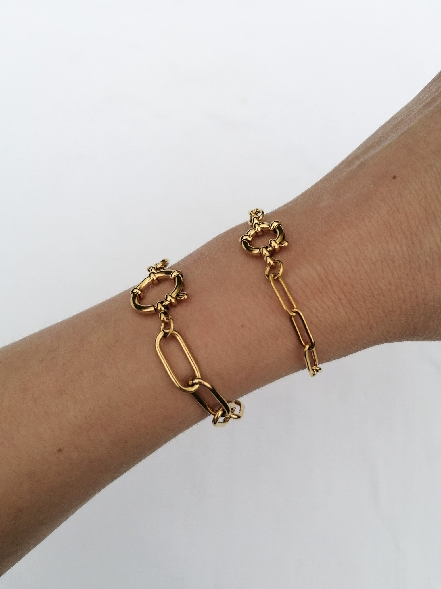 A striking bracelet made of a thicker link chain with a large navy clasp