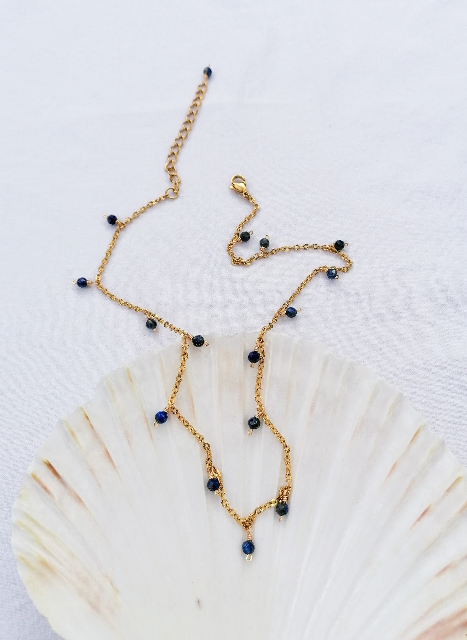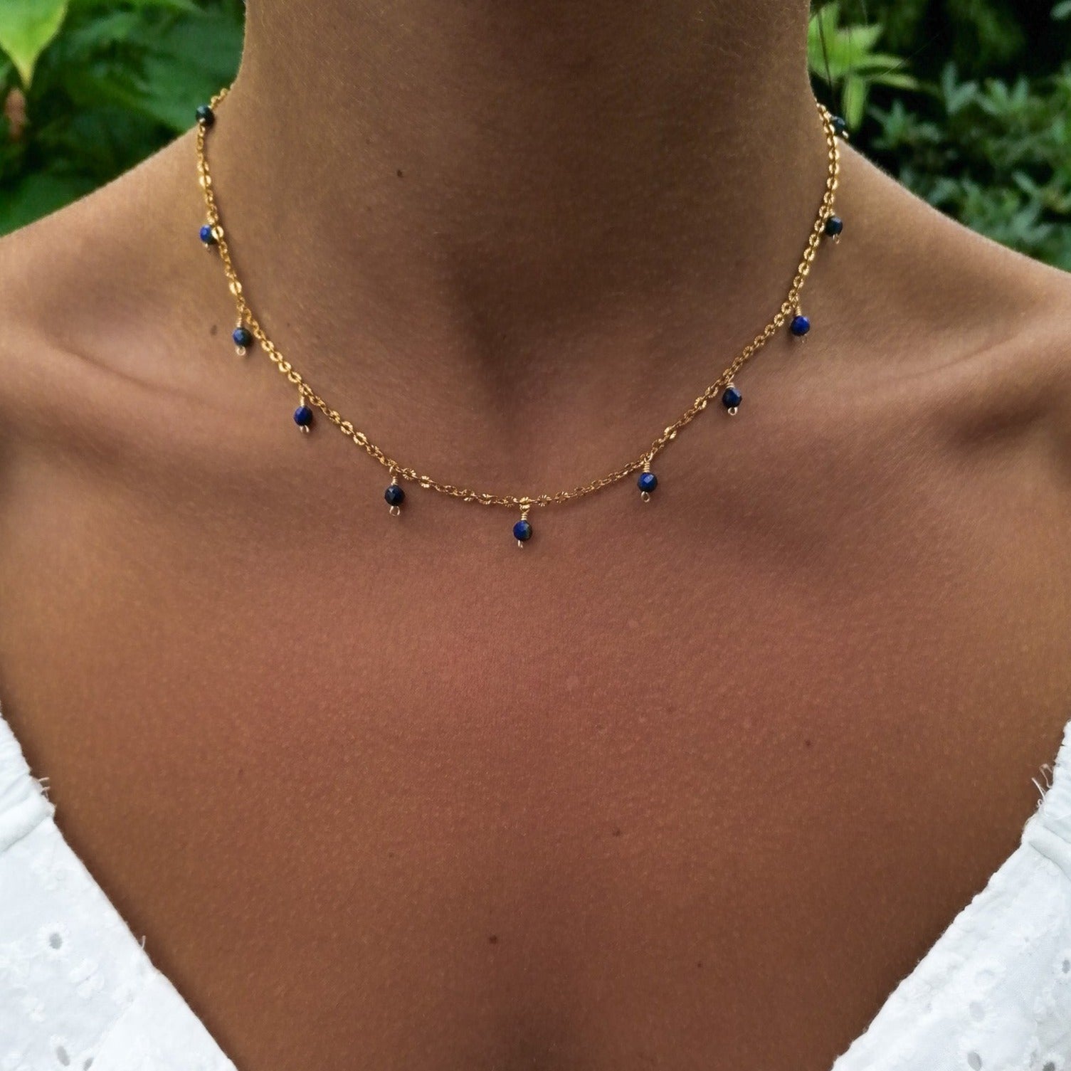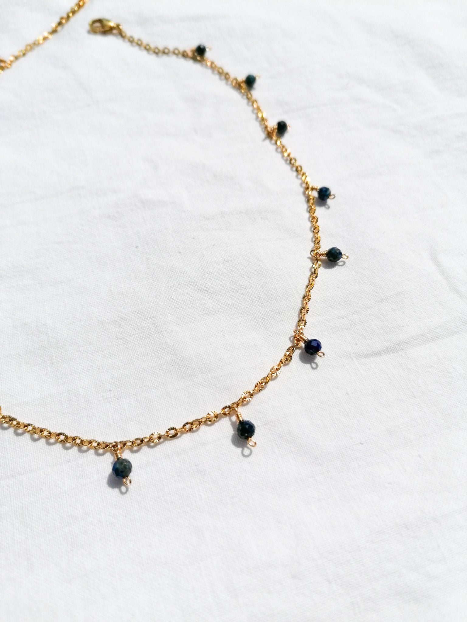 Thirteen cut lapis lazuli pendants on a glittering chain