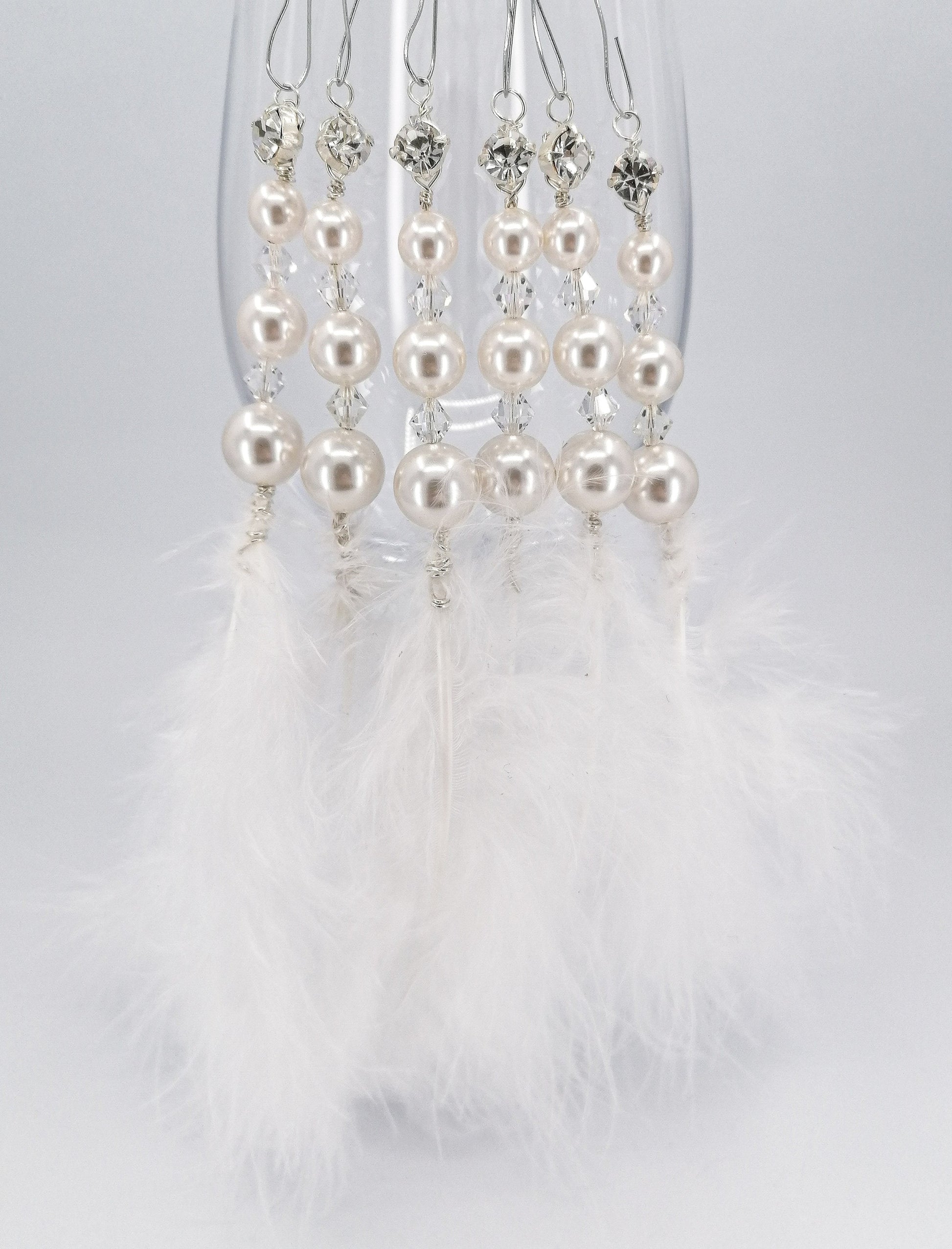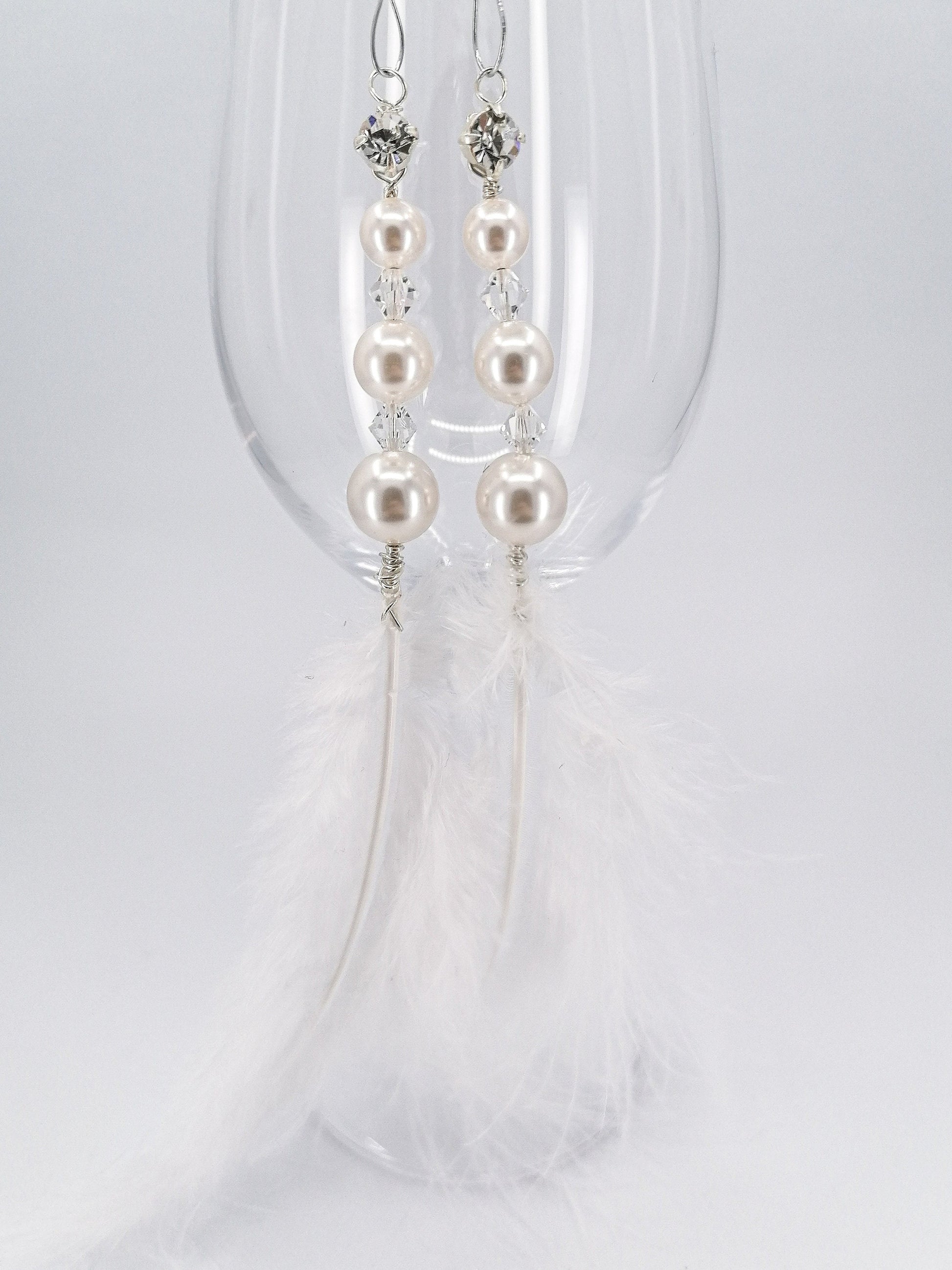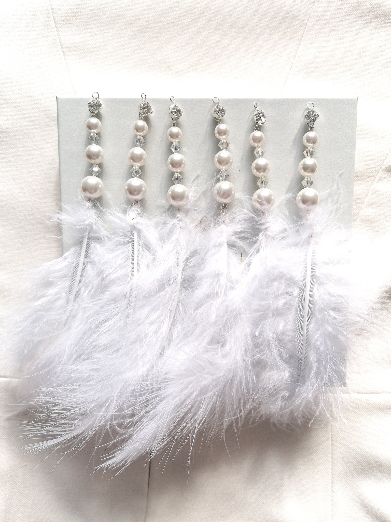 Long hanging Christmas ornaments handmade from Austrian glass beads, crystals, Preciosa stones and white feathers.