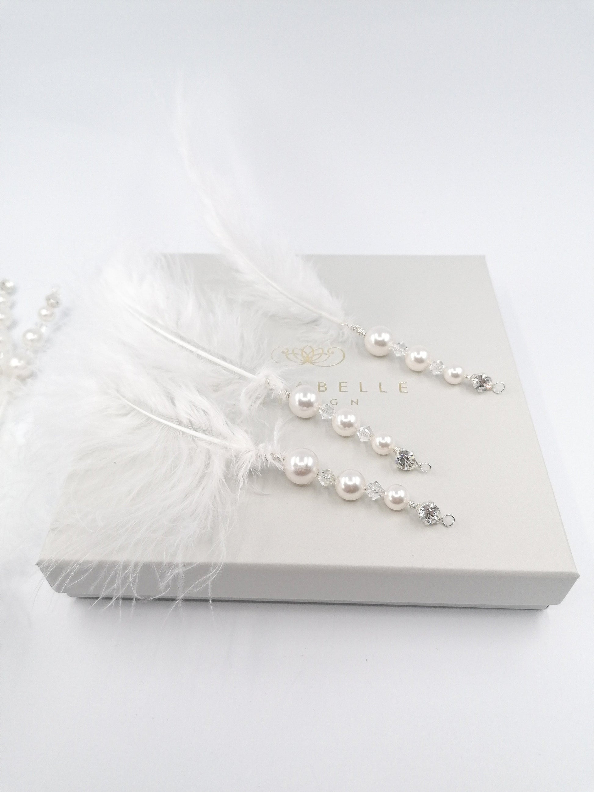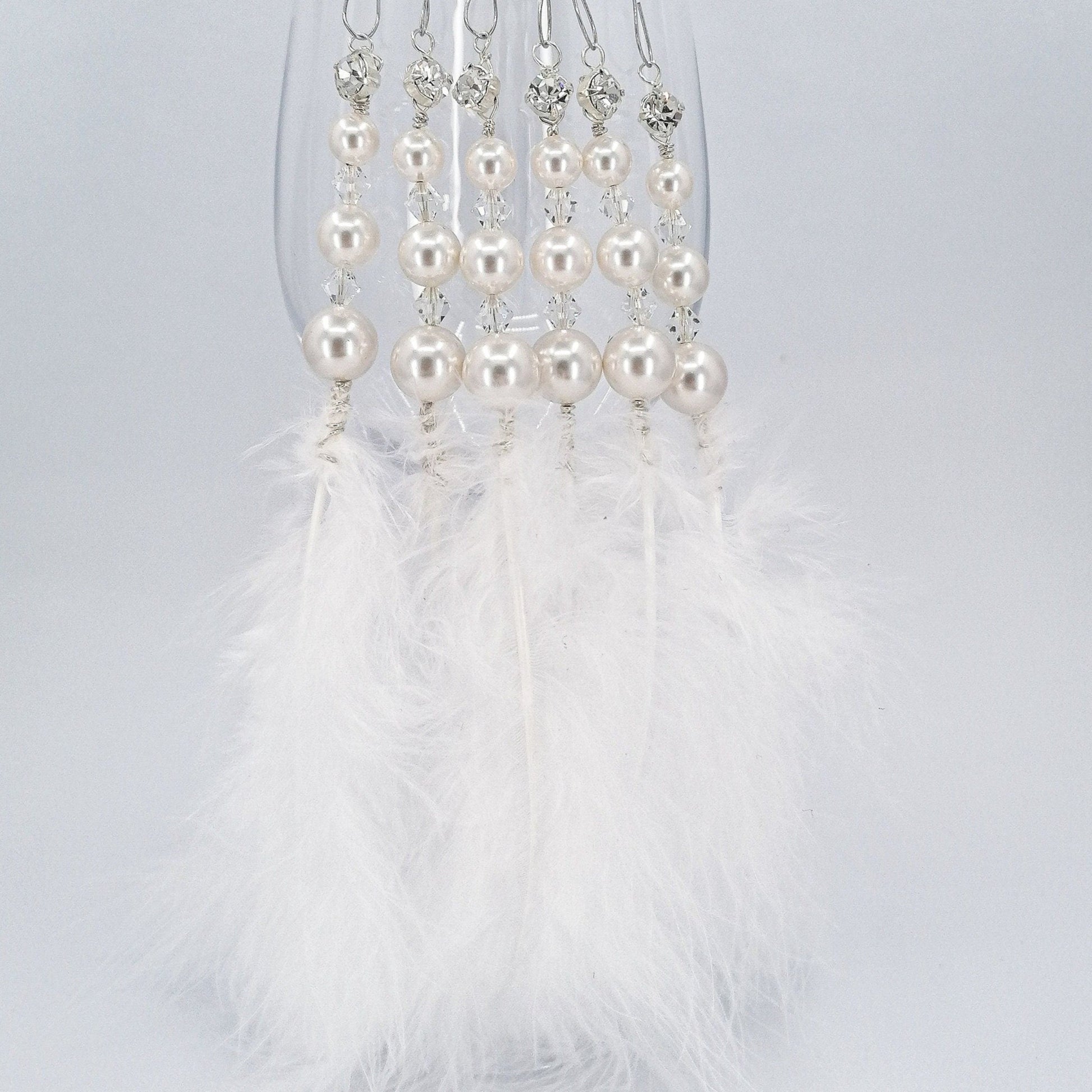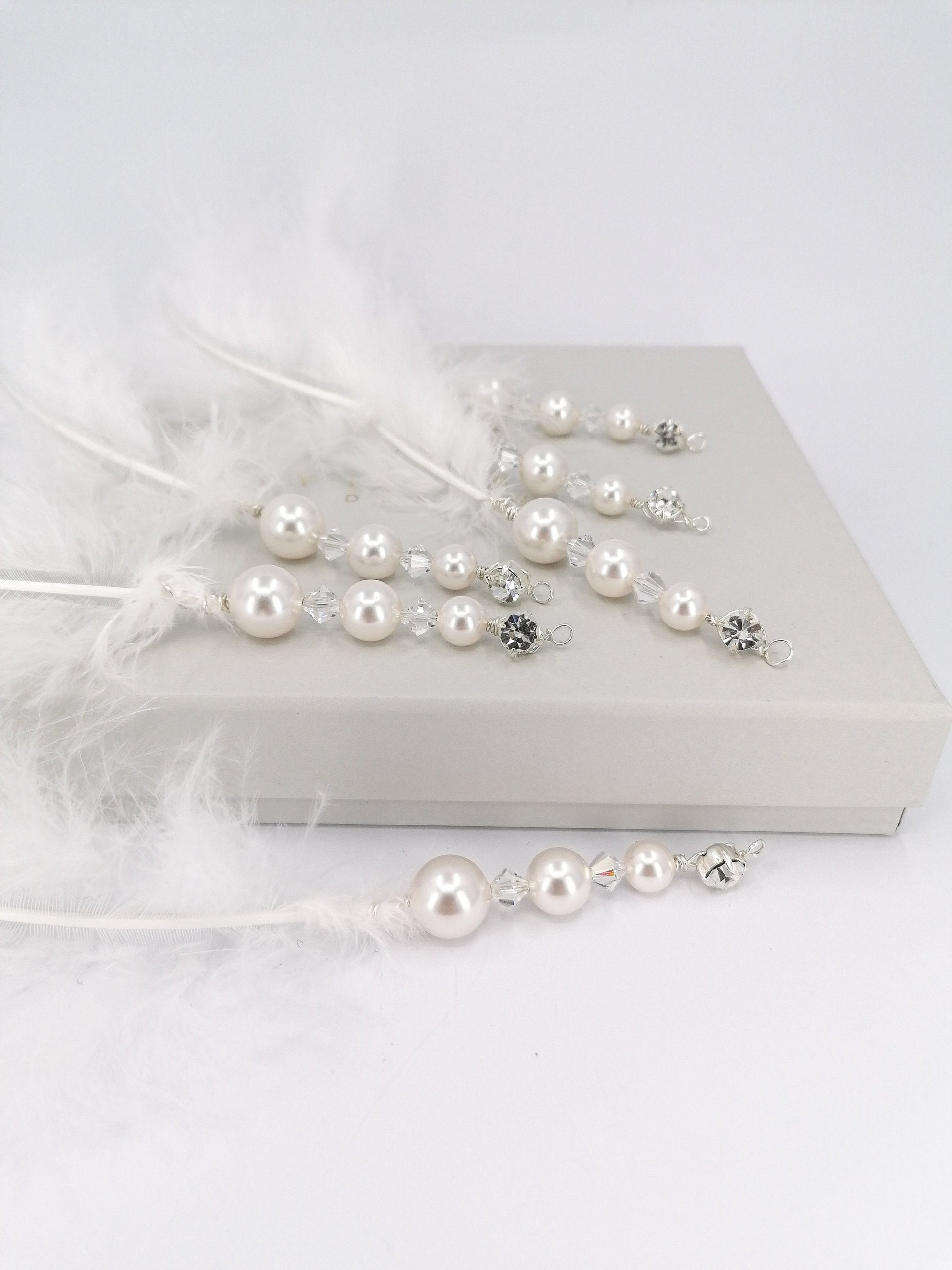Long hanging Christmas ornaments handmade from Austrian glass beads, crystals, Preciosa stones and white feathers.