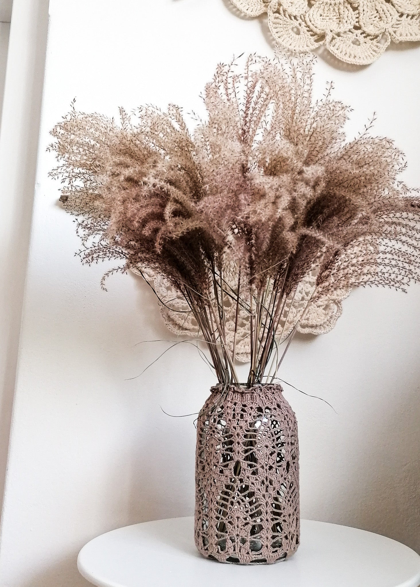 The cover is removable, crocheted from cotton yarn. You can easily remove it and wash it if necessary, and wash the glass.