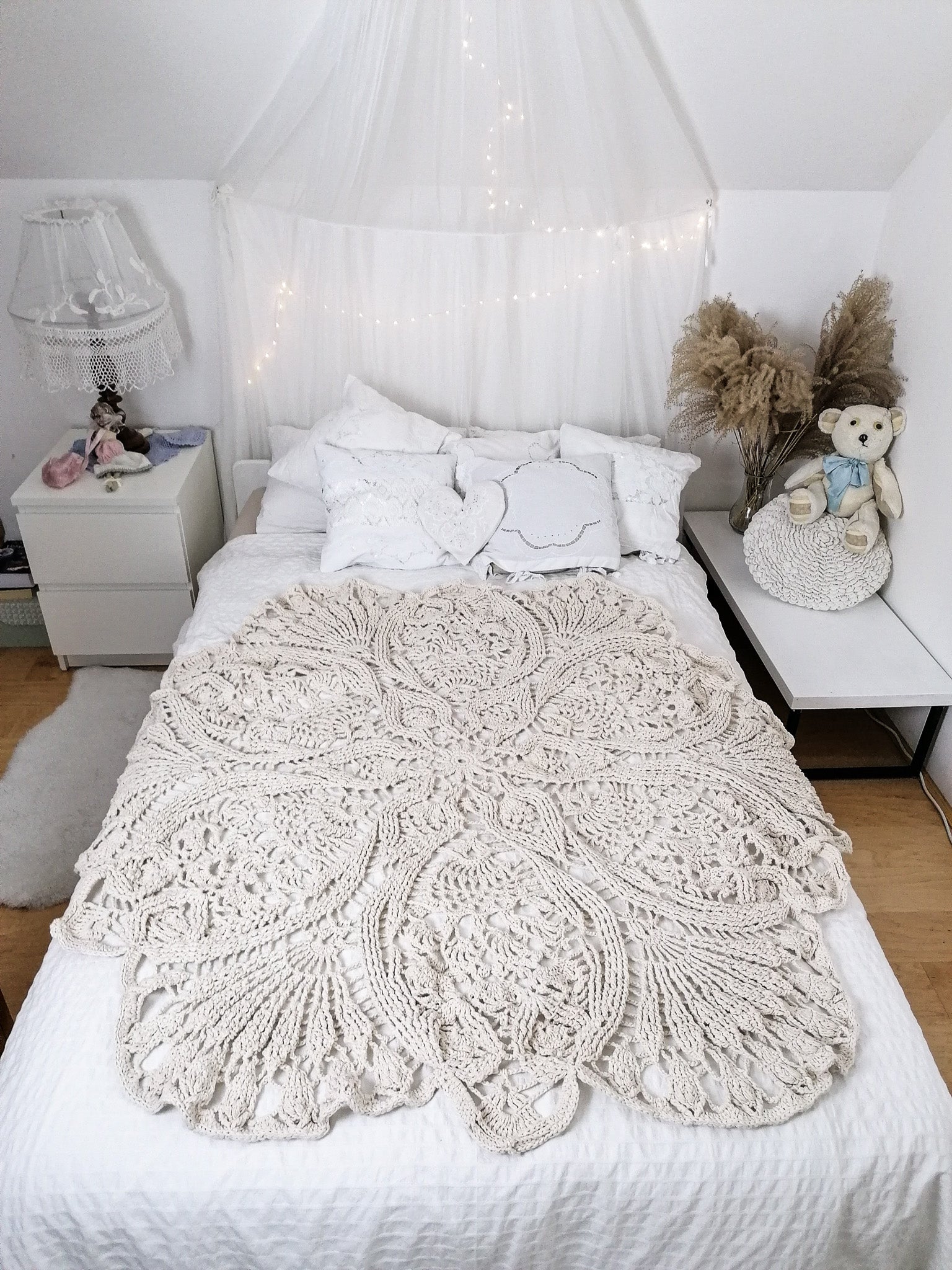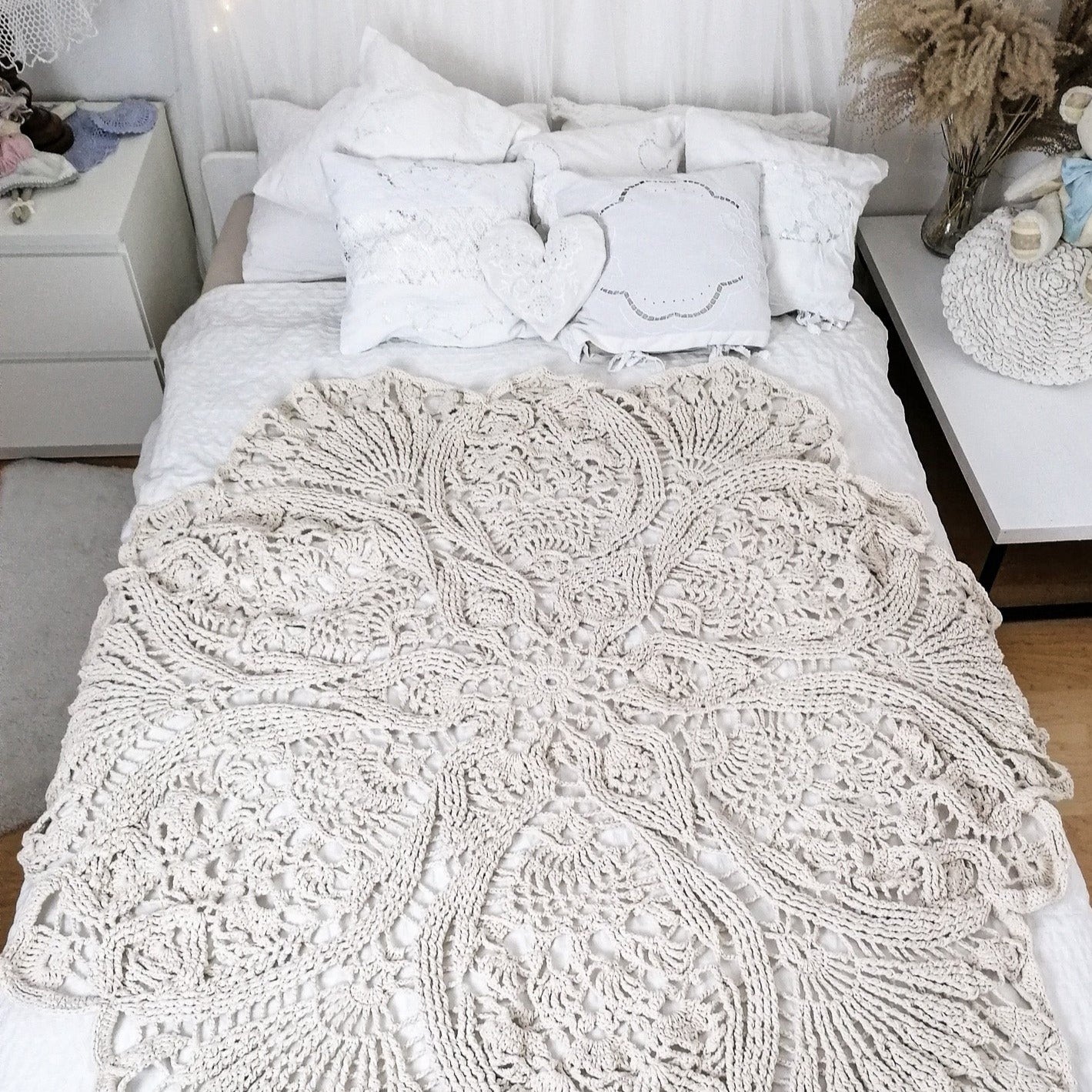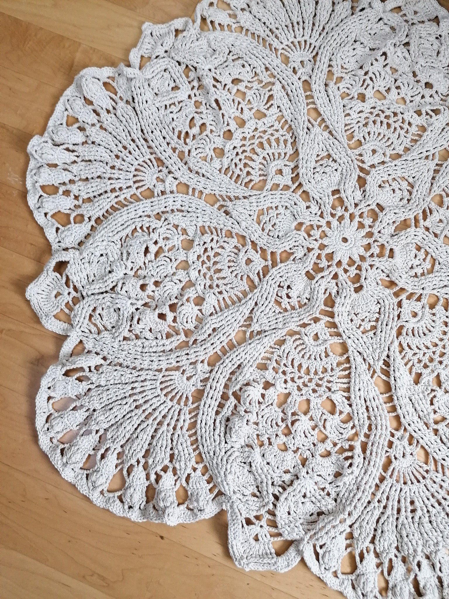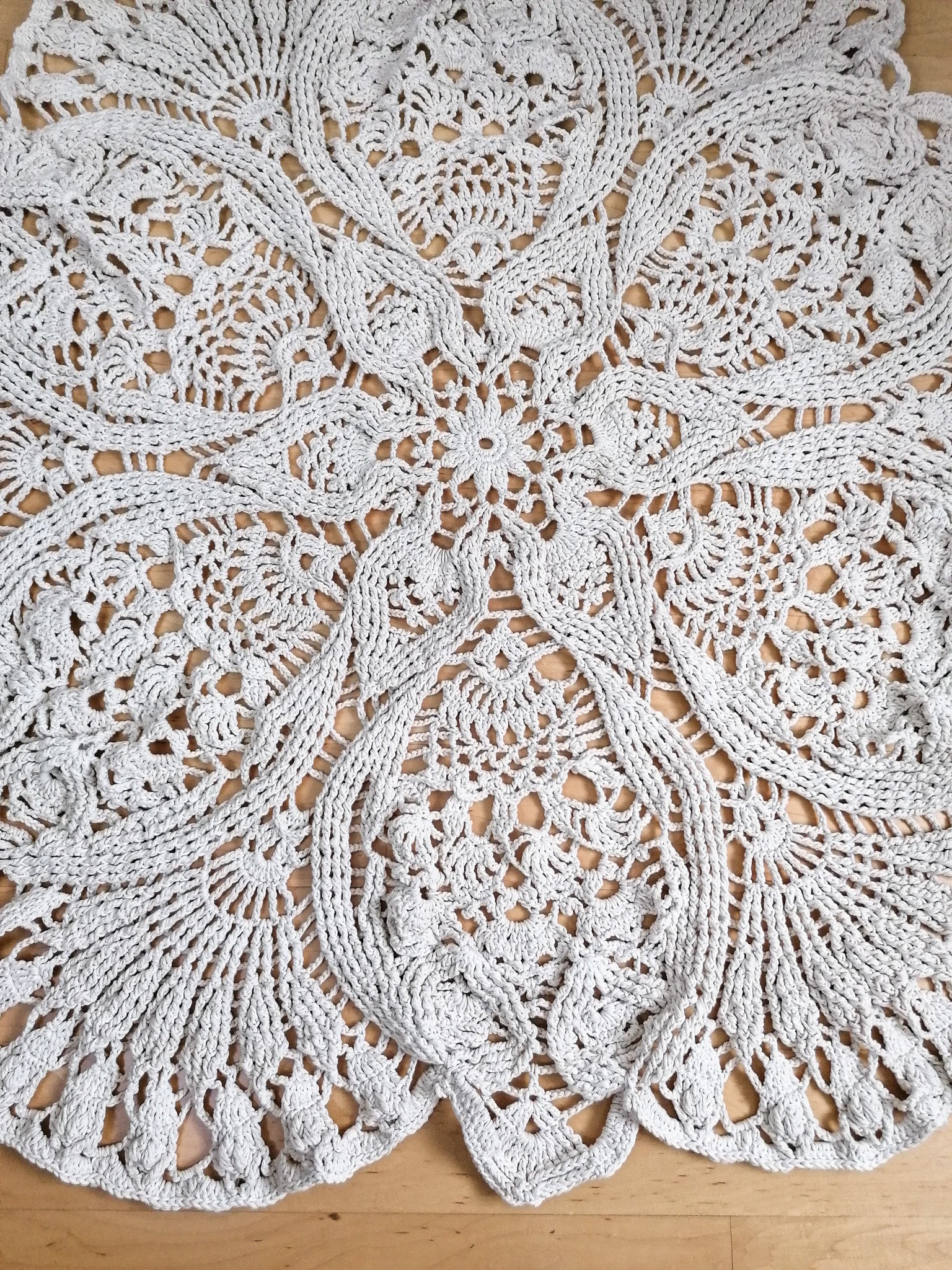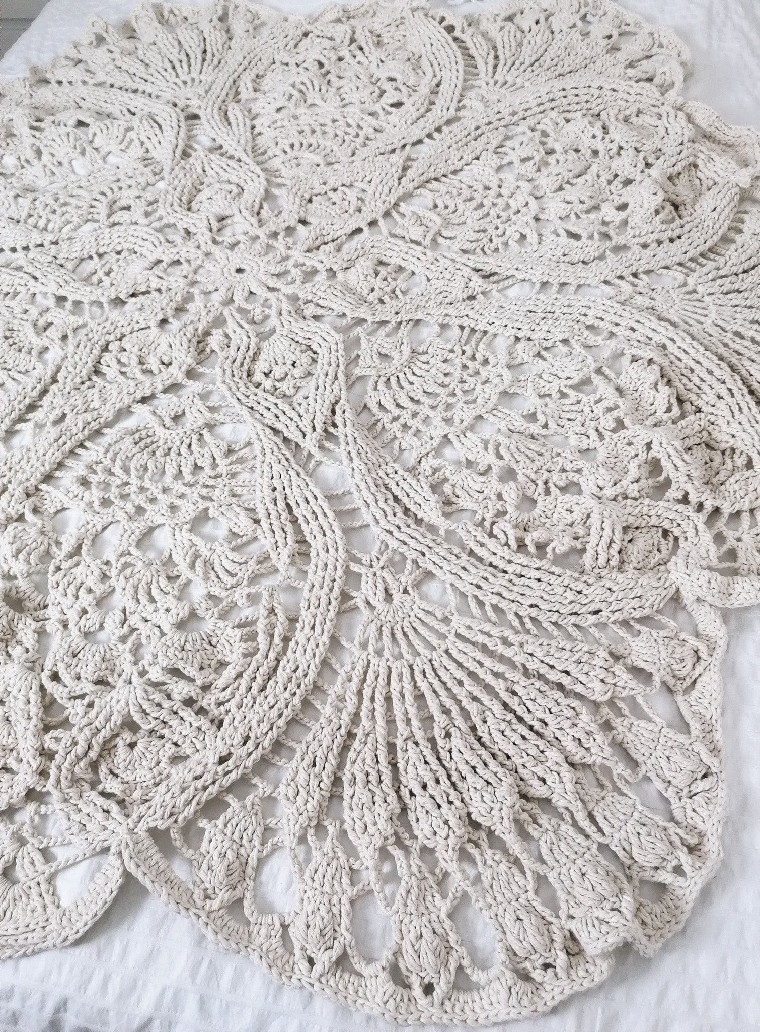 Unique large round rug with ornamental pattern is crocheted from 100% cotton