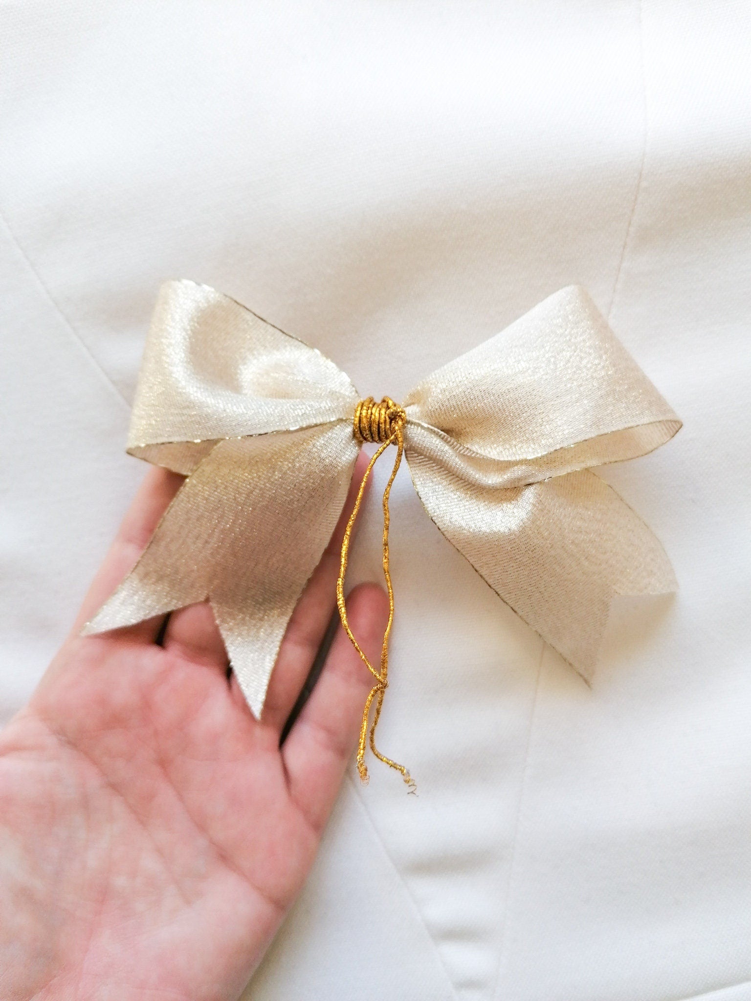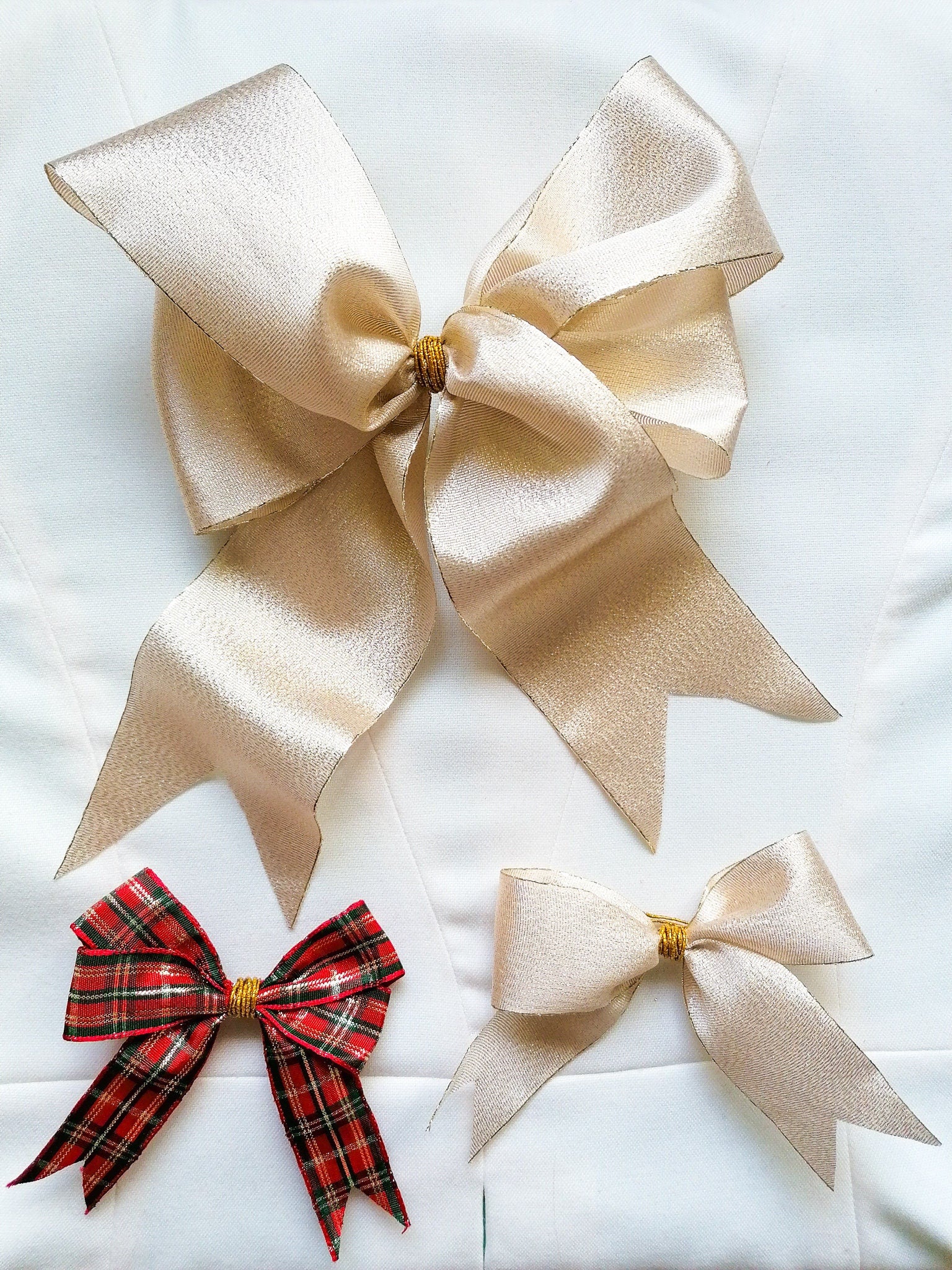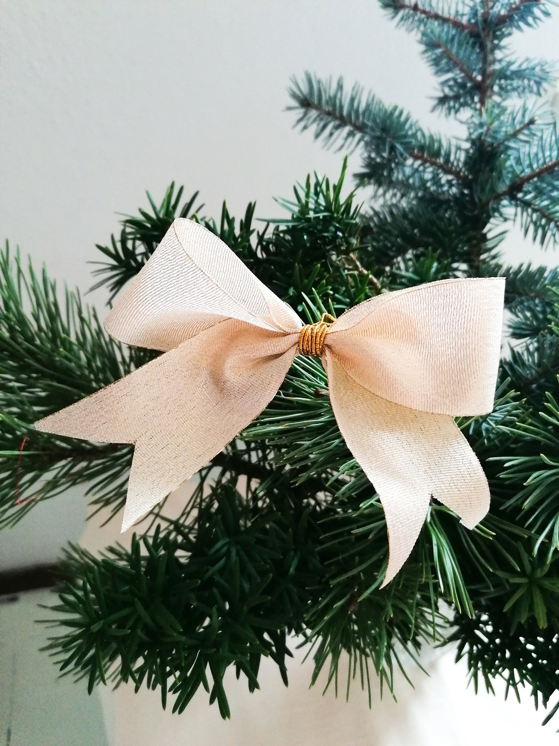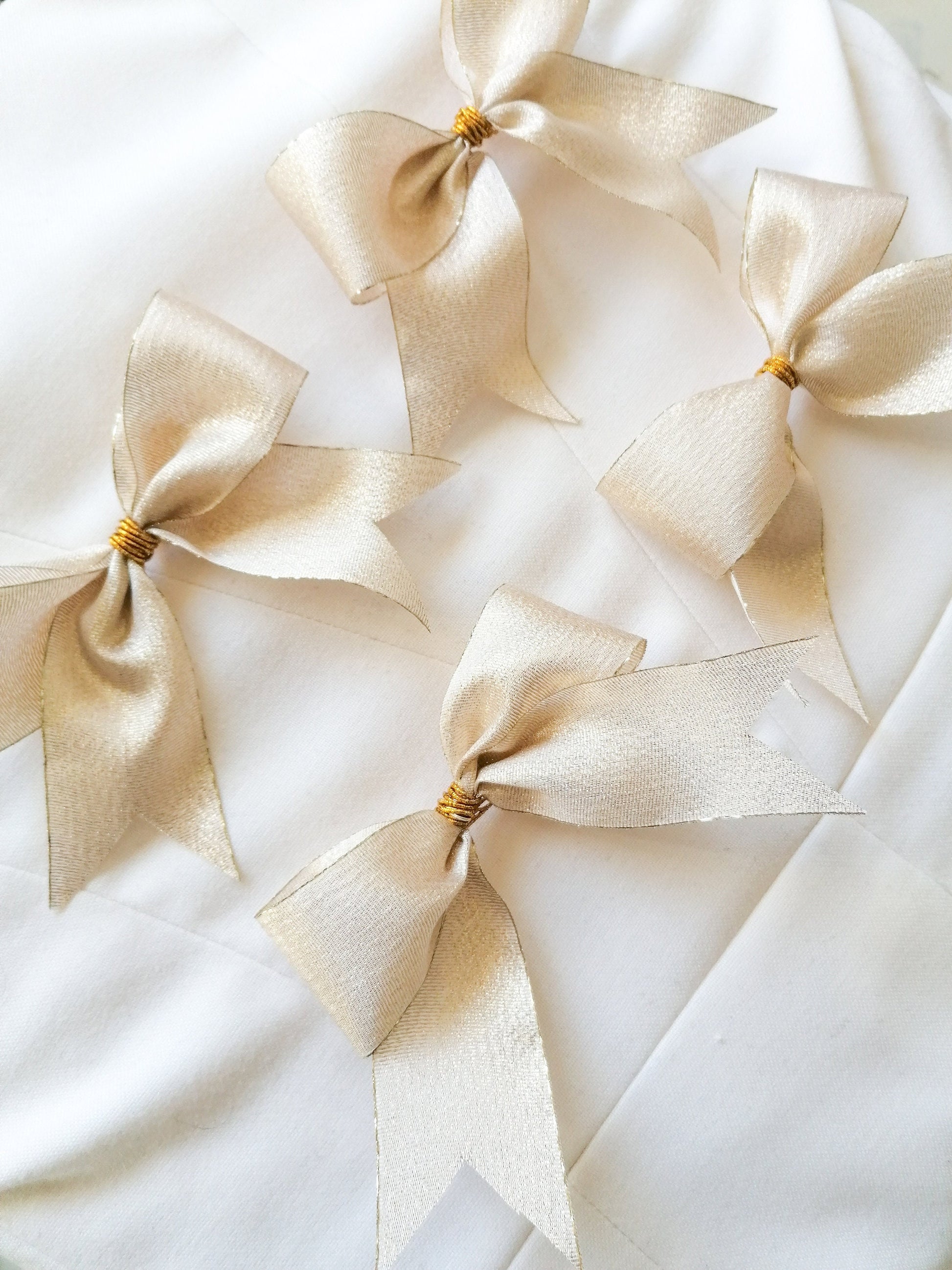 Set of ten bow ornaments for your Christmas tree made of gold ribbon made in the Czech Republic.