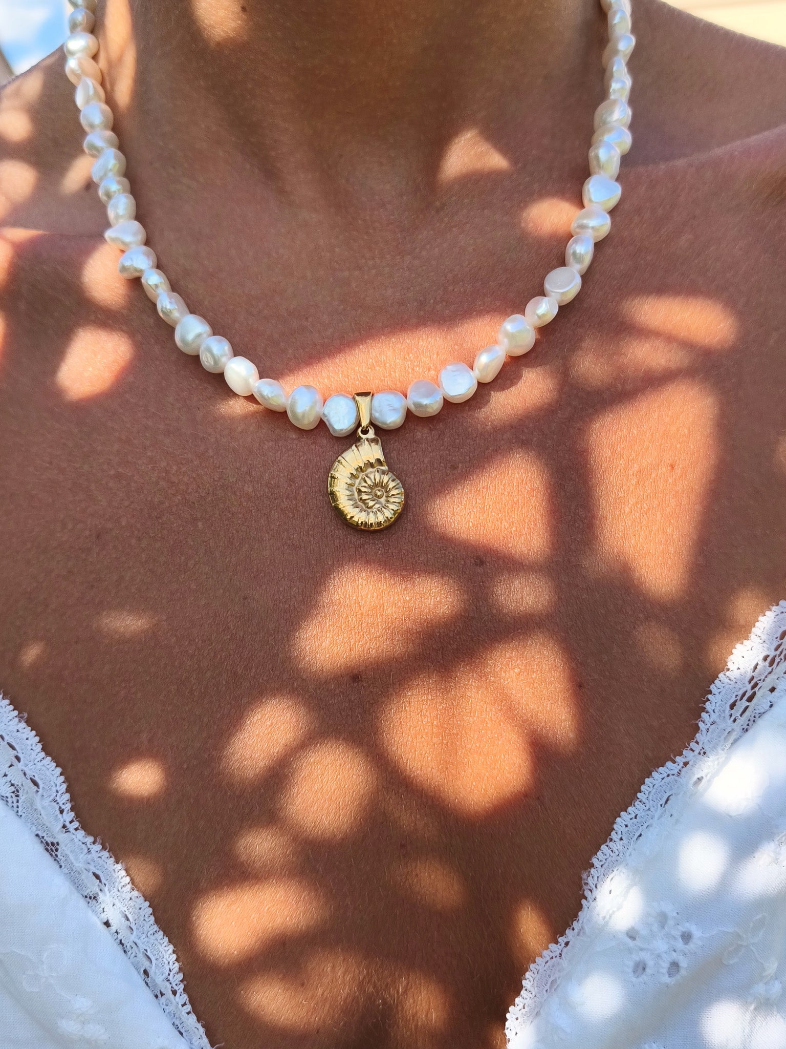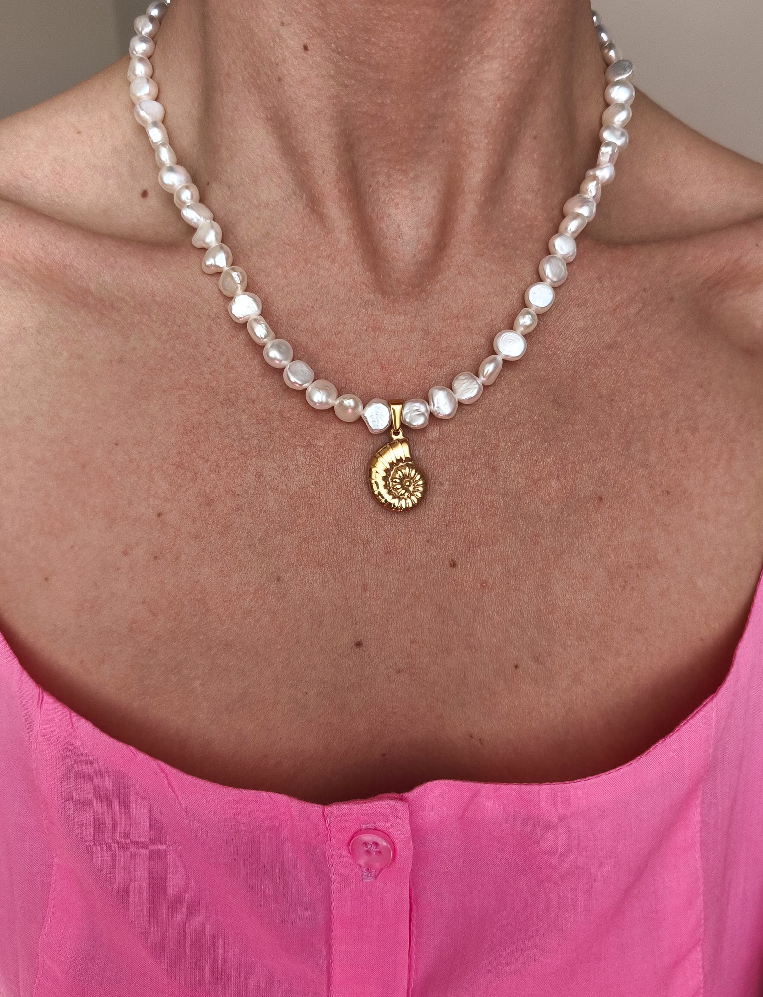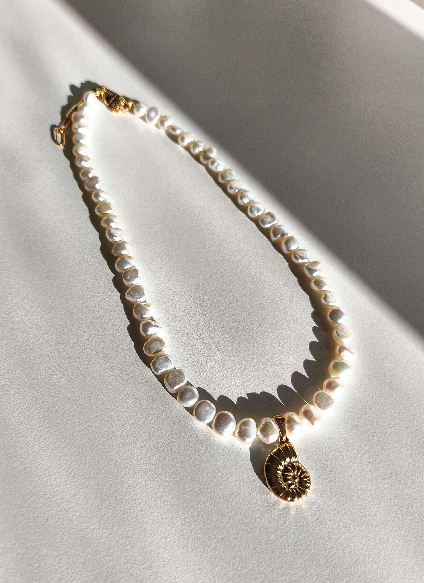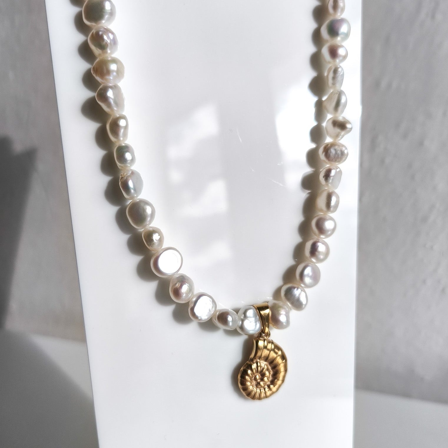 Necklace made of white baroque freshwater pearls with a metal shell pendant