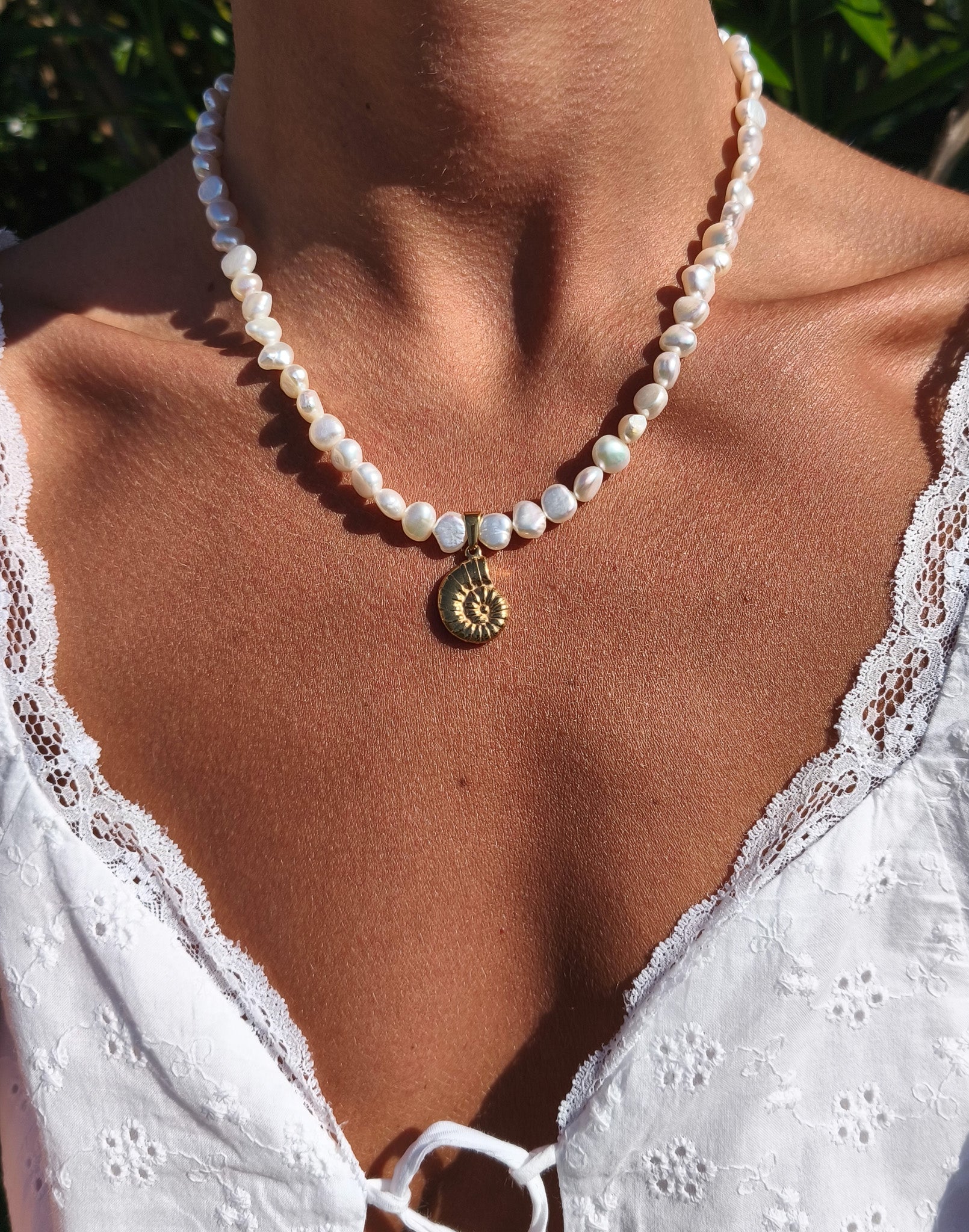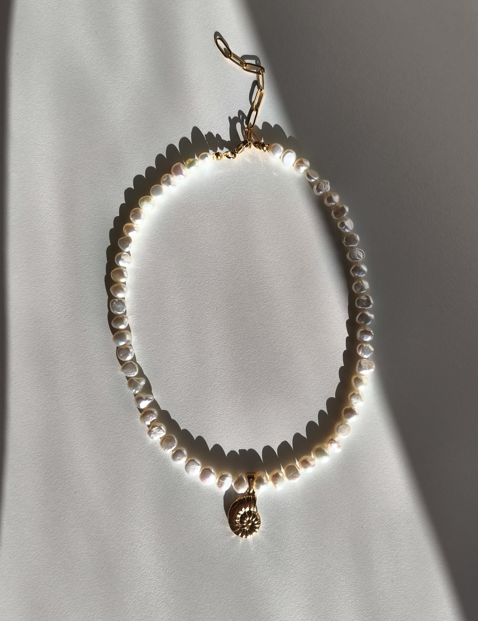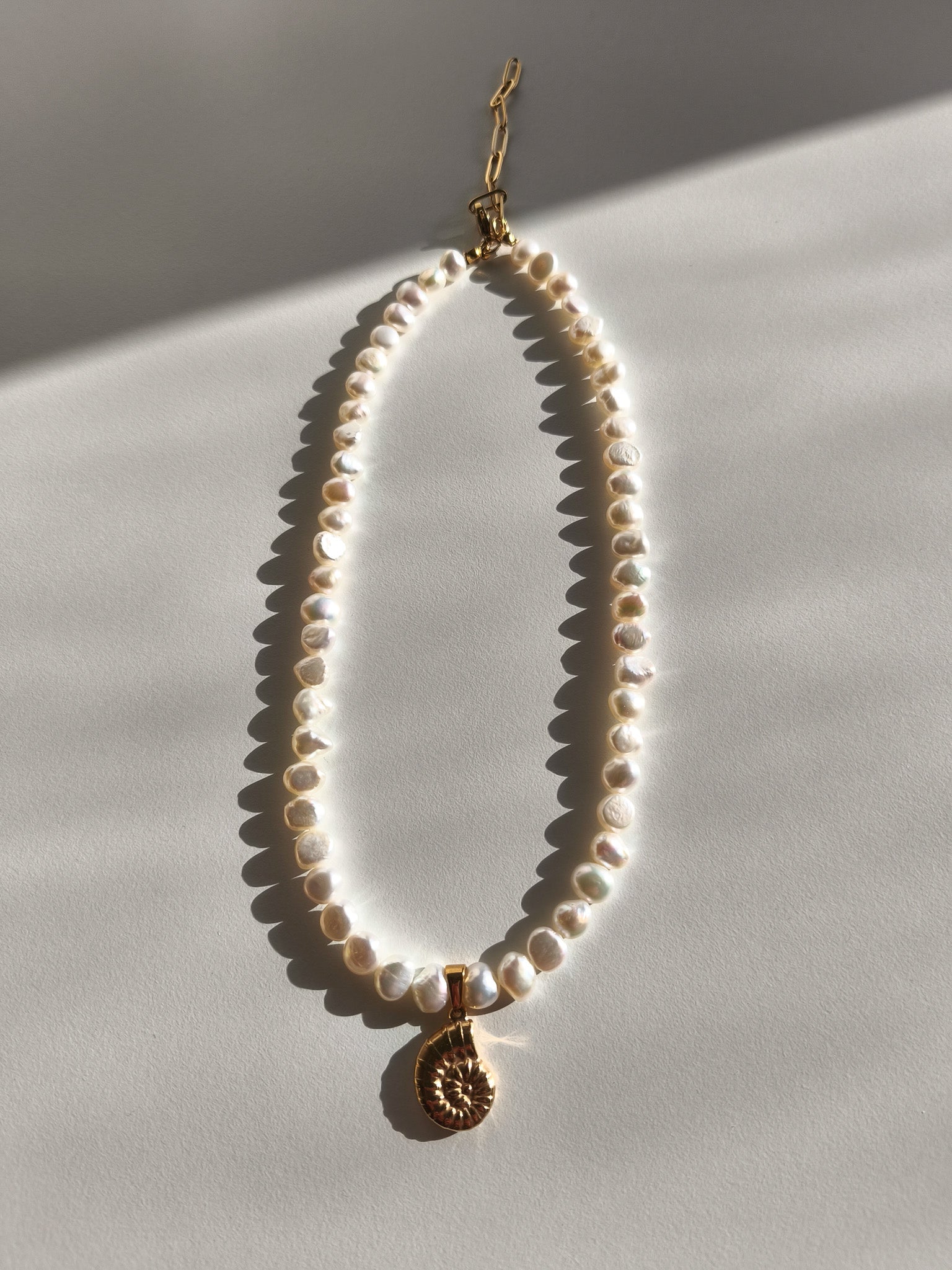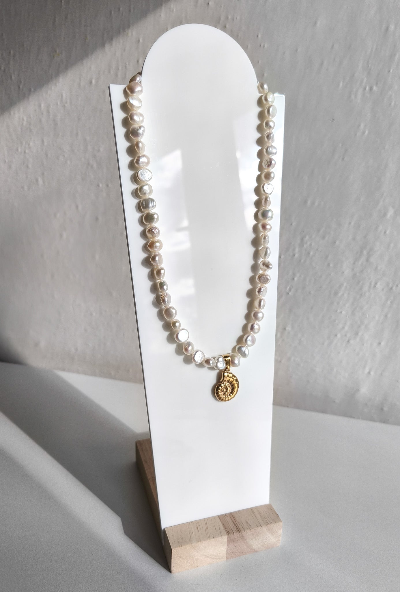 Necklace made of white baroque freshwater pearls with a metal shell pendant