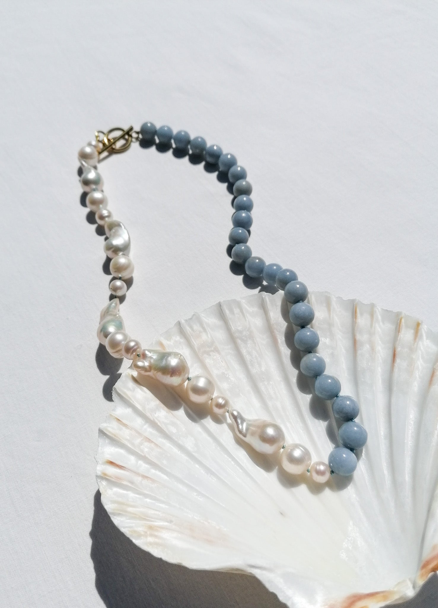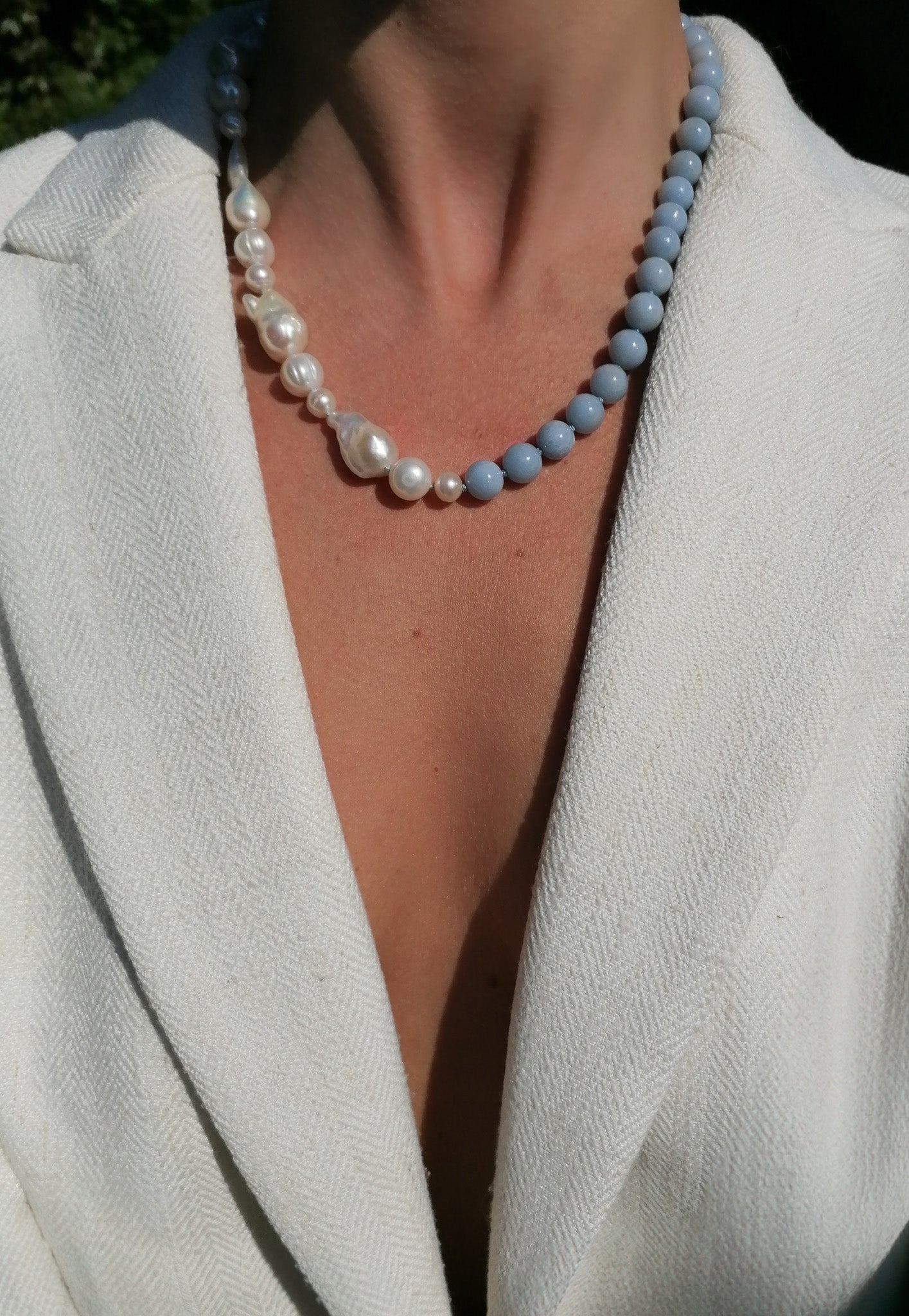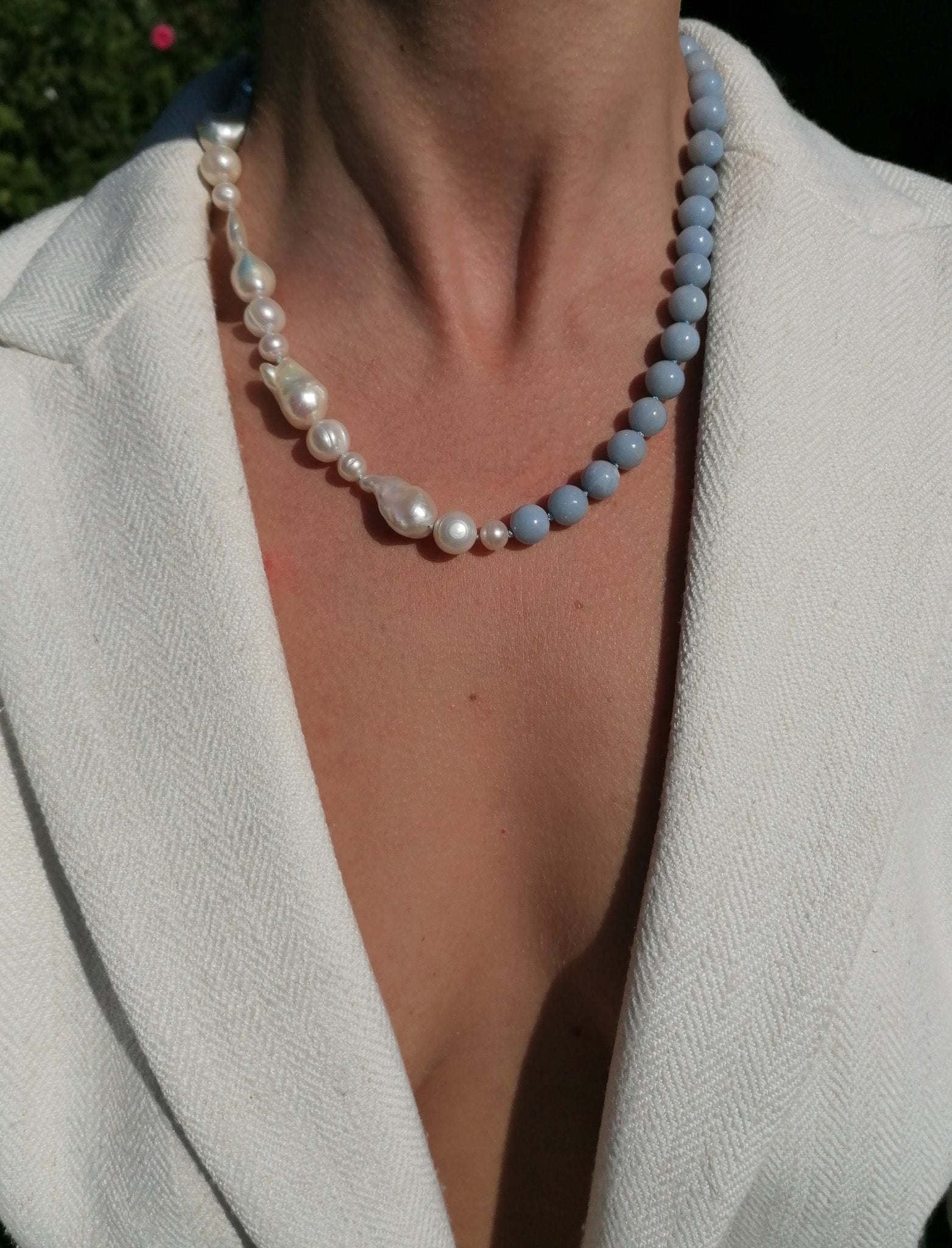 Half pearl, half angelite, asymmetrical necklace made of freshwater pearls of various shapes and sizes