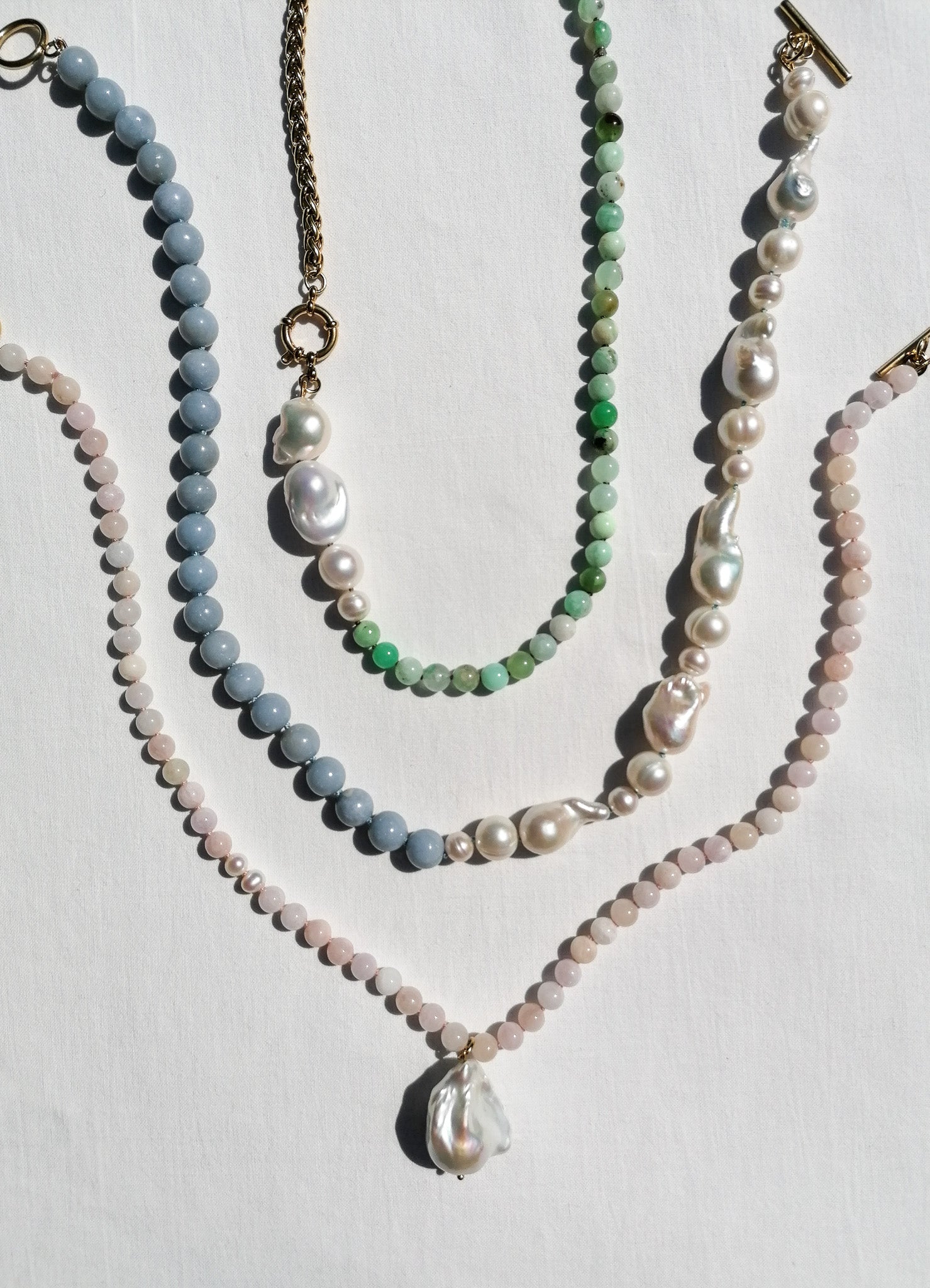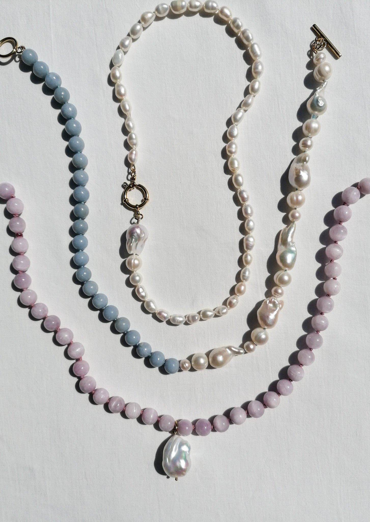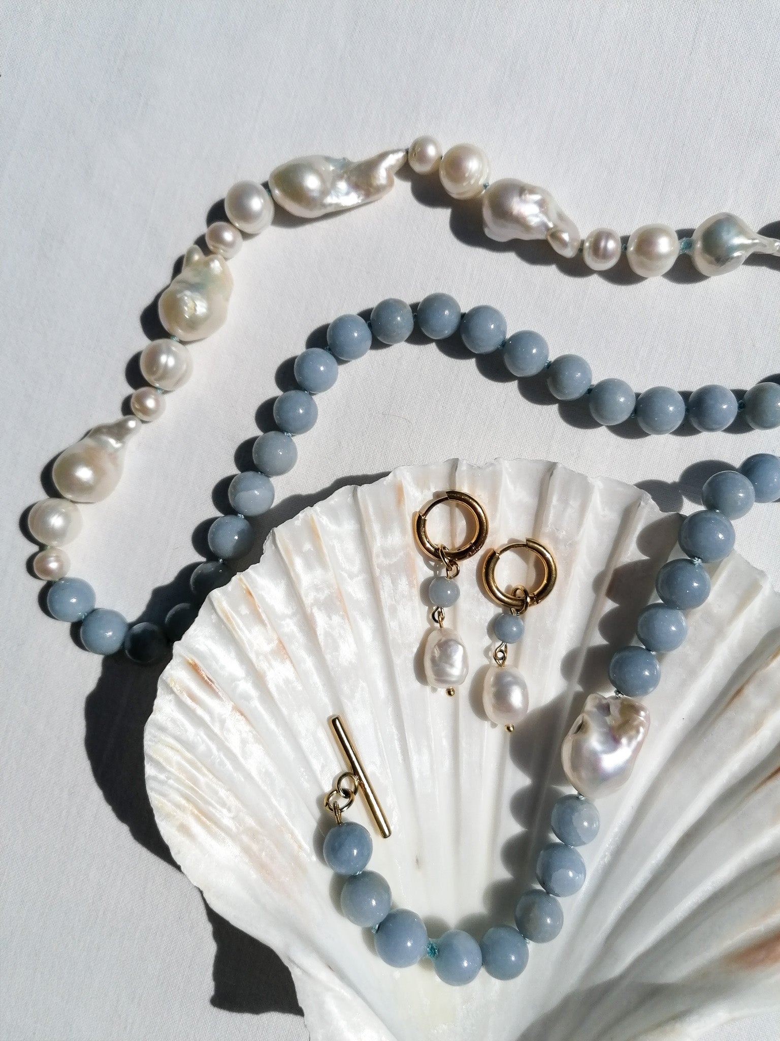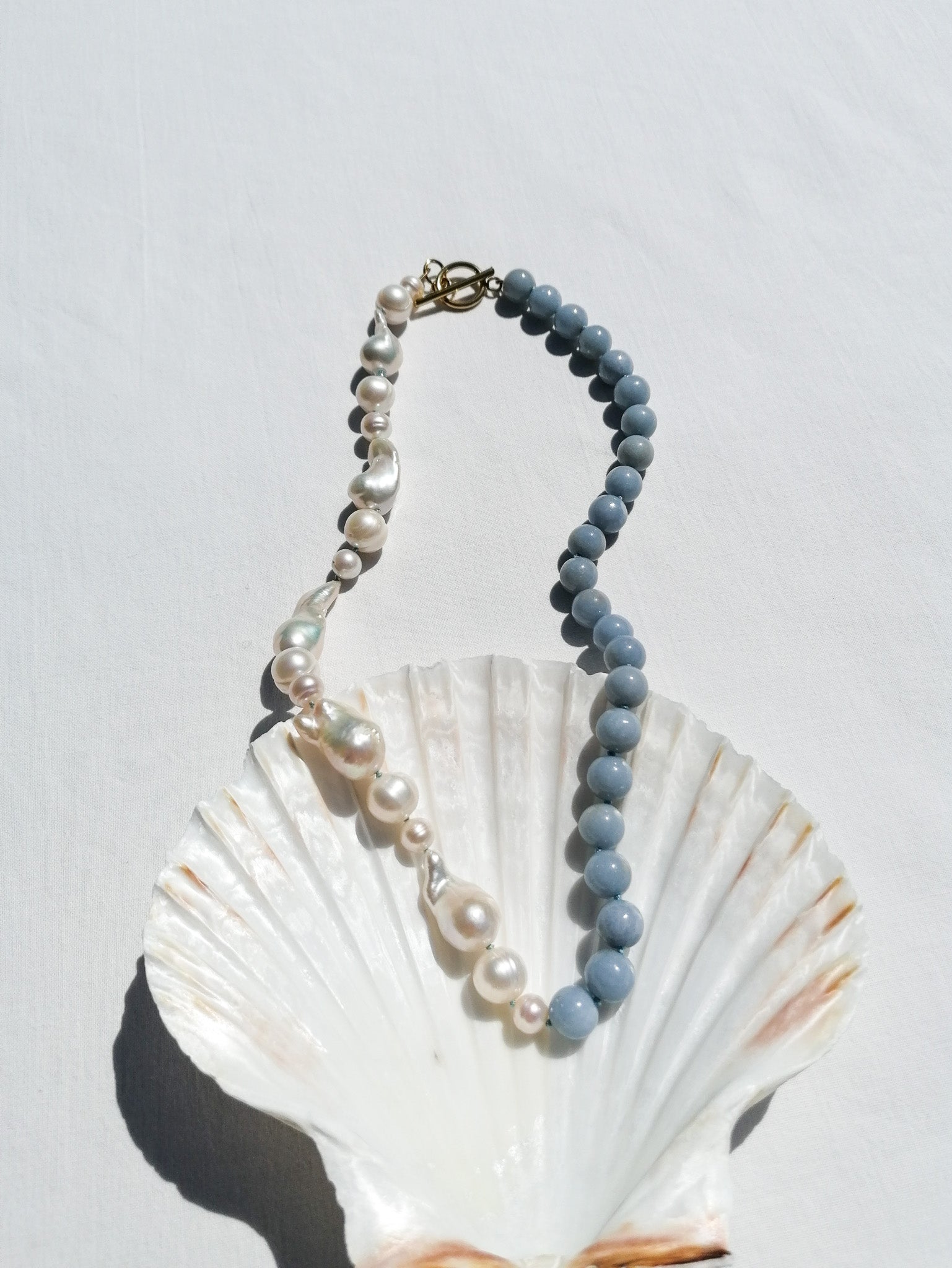 Half pearl, half angelite, asymmetrical necklace made of freshwater pearls of various shapes and sizes