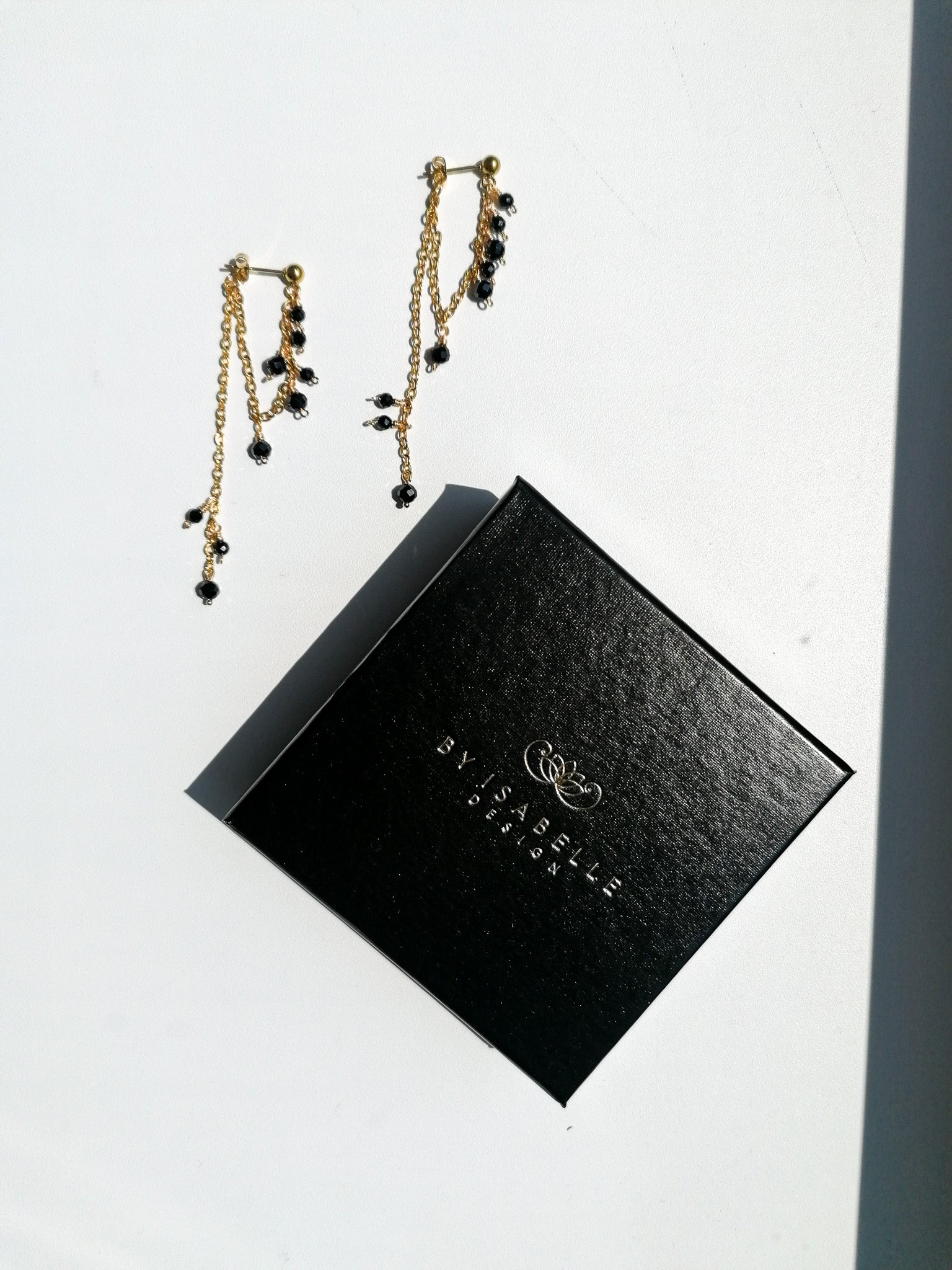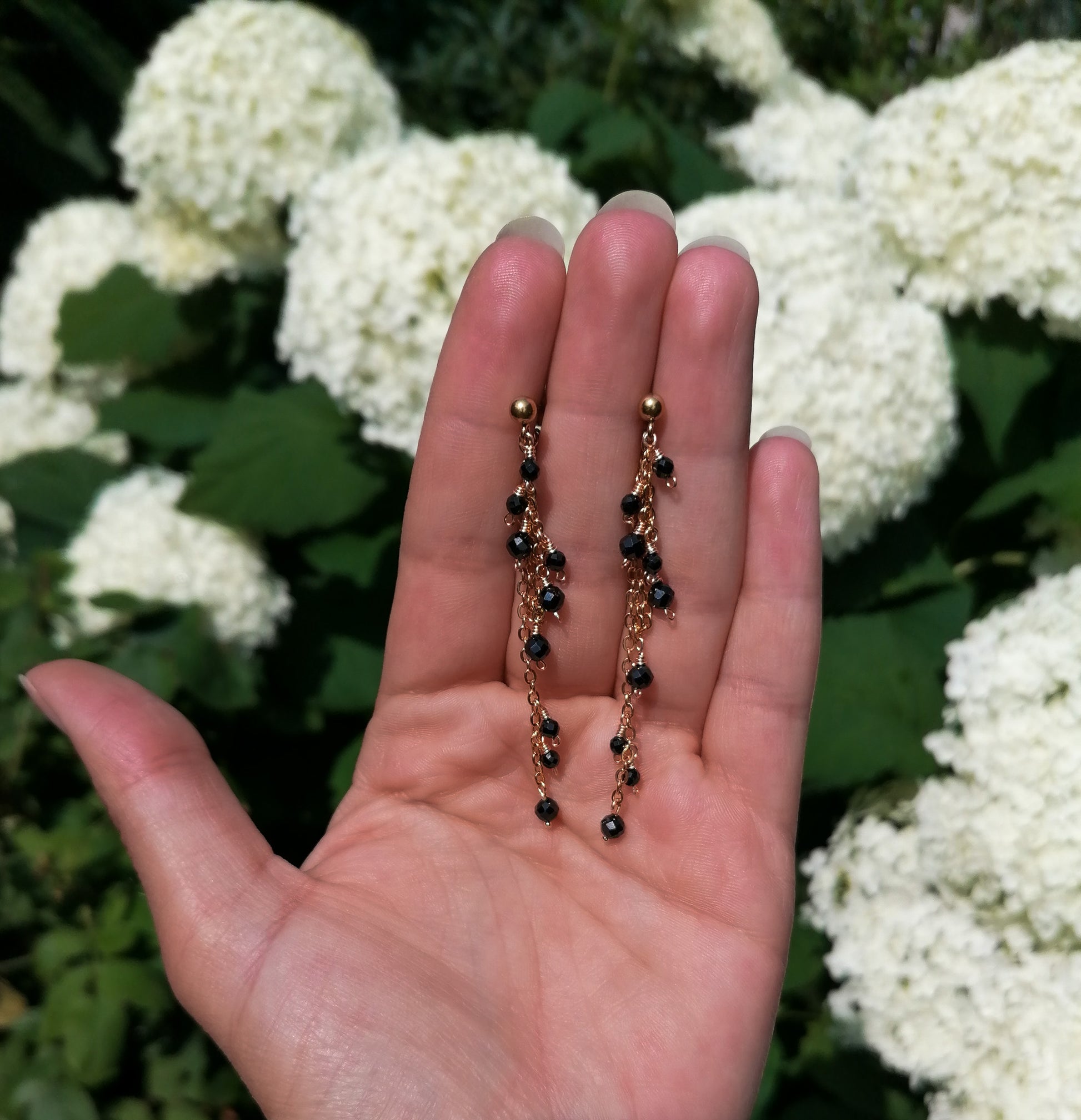 Sparkling earrings made of cut black spinel strung on chains like a waterfall