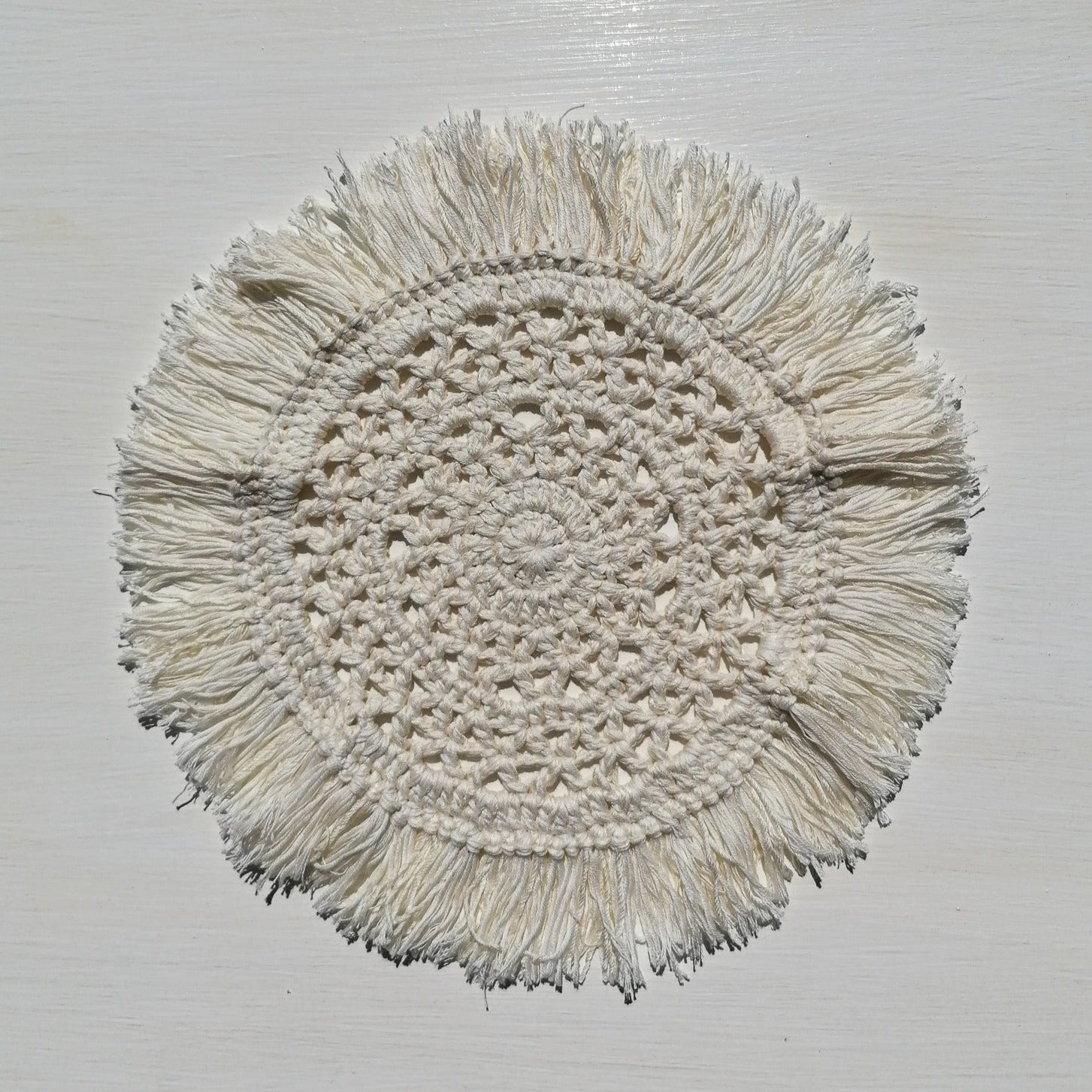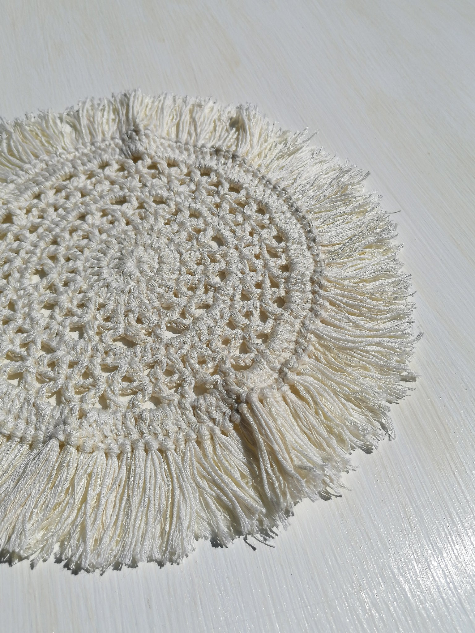 A crocheted blanket in natural white (or light beige) is great for a flower, vase, candle or decorative bowl.