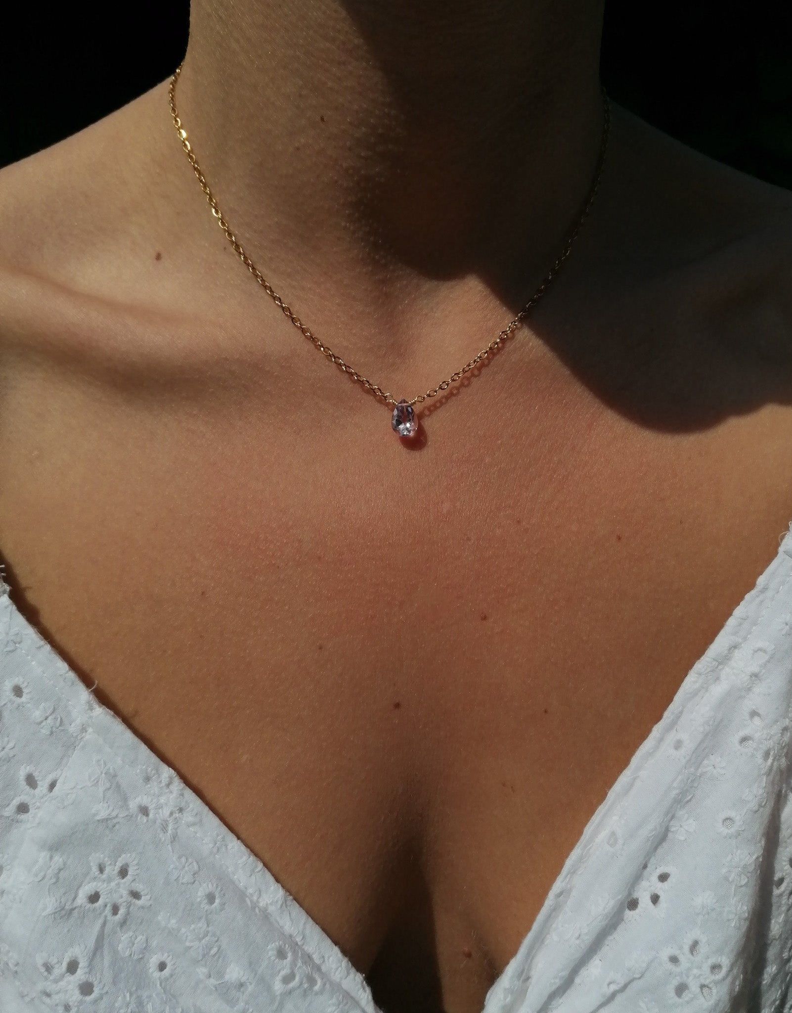 The base metal of our jewelry is stainless steel, which is why the resulting color is a little darker, not completely bright, as with gold-plated brass (a gold filled) or silver.