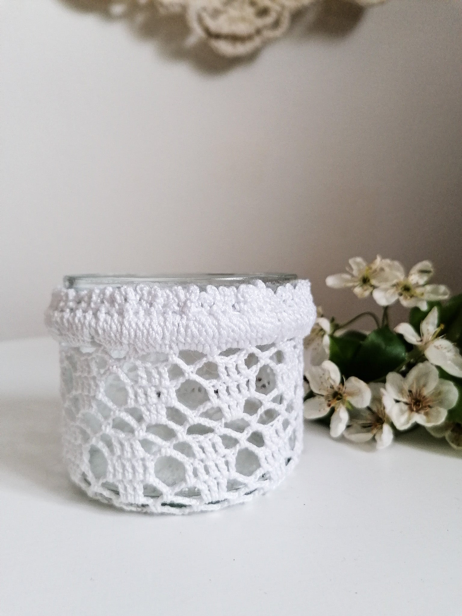 The crocheted cover can be removed and washed, and the glass can be washed if necessary.