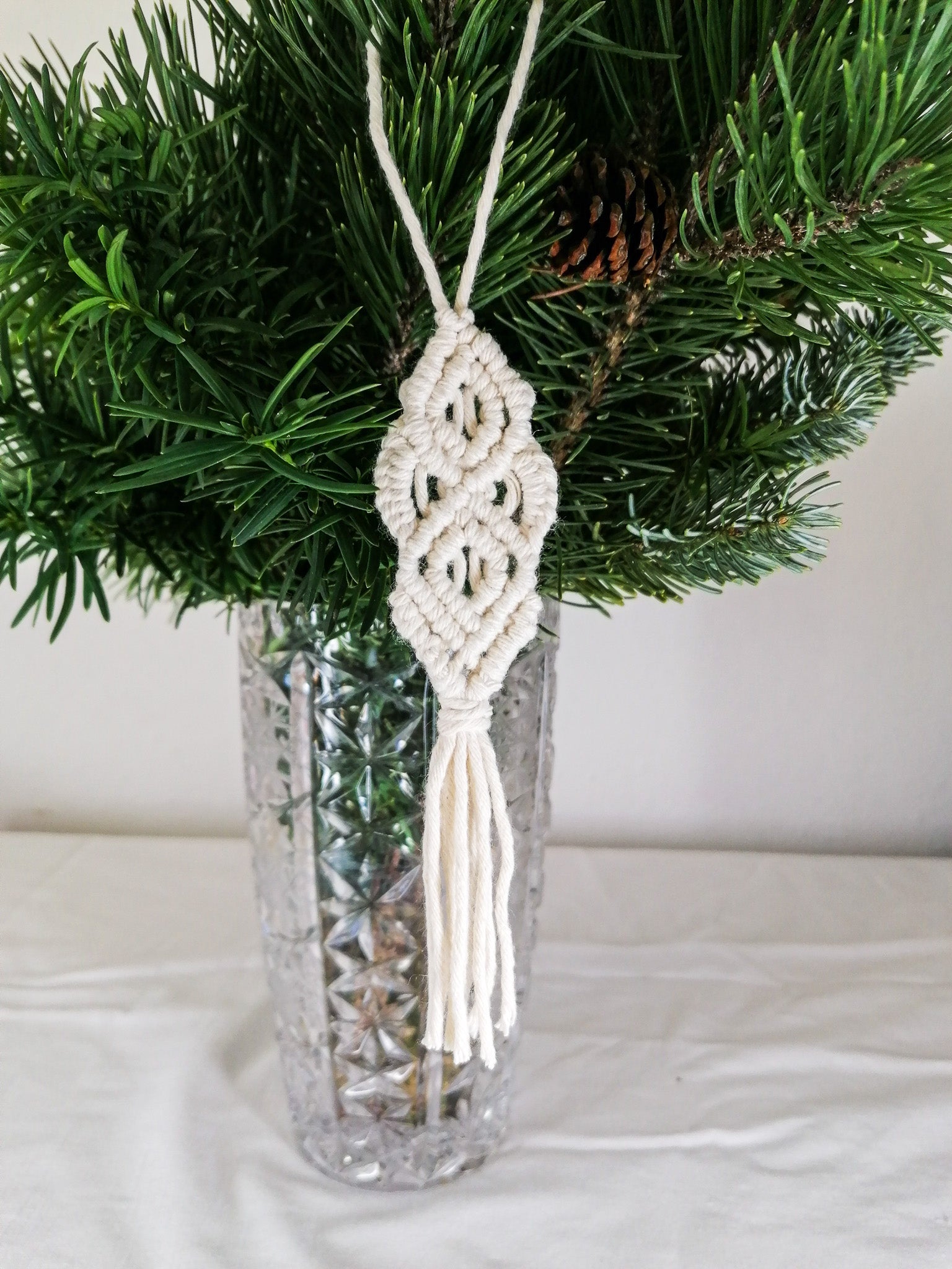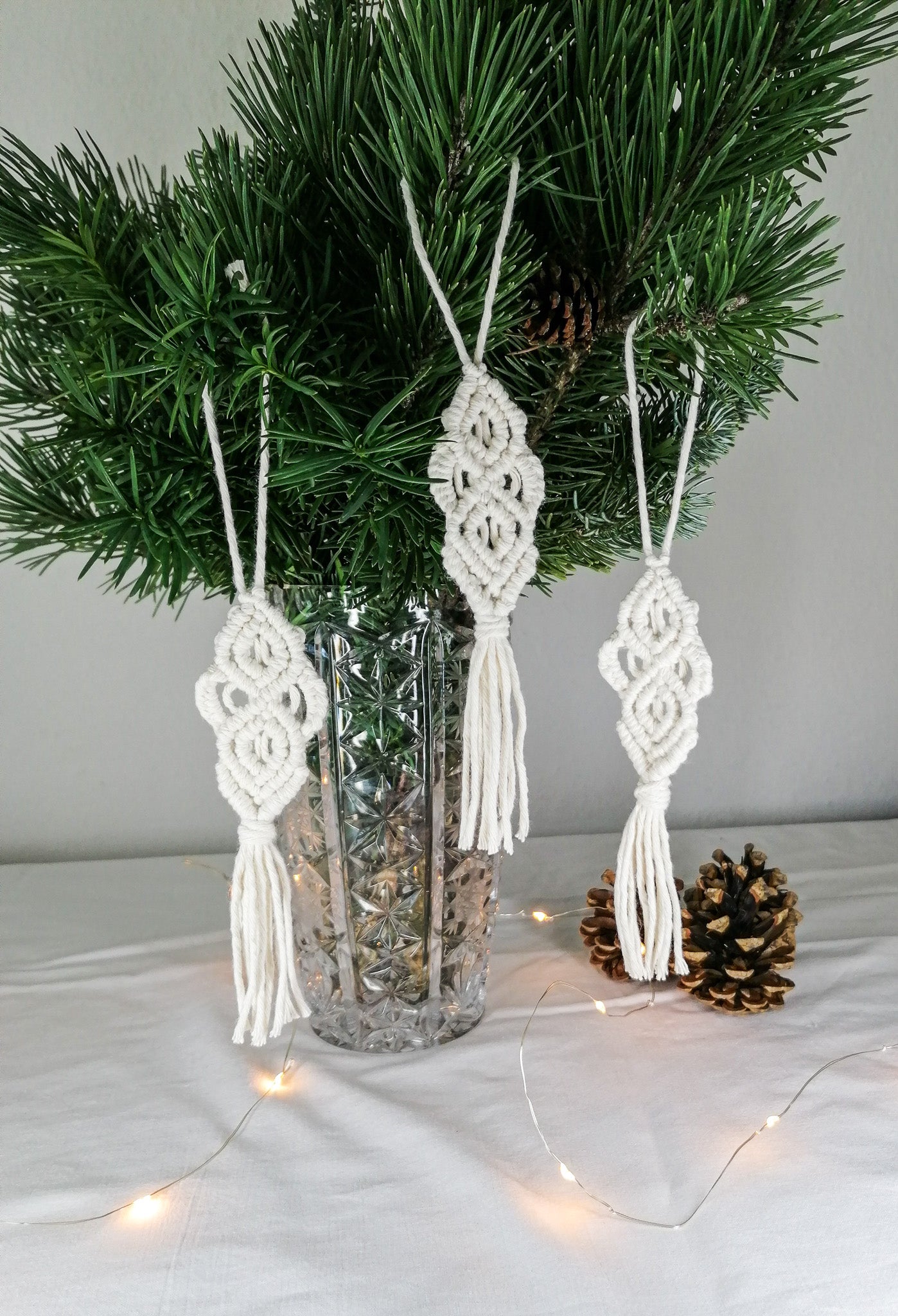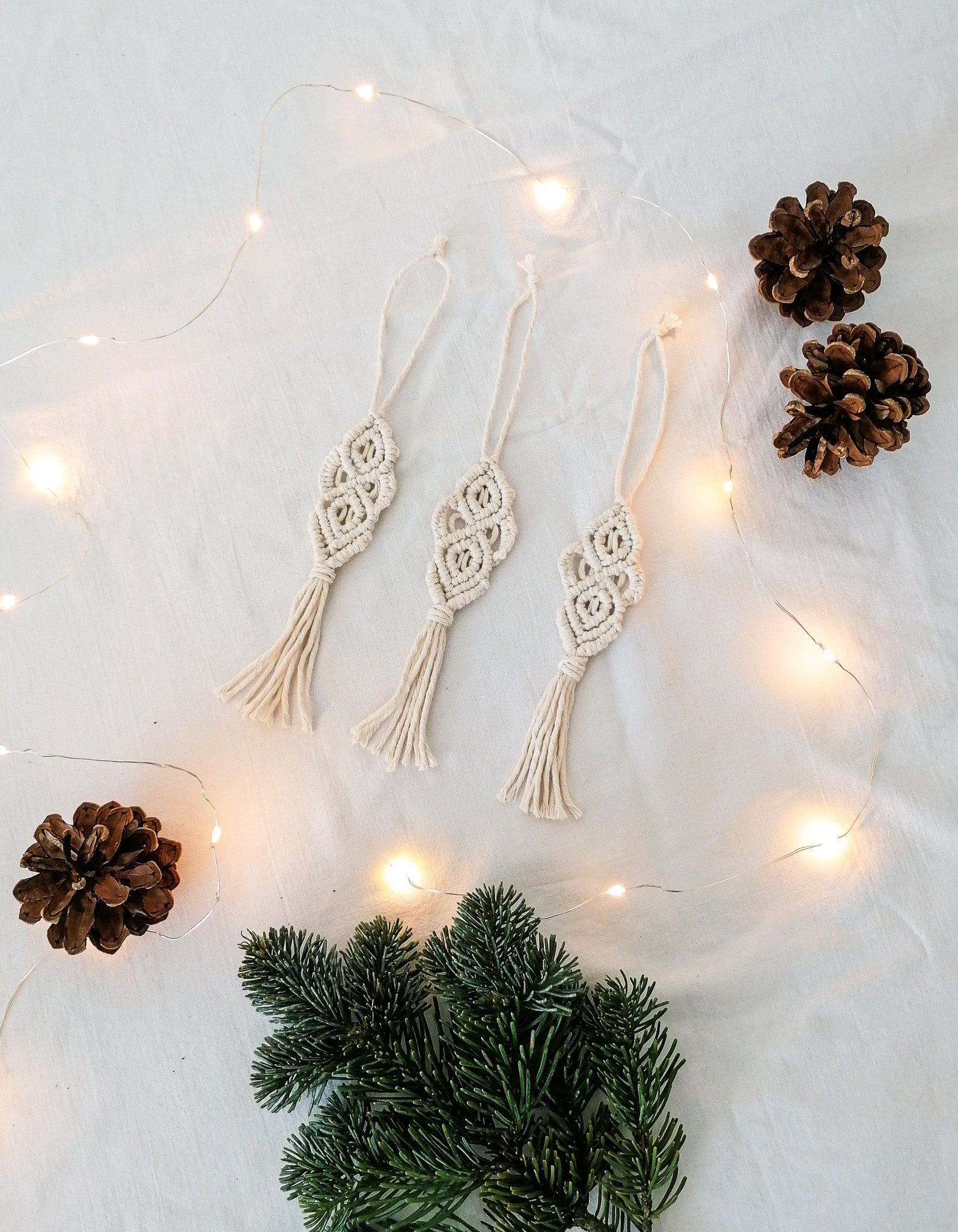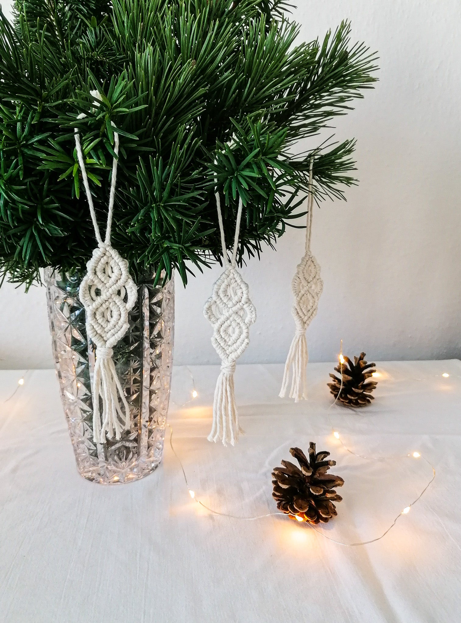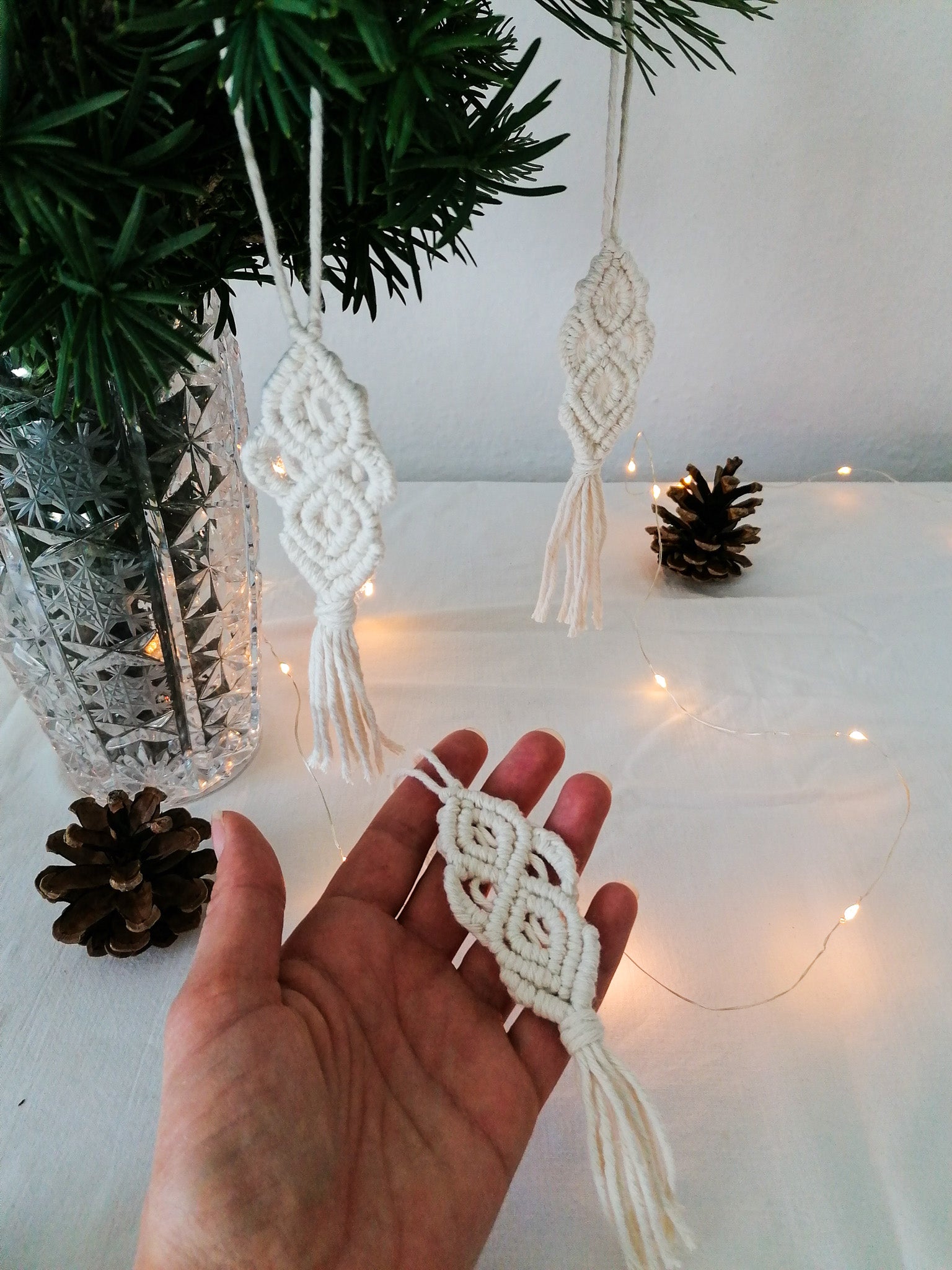 Simple yet festive ornamental Christmas decorations made using macramé technique