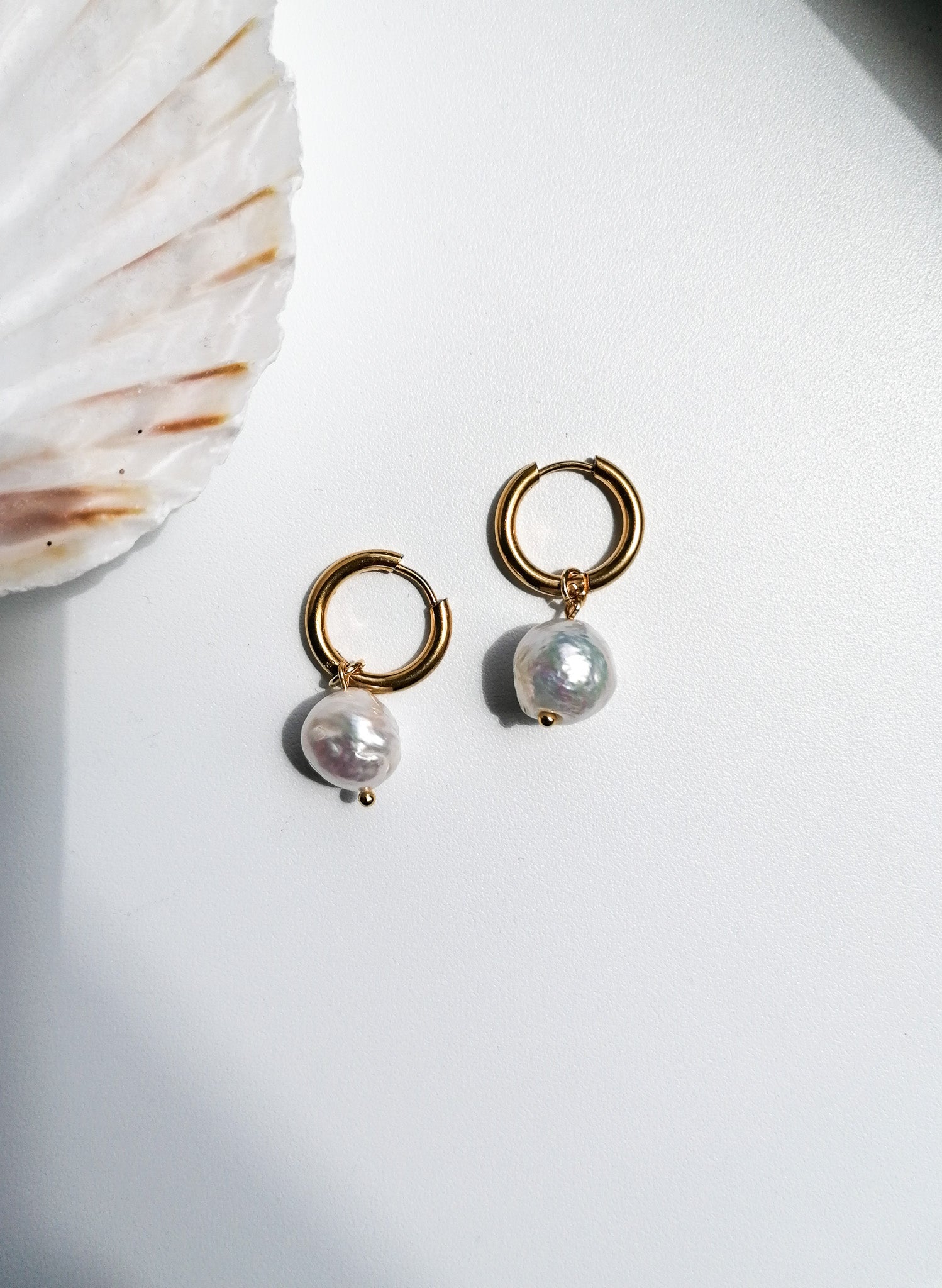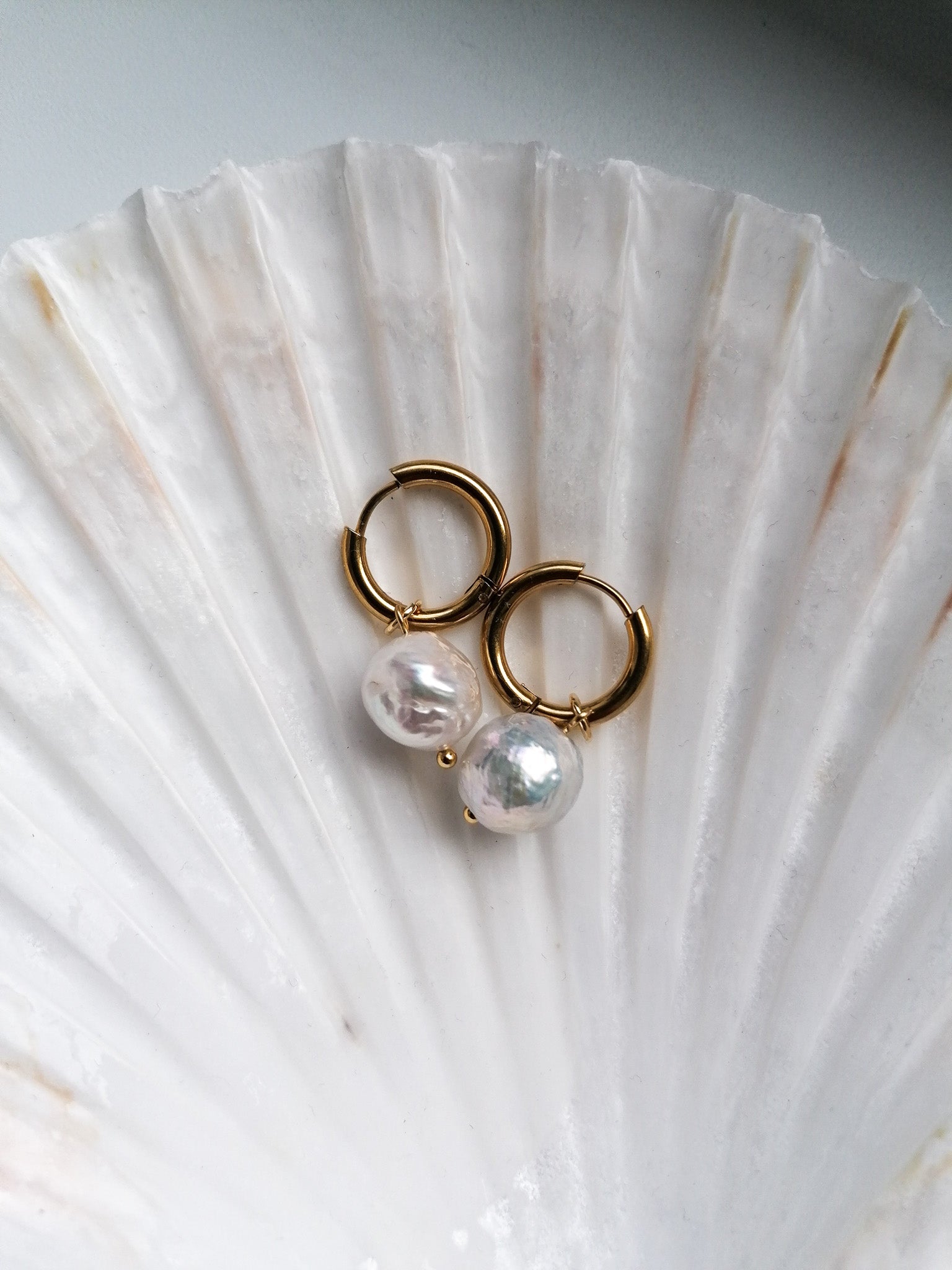 Large cultured Edison pearls (among the largest freshwater pearls) on hoop earrings