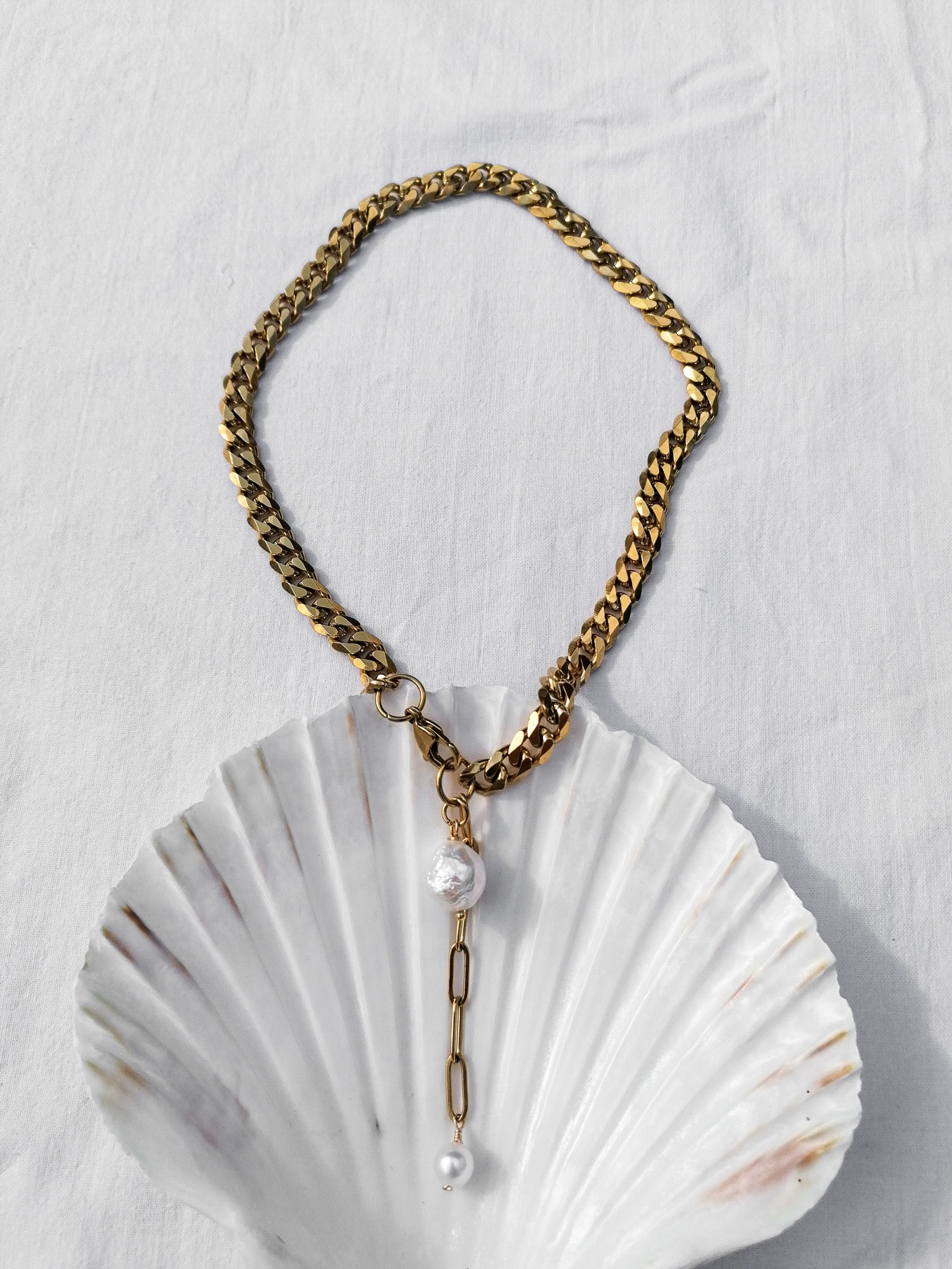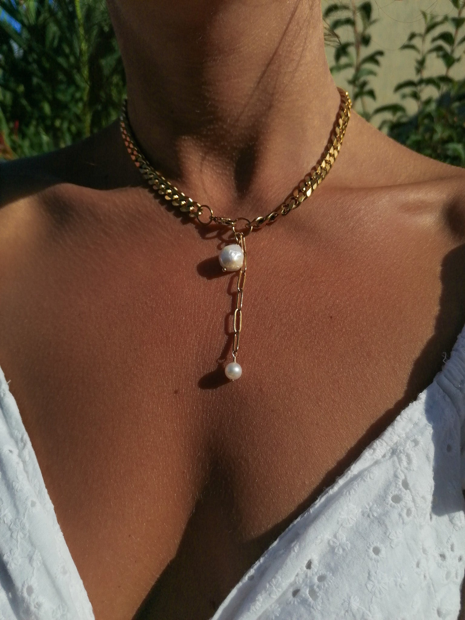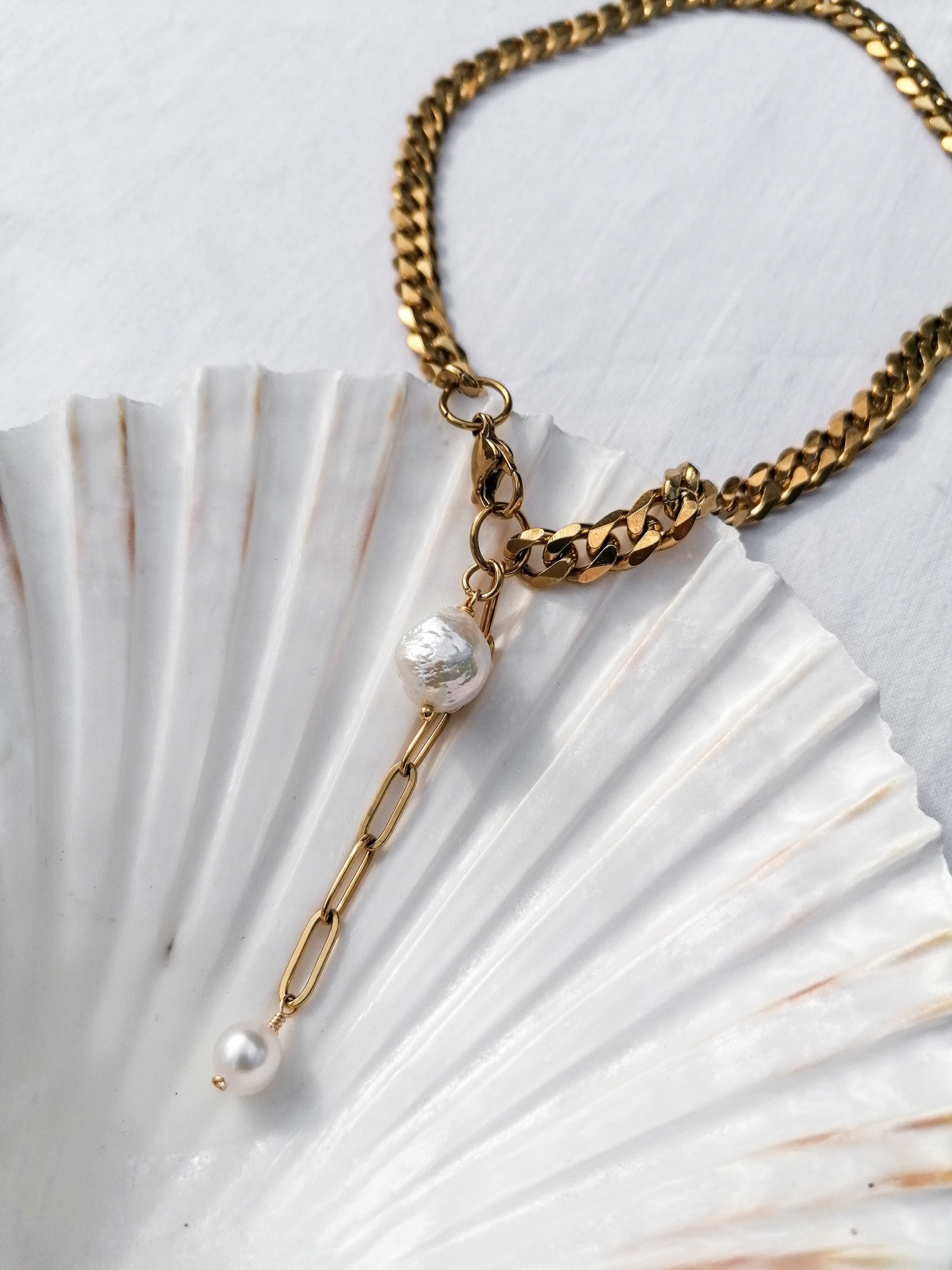 A striking necklace with pearl pendants that you can wear every day without worry thanks to the durable and waterproof PVD gold plating.