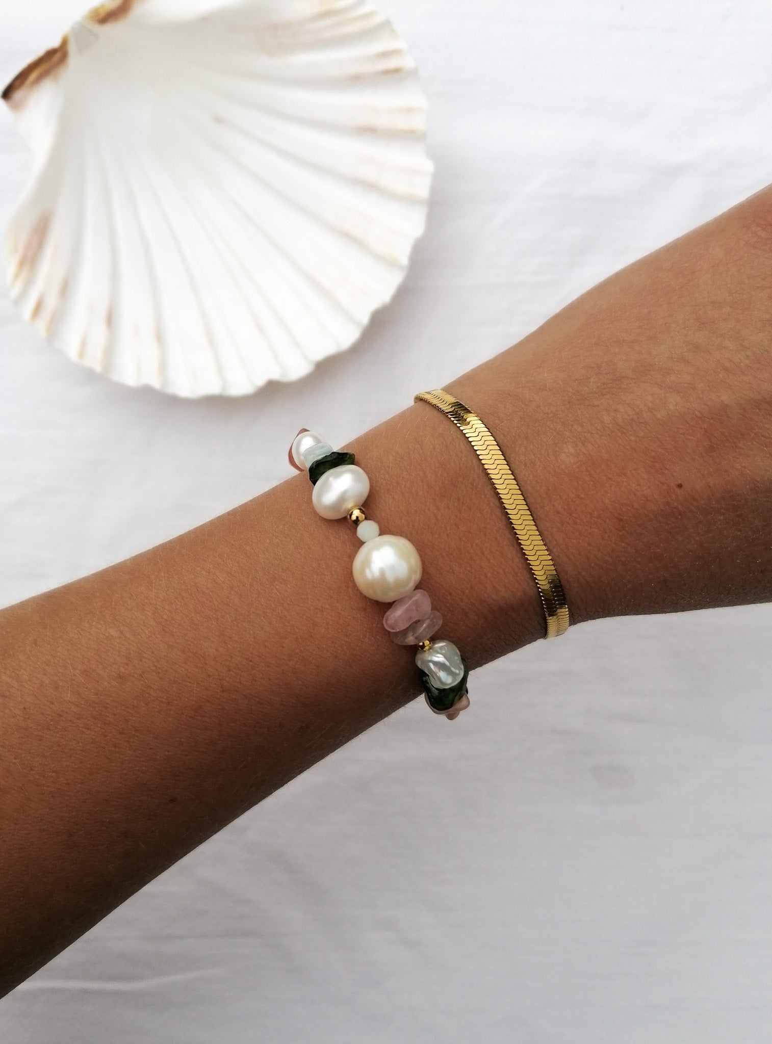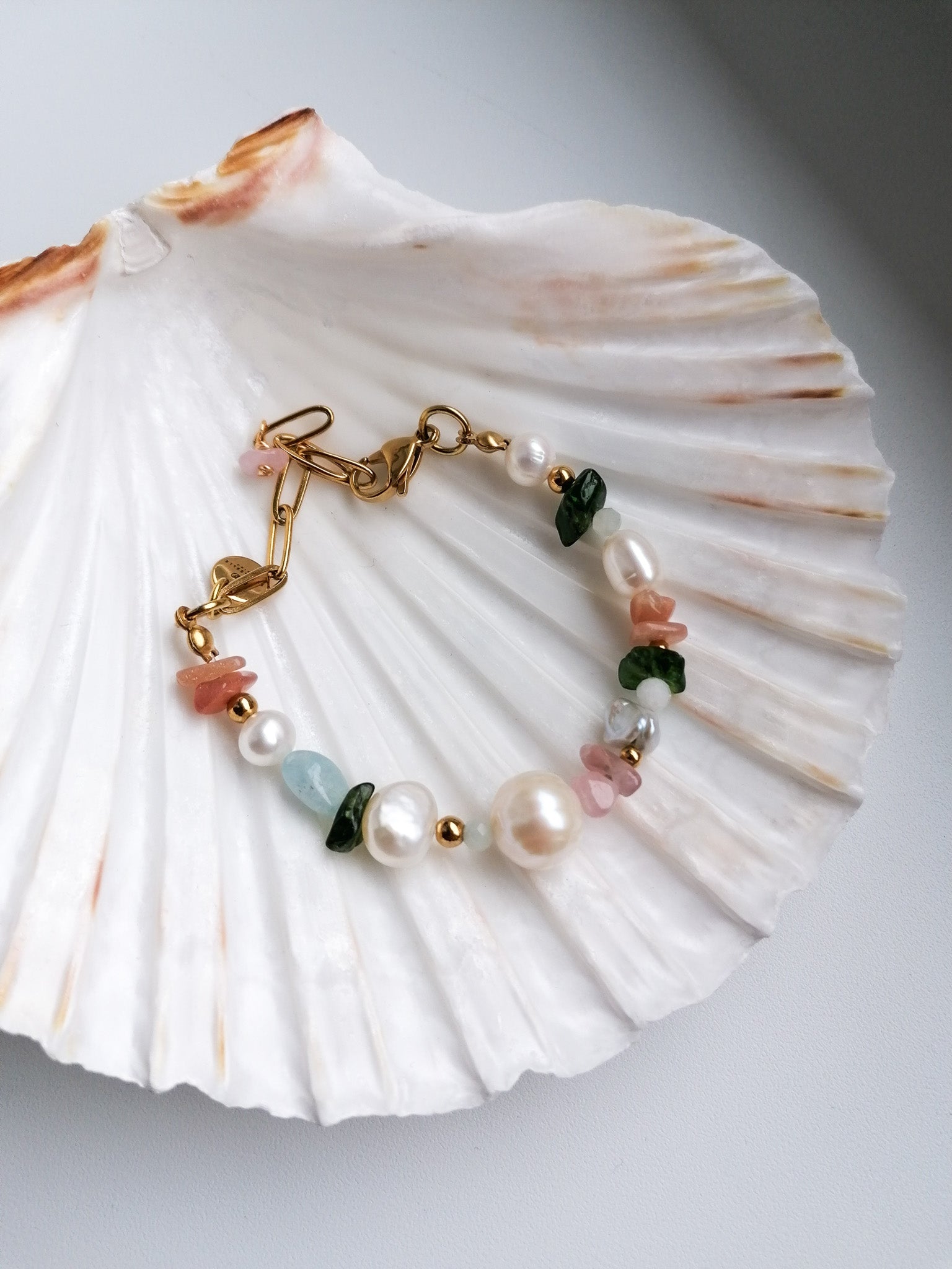 On the bracelet you will find various freshwater pearls, keshi pearls, chrome diopside, rose quartz, aquamarine, amazonite, moonstone and sunstone