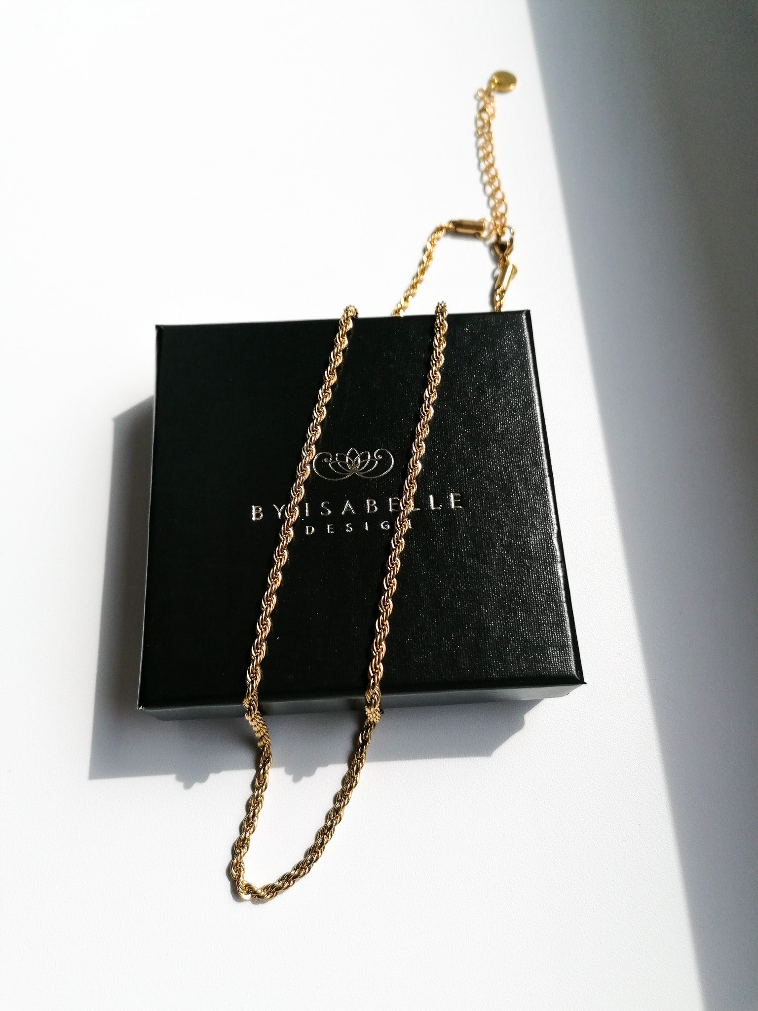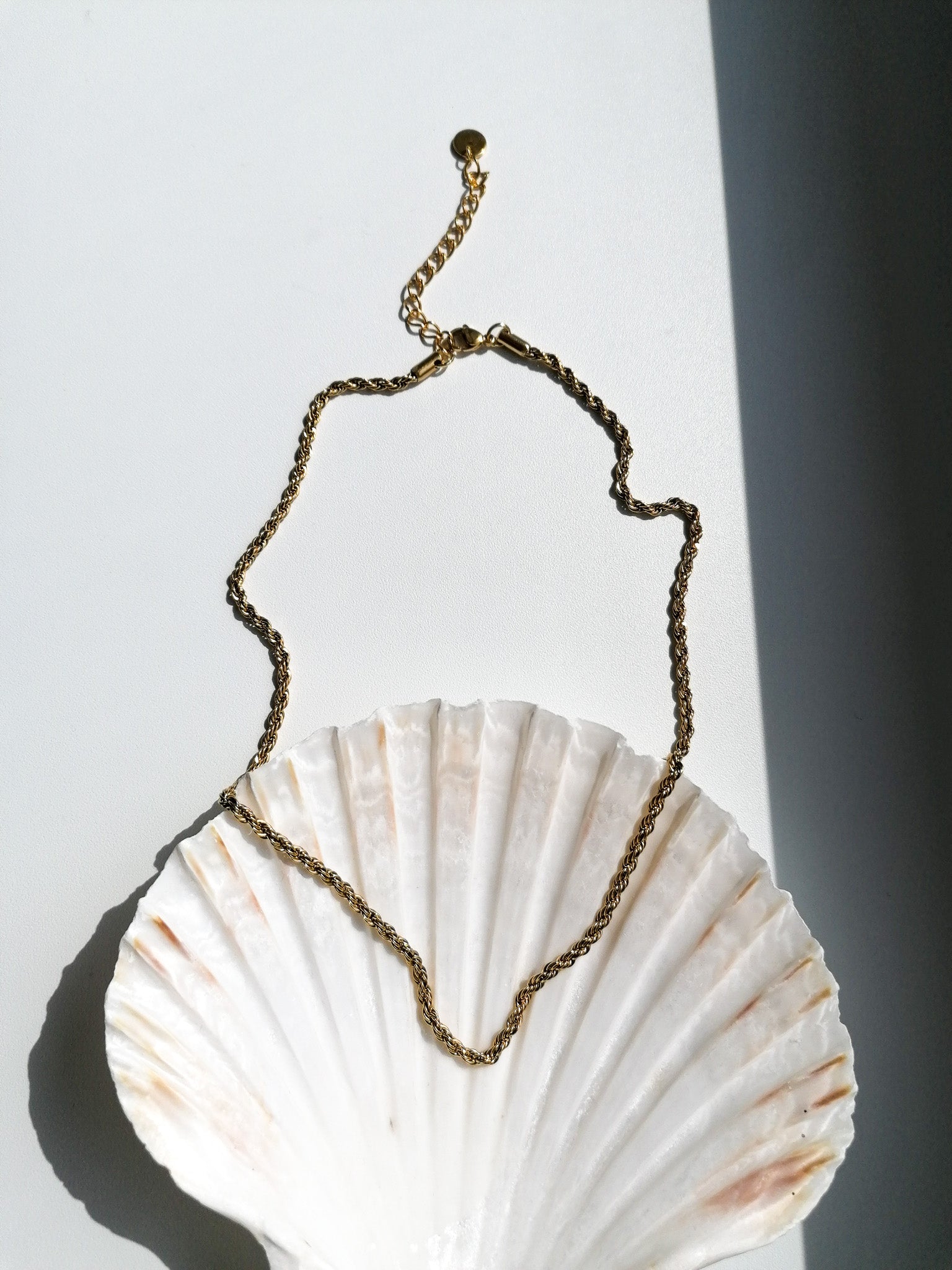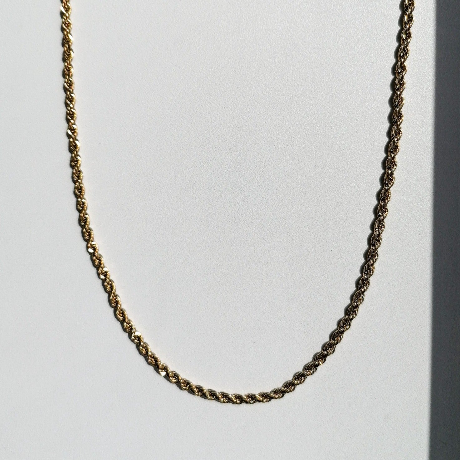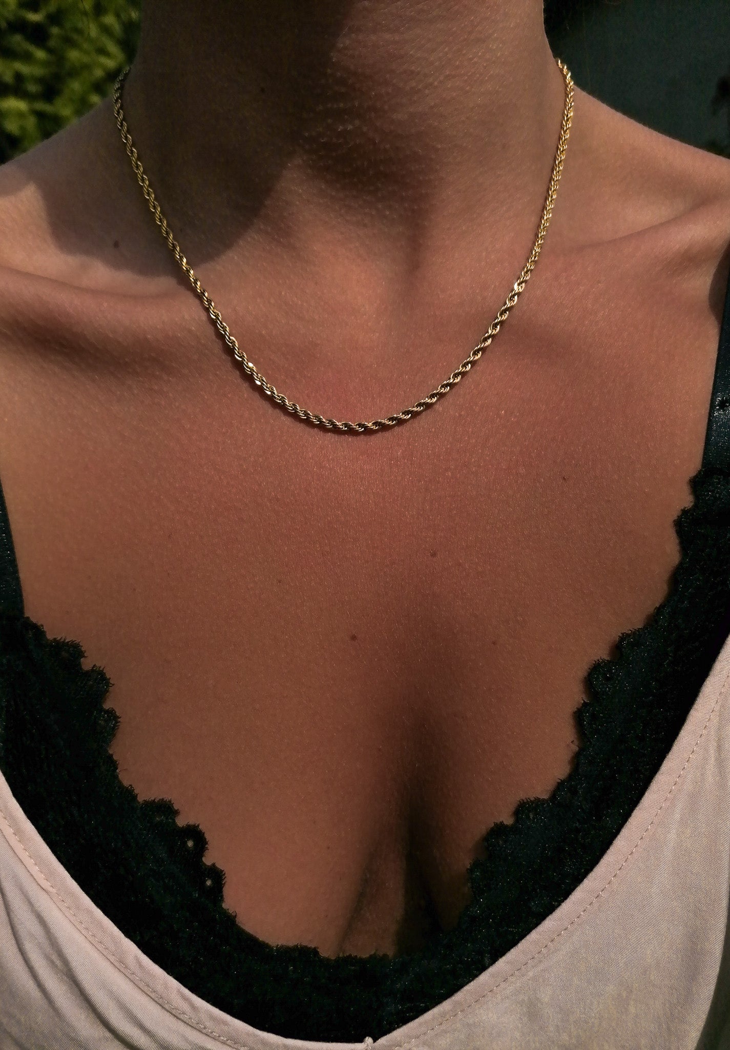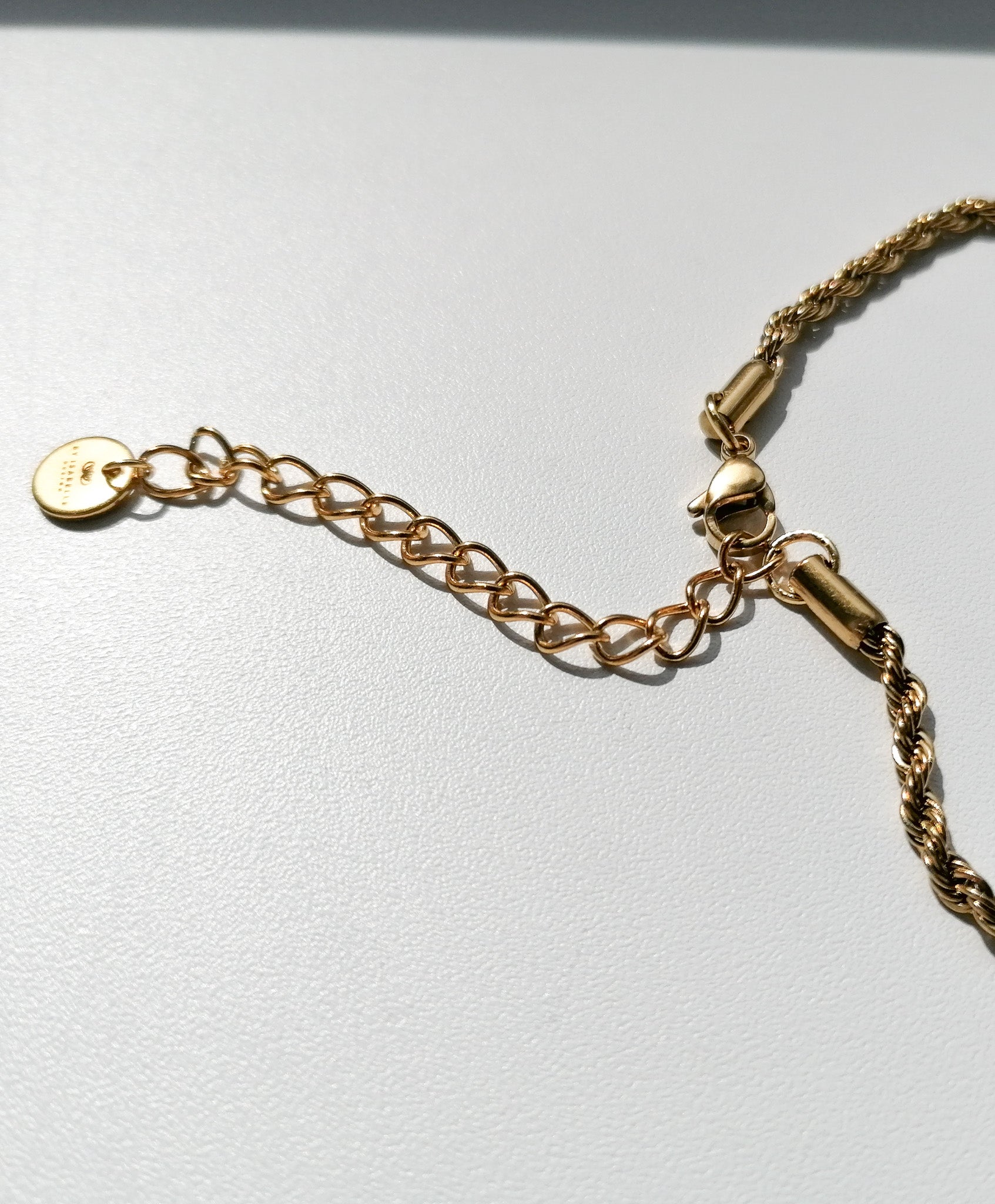 The twisted rope chain has an adjustable length, making it suitable for layering with other jewelry.