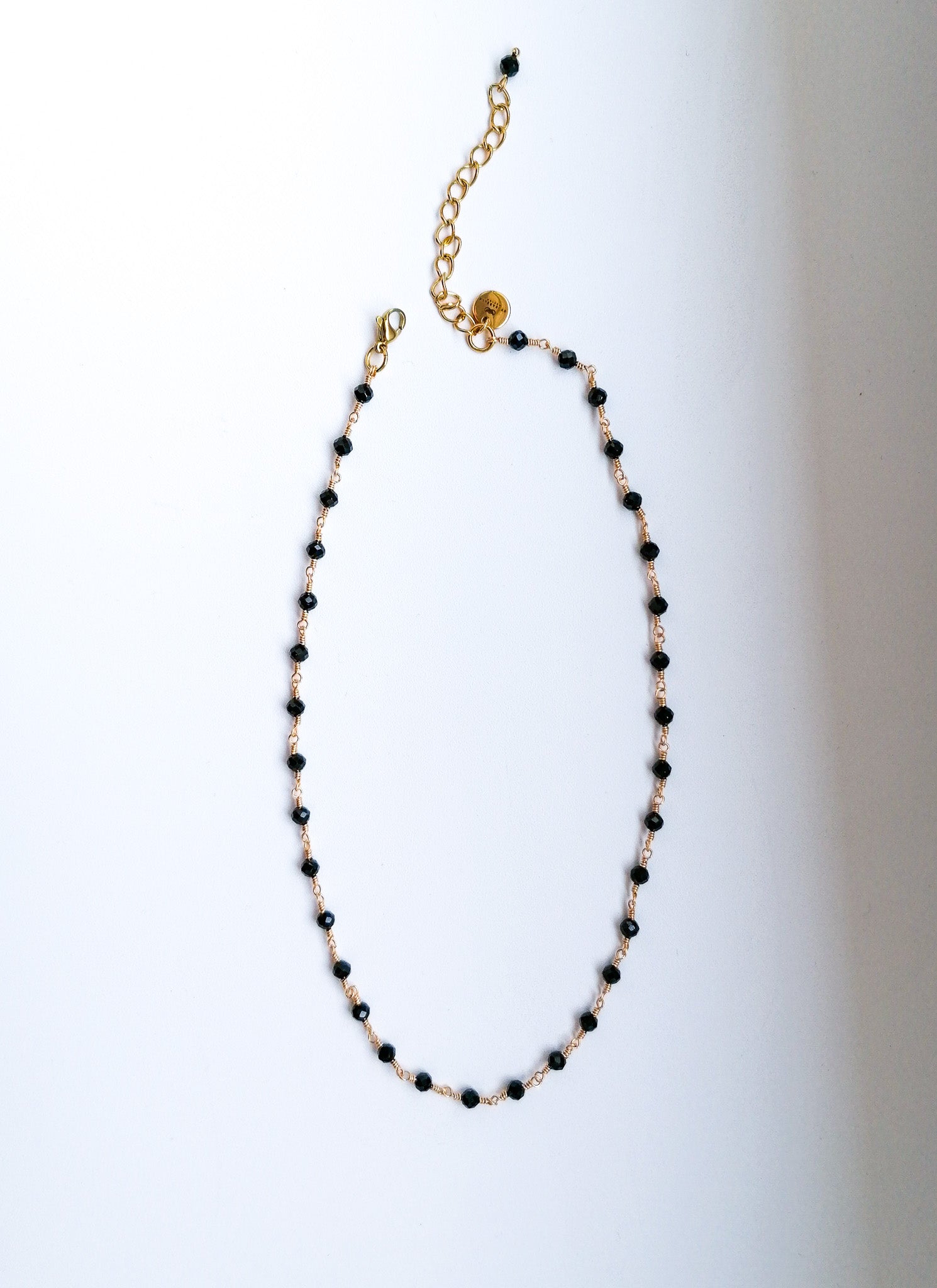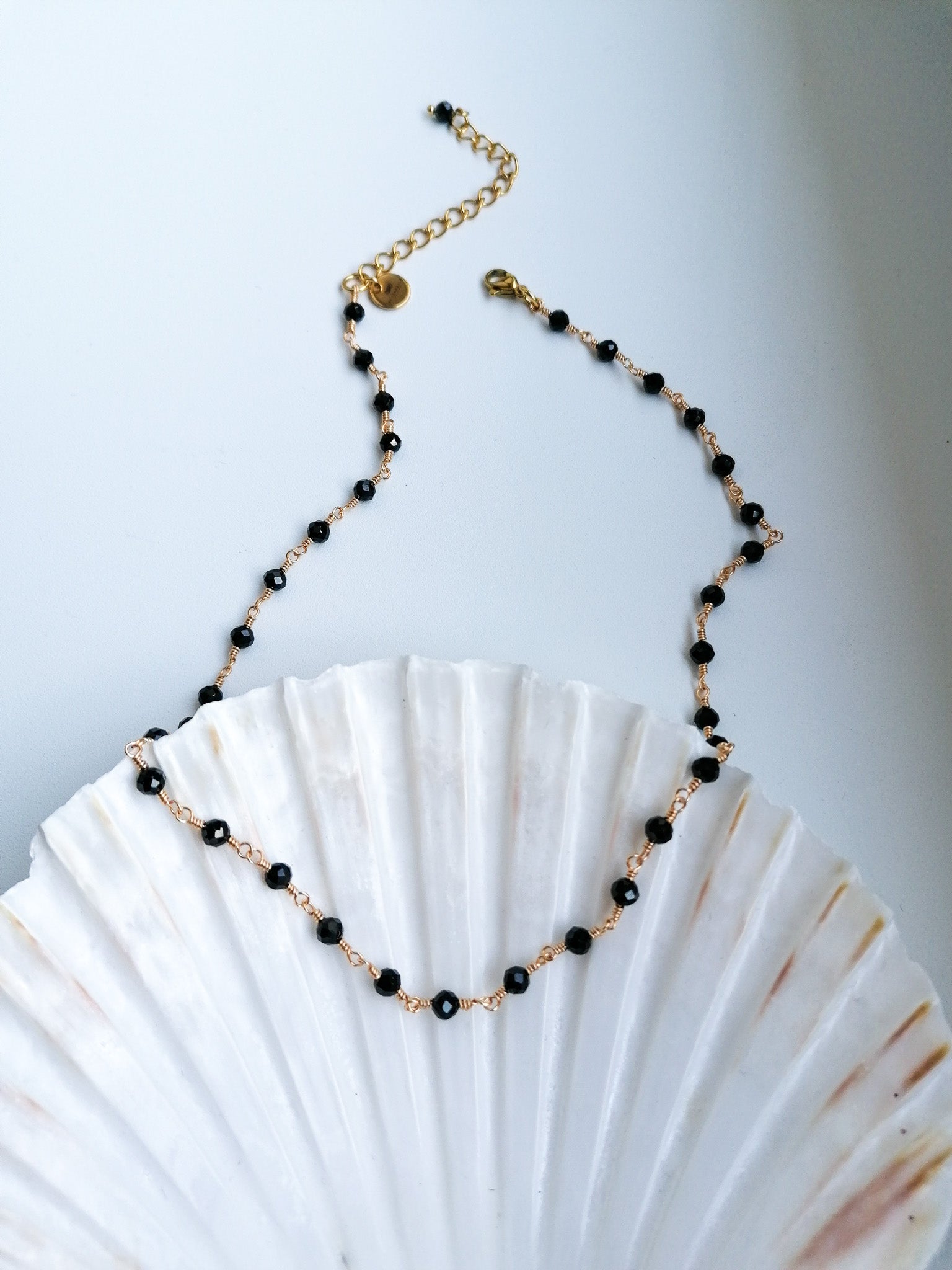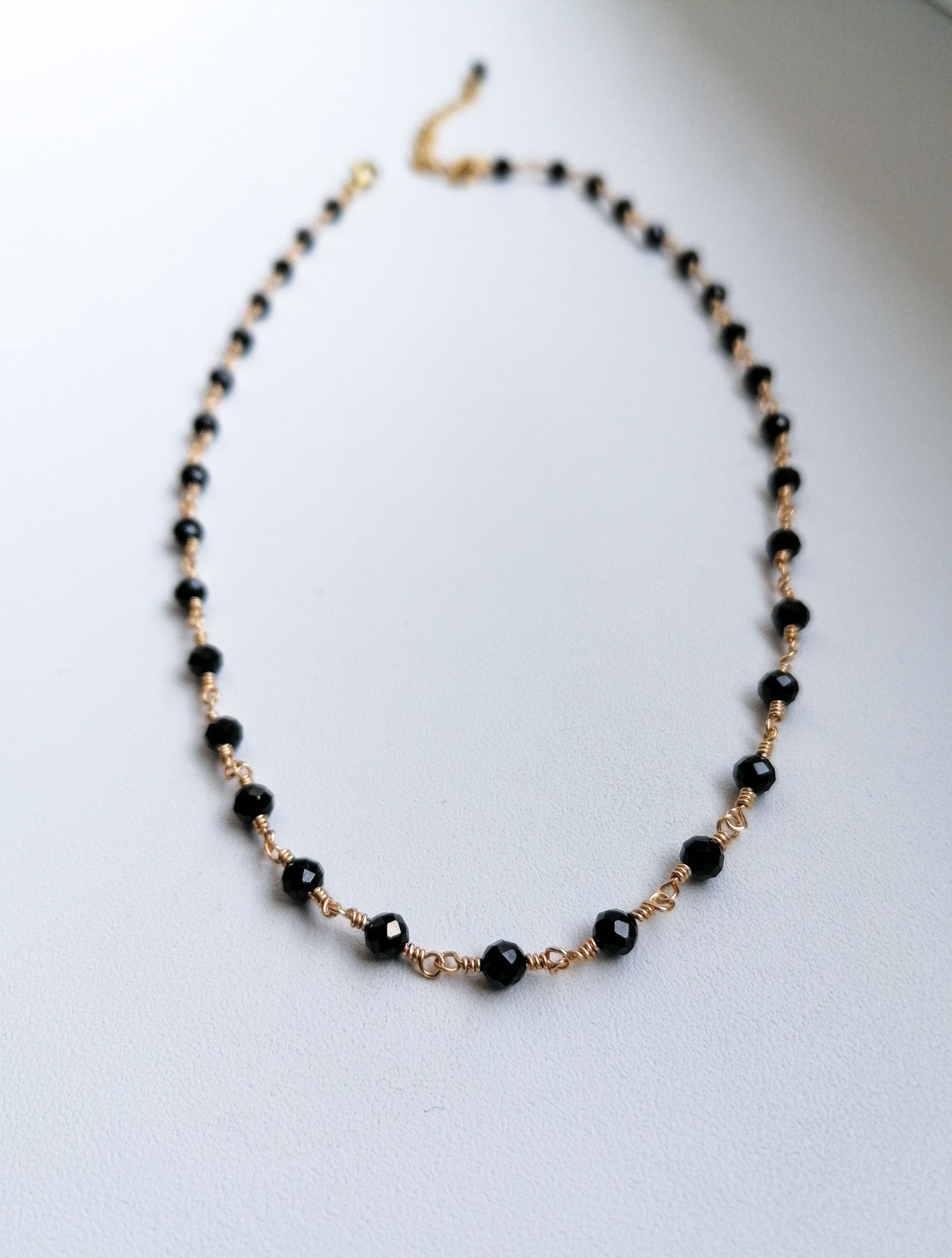 Necklace made of cut black spinel (gemstone) hand-stitched with jewelry wire in a rosary style