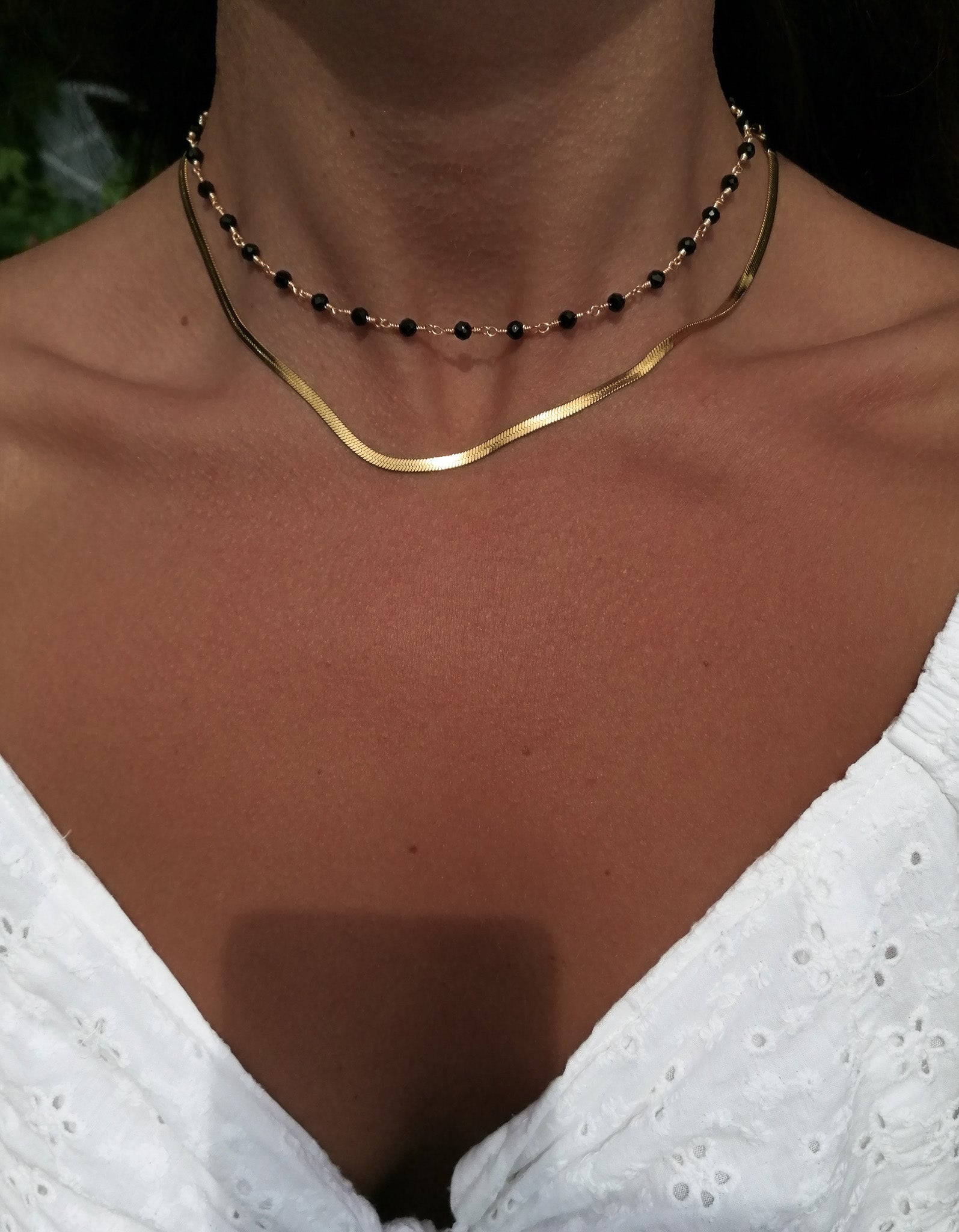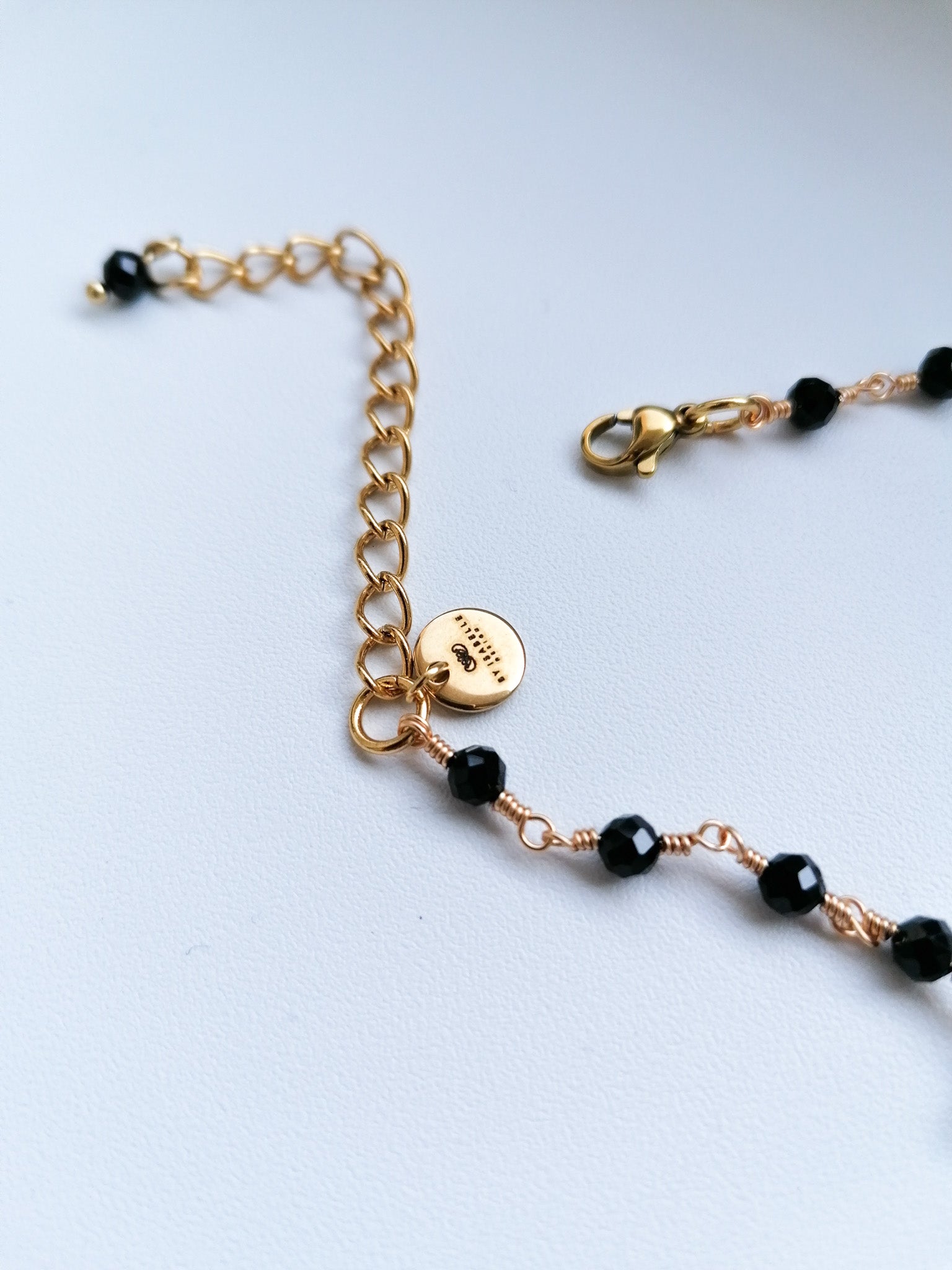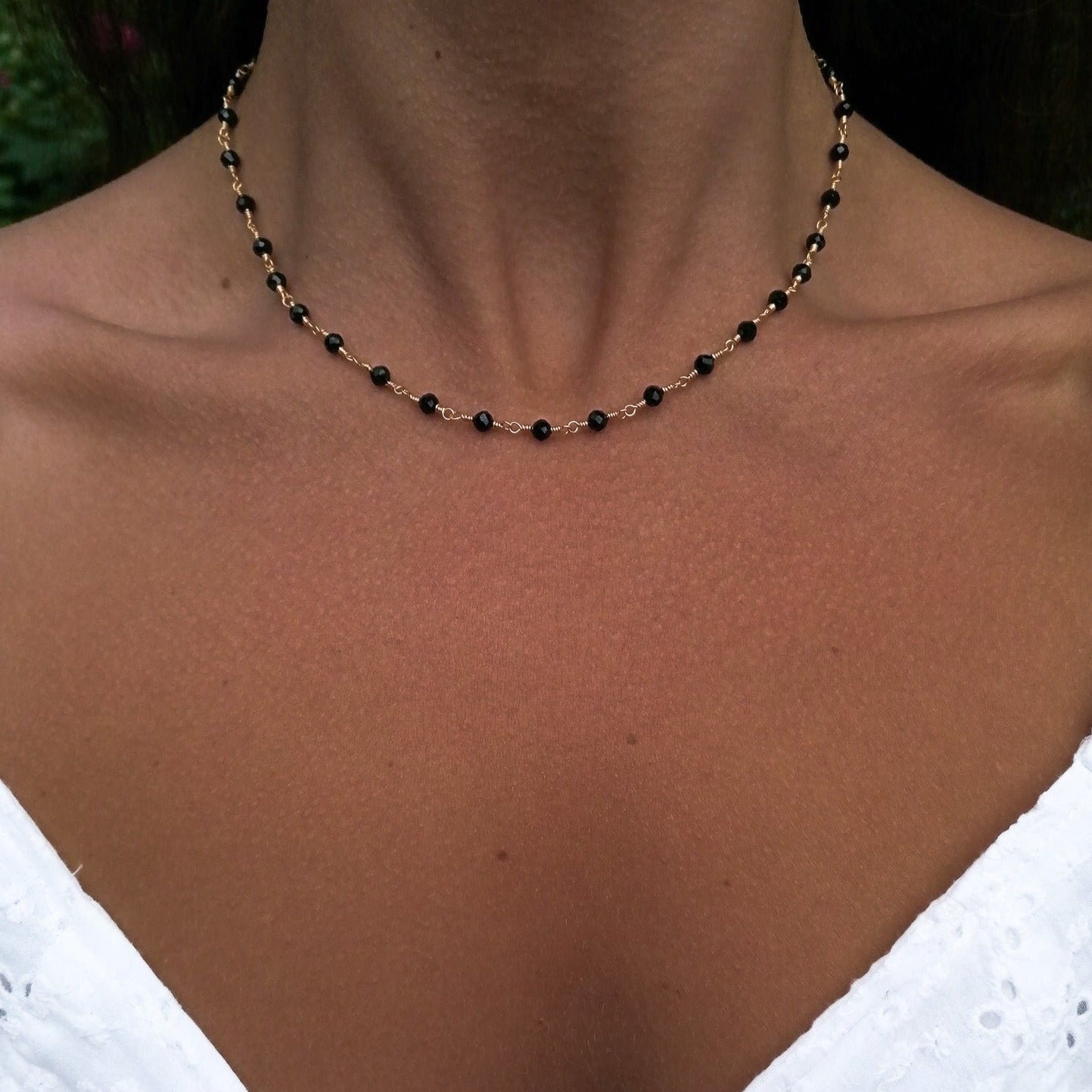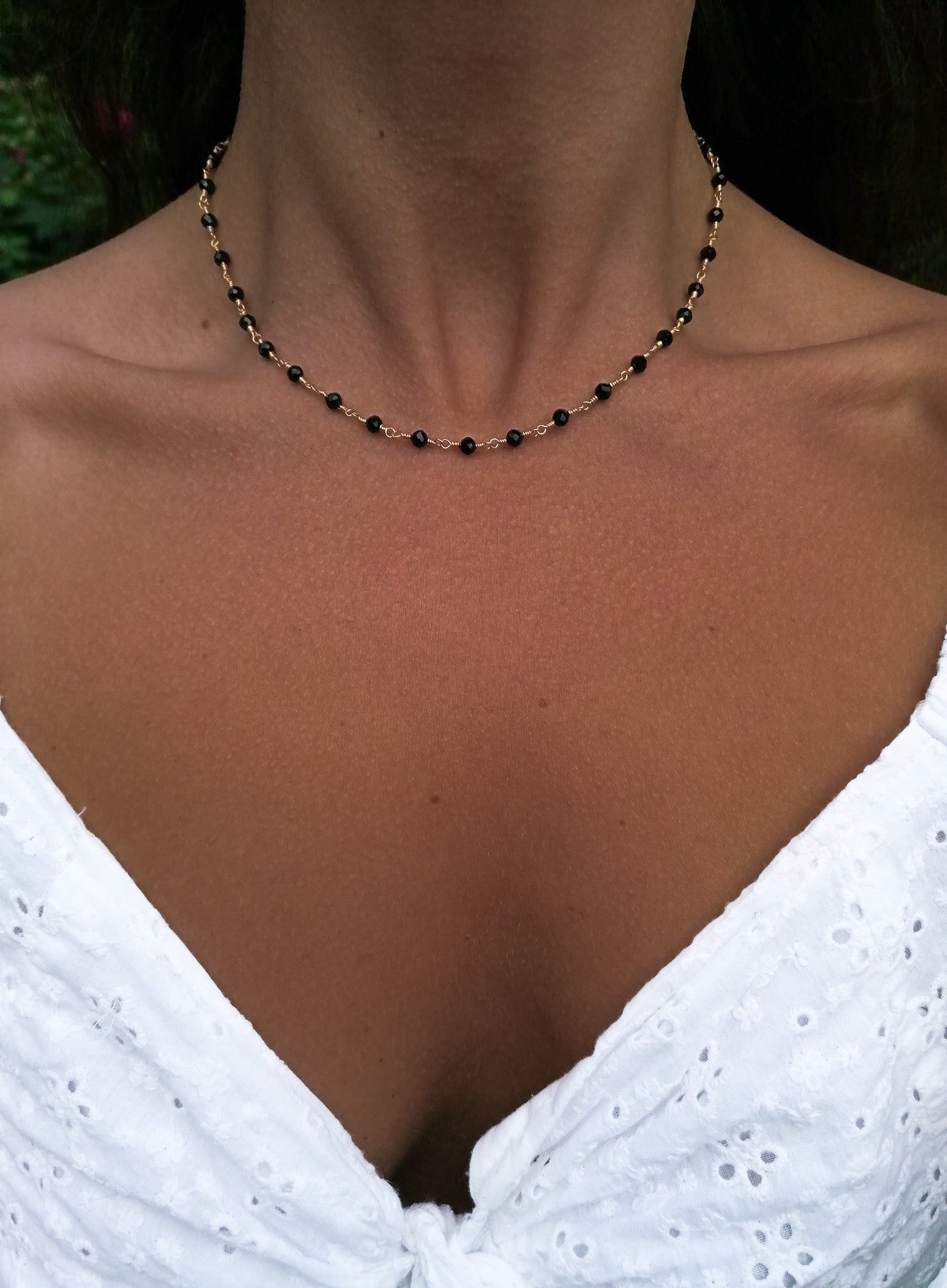 Necklace made of cut black spinel (gemstone) hand-stitched with jewelry wire in a rosary style