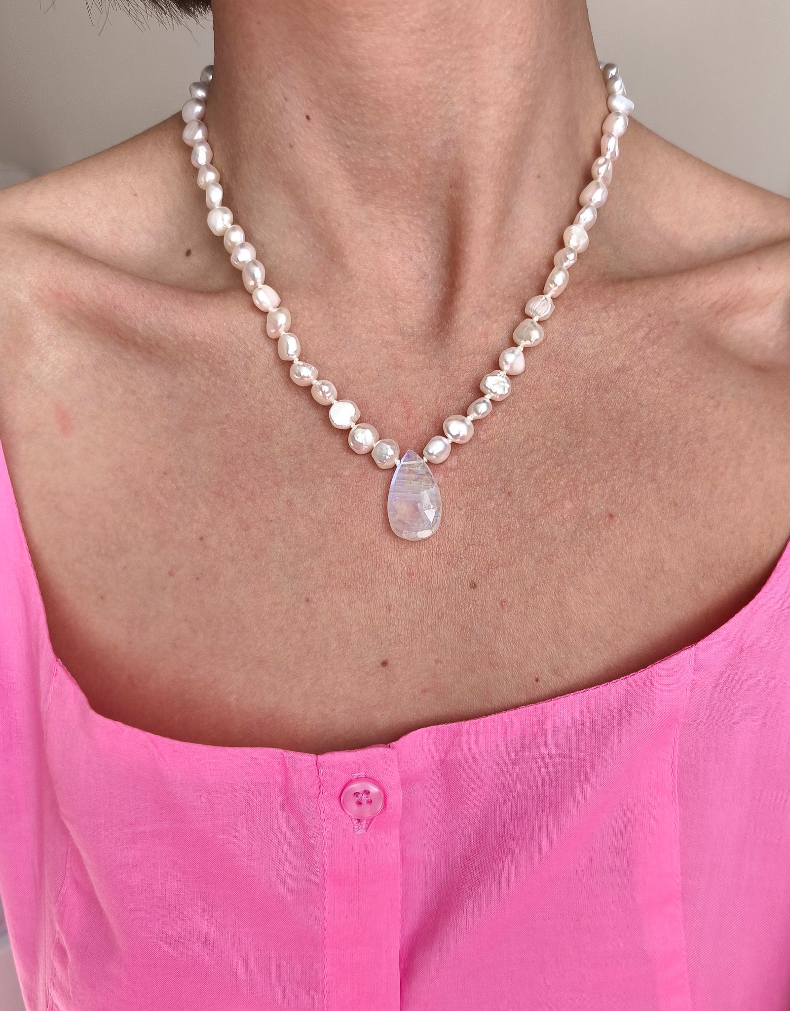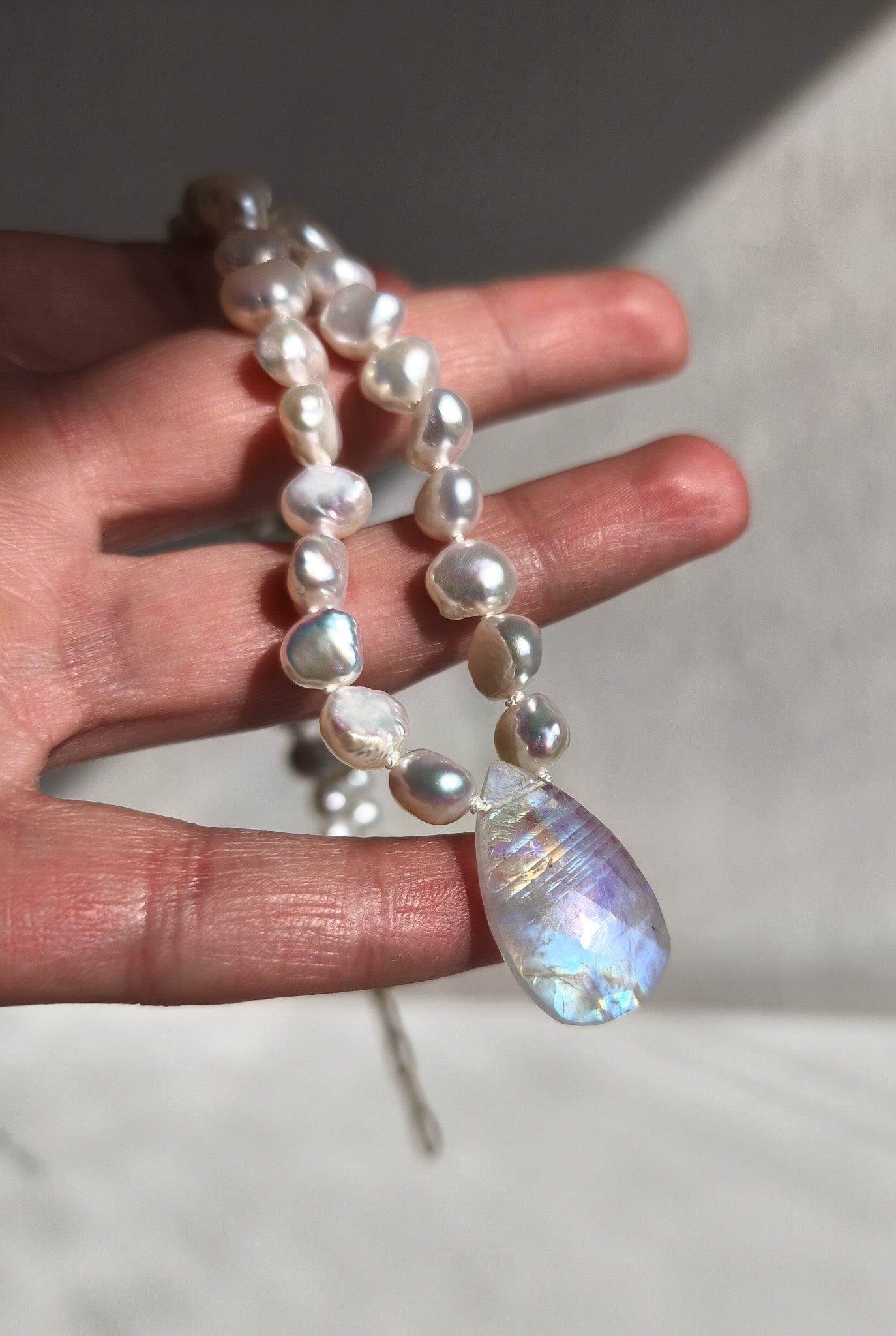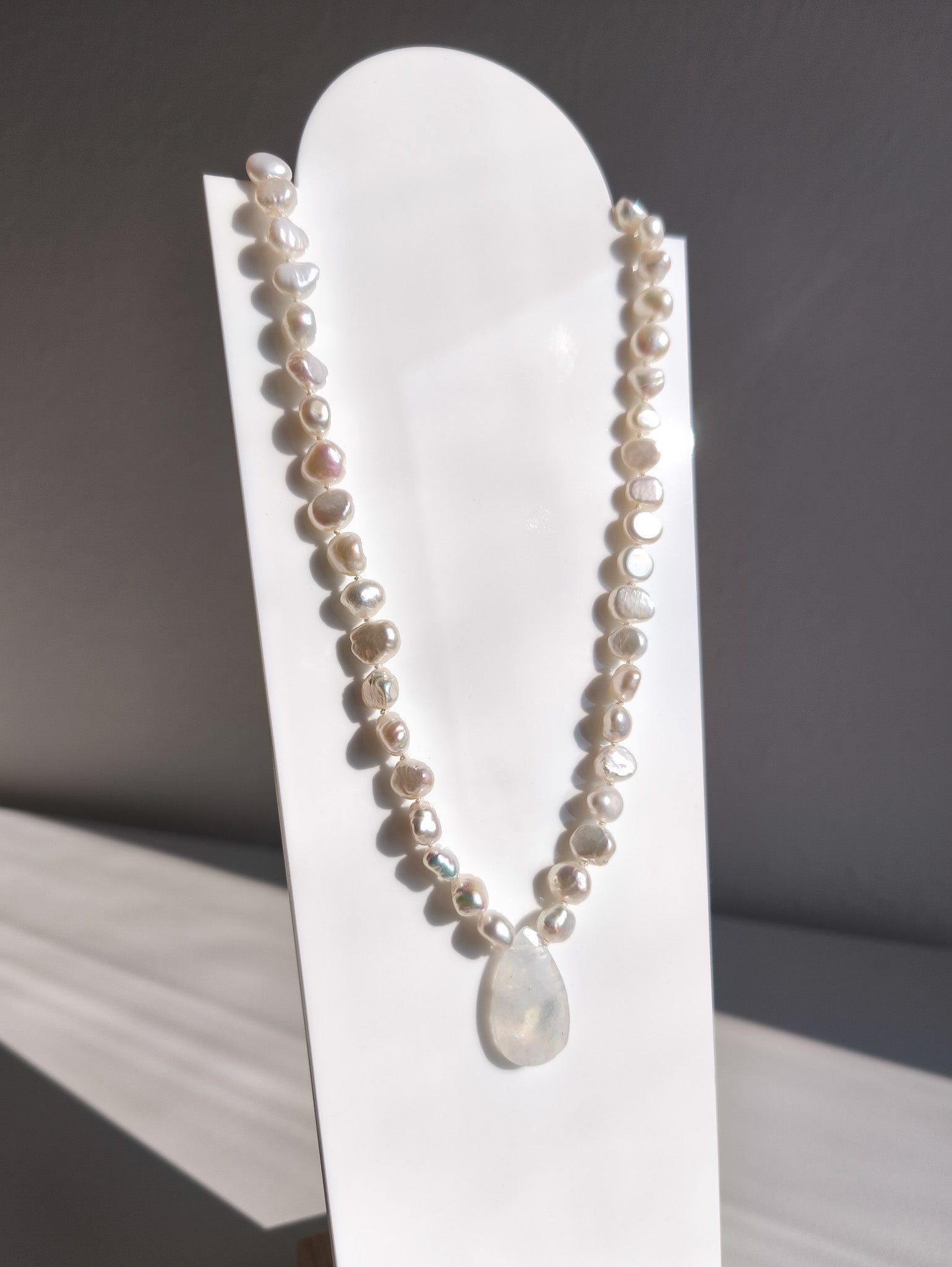 Freshwater baroque pearls hand-knotted with silk and a drop-shaped moonstone pendant