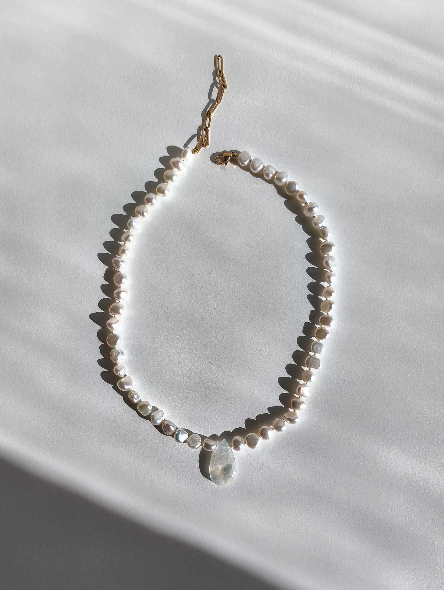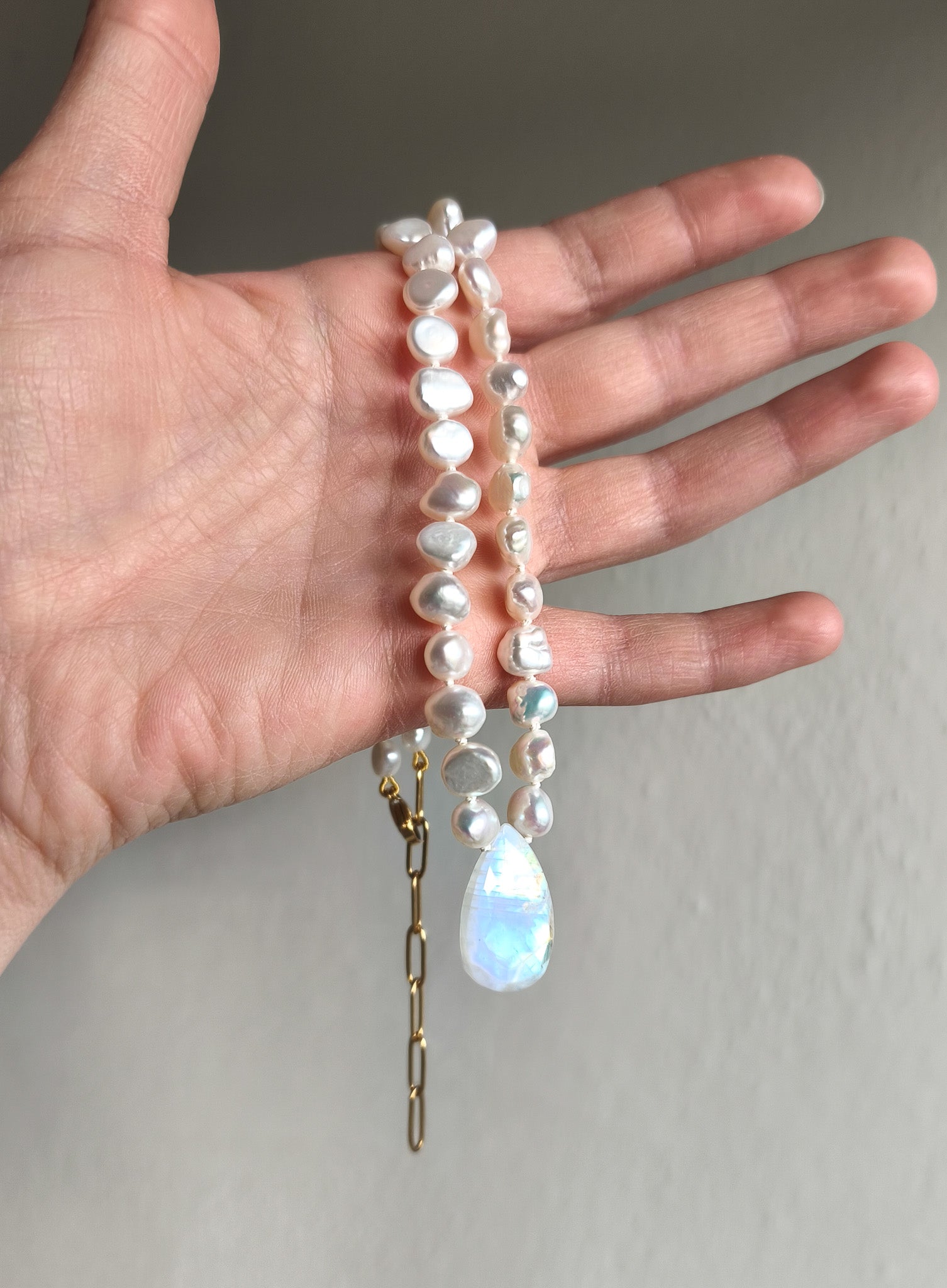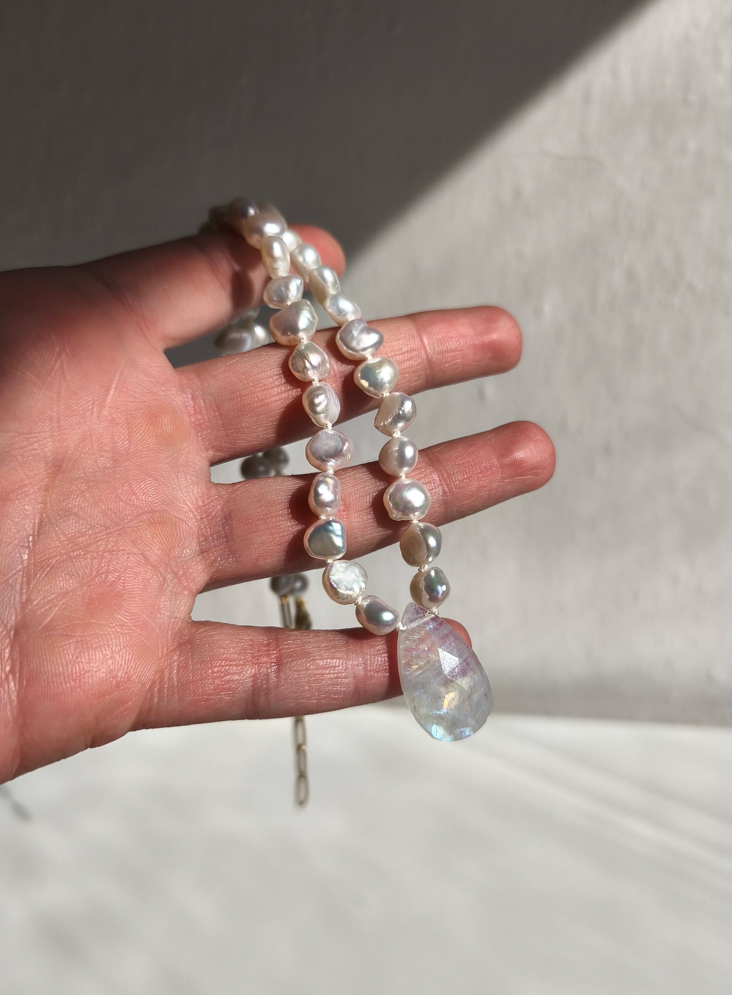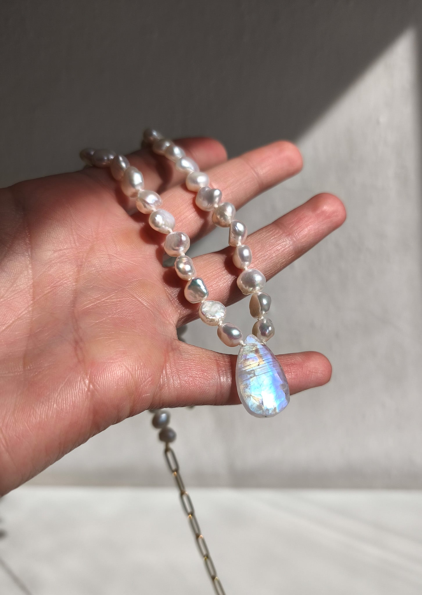 Freshwater baroque pearls hand-knotted with silk and a drop-shaped moonstone pendant