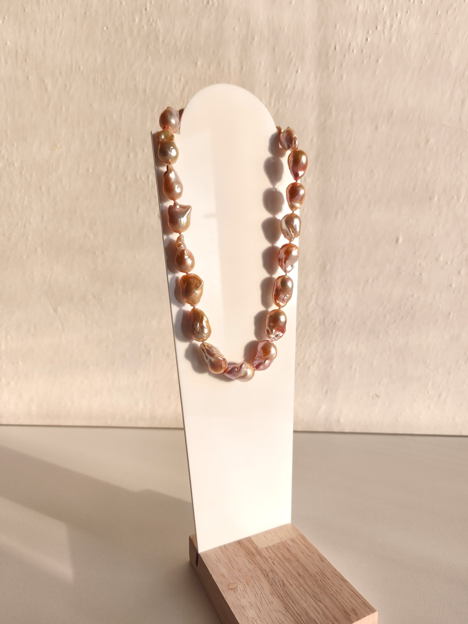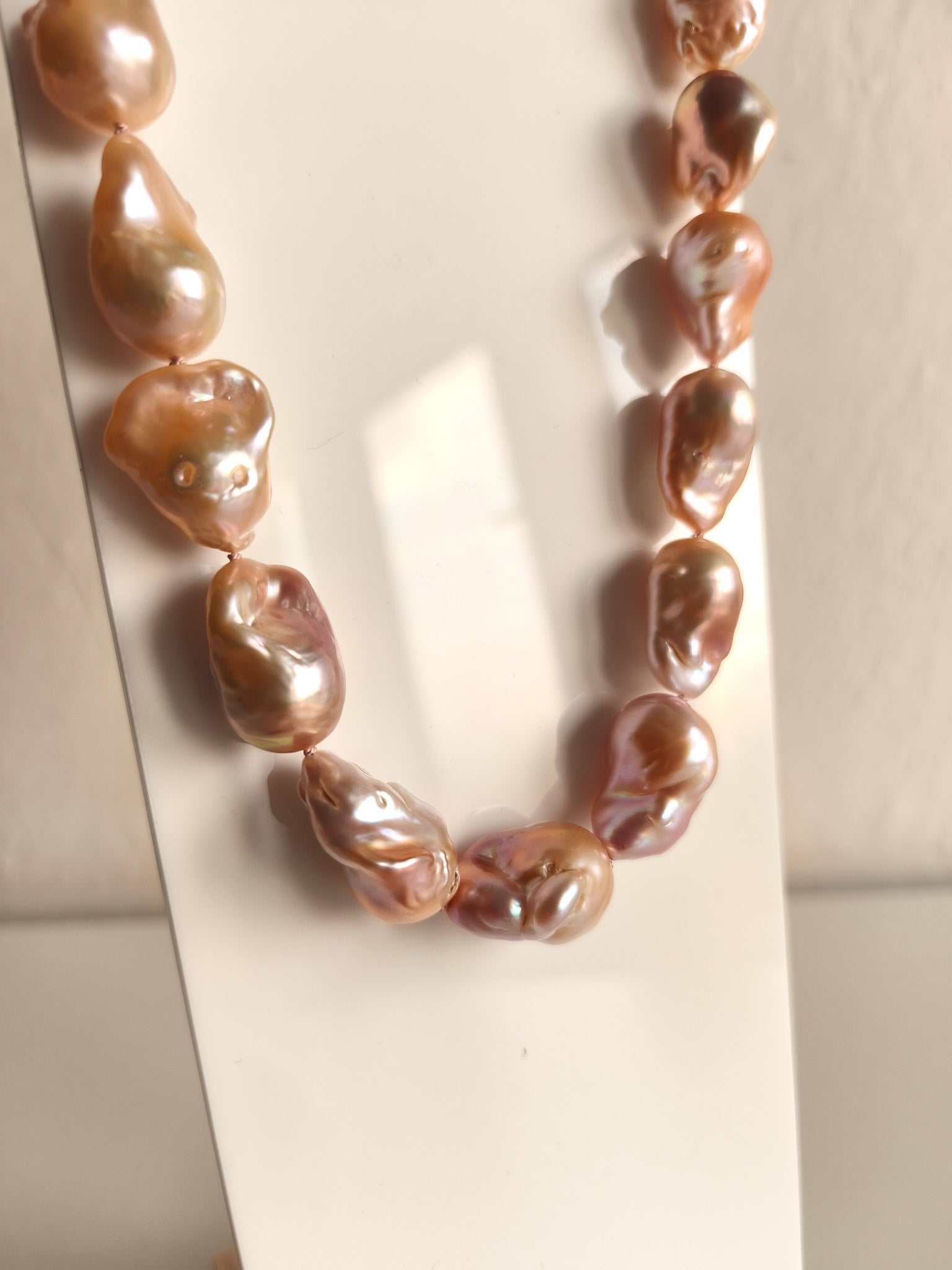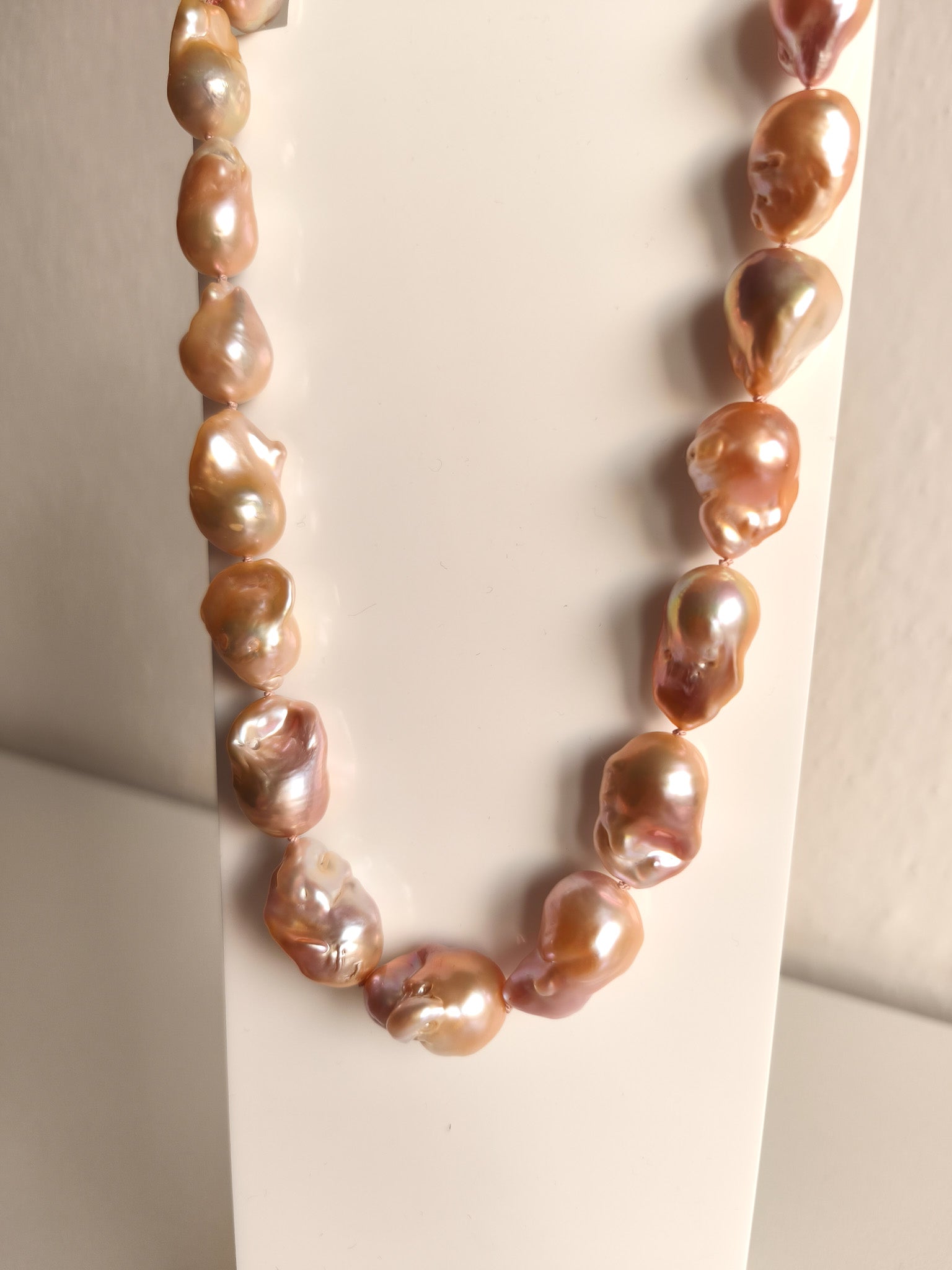 Large freshwater baroque pearls in orange and pink tones tied with 100% silk