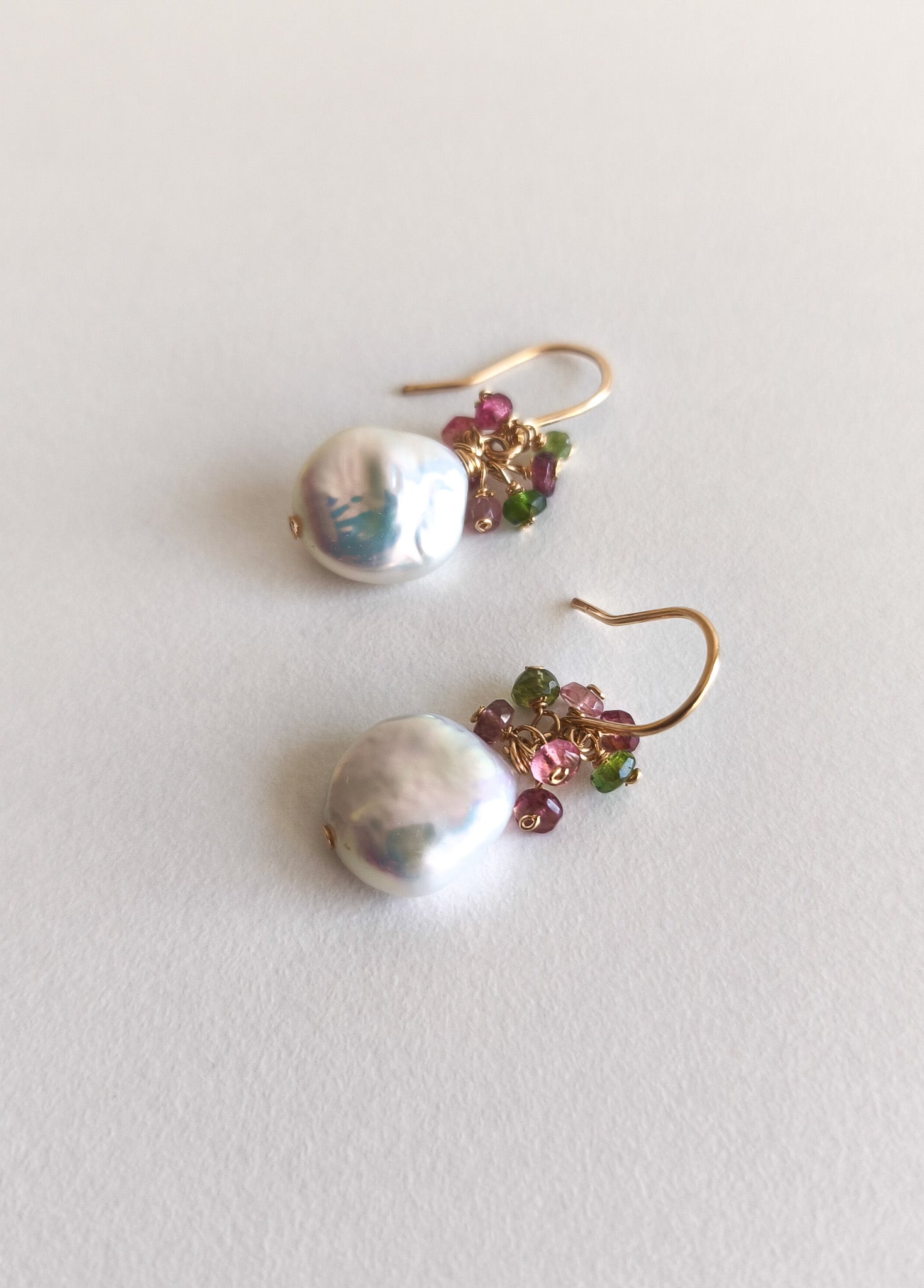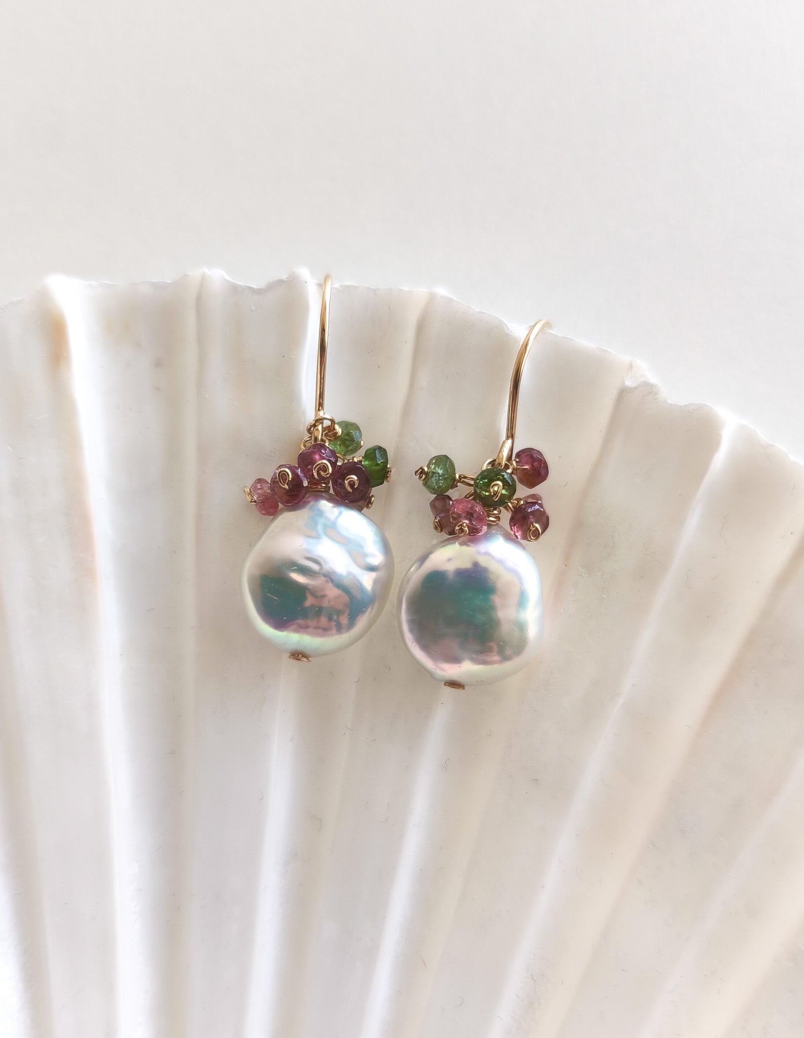 High-gloss Keshi pearls adorned with pink and green tourmaline
