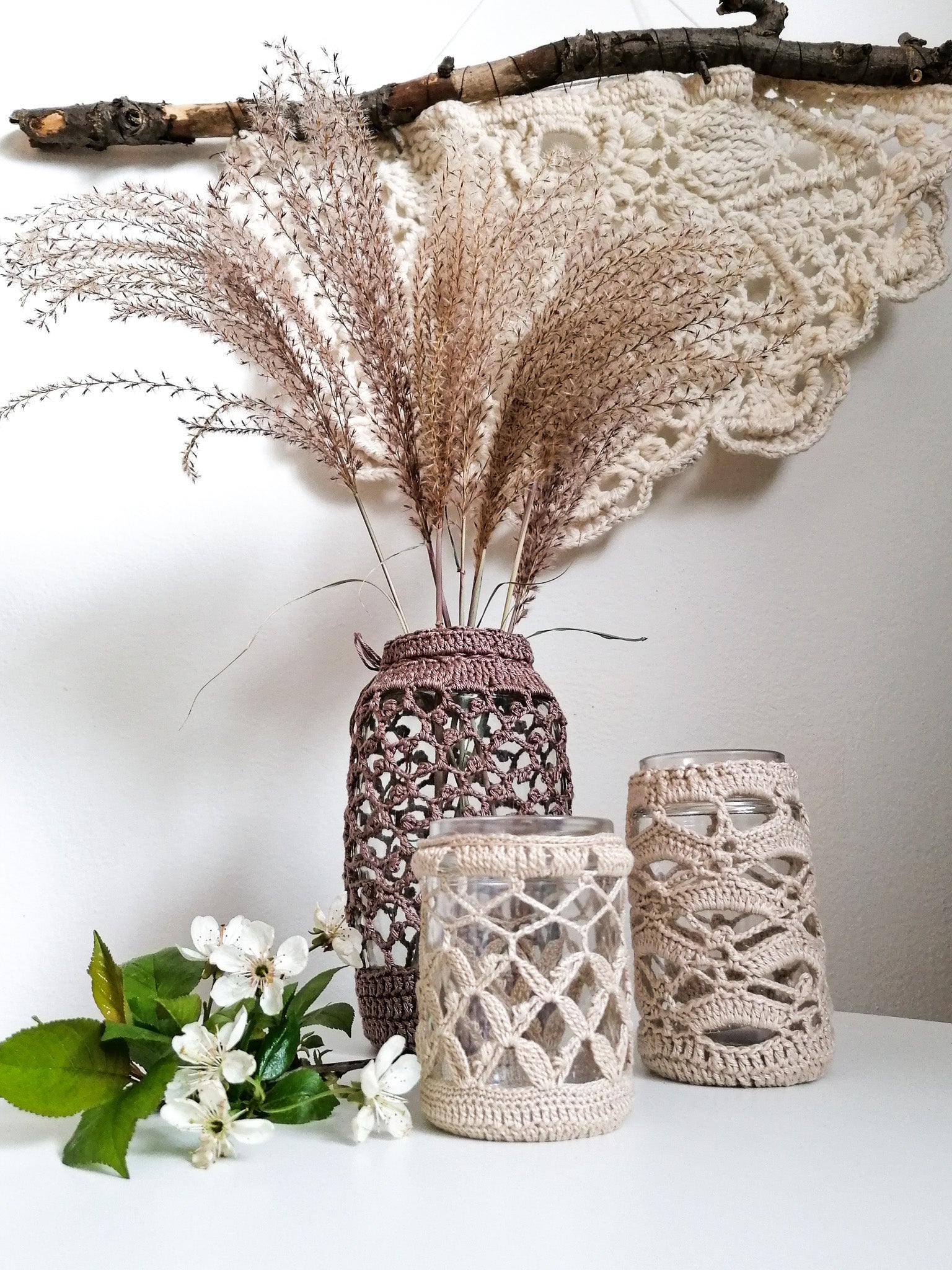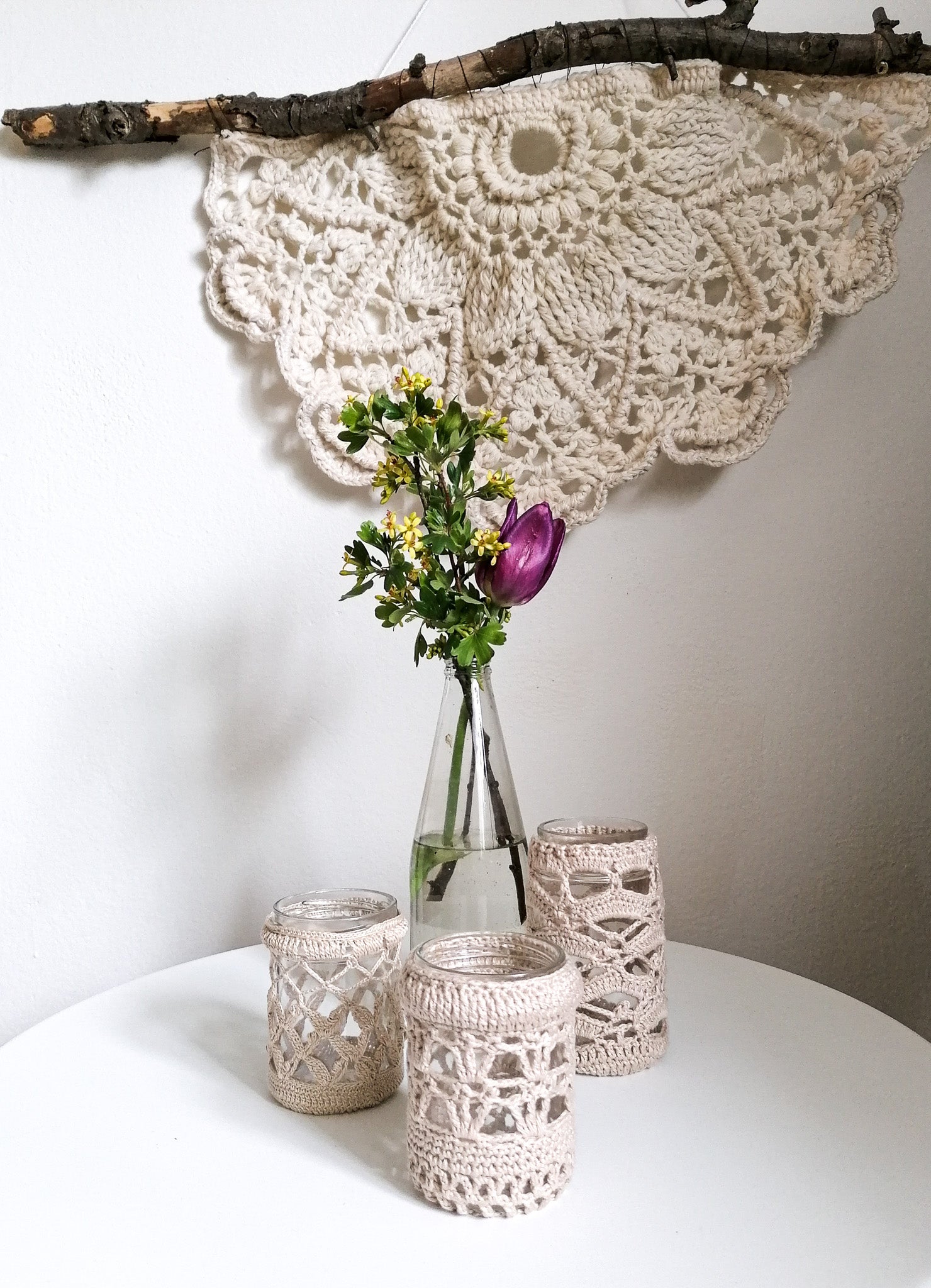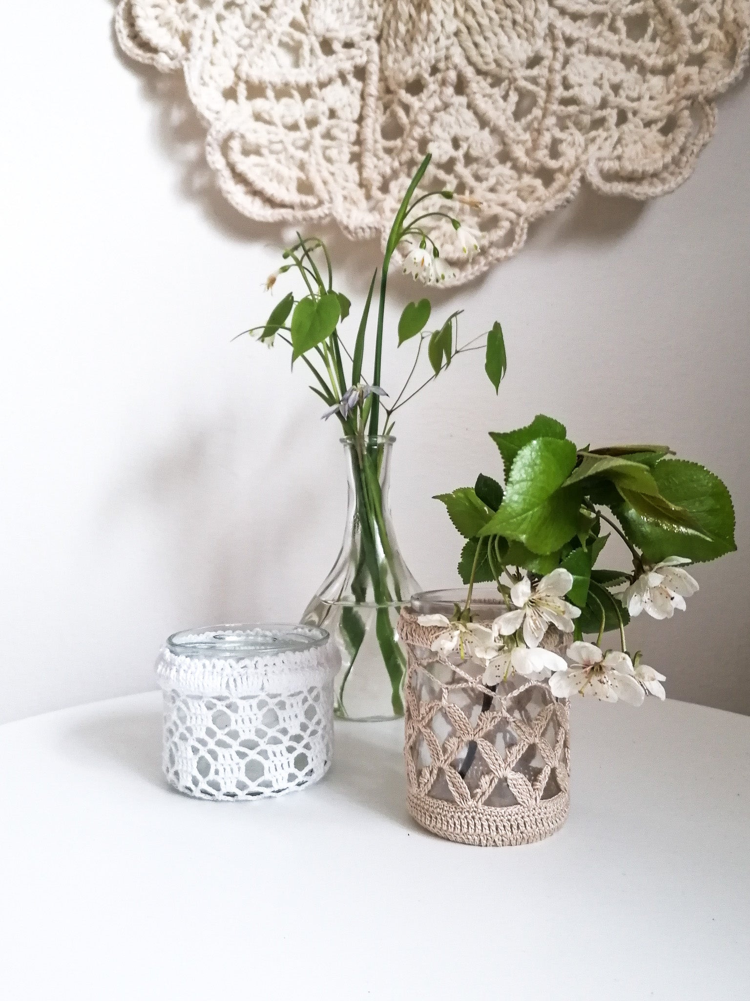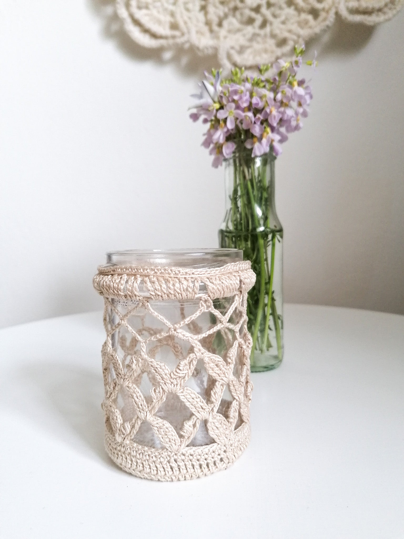 The crocheted cover can be removed and washed, and the glass can be washed if necessary.