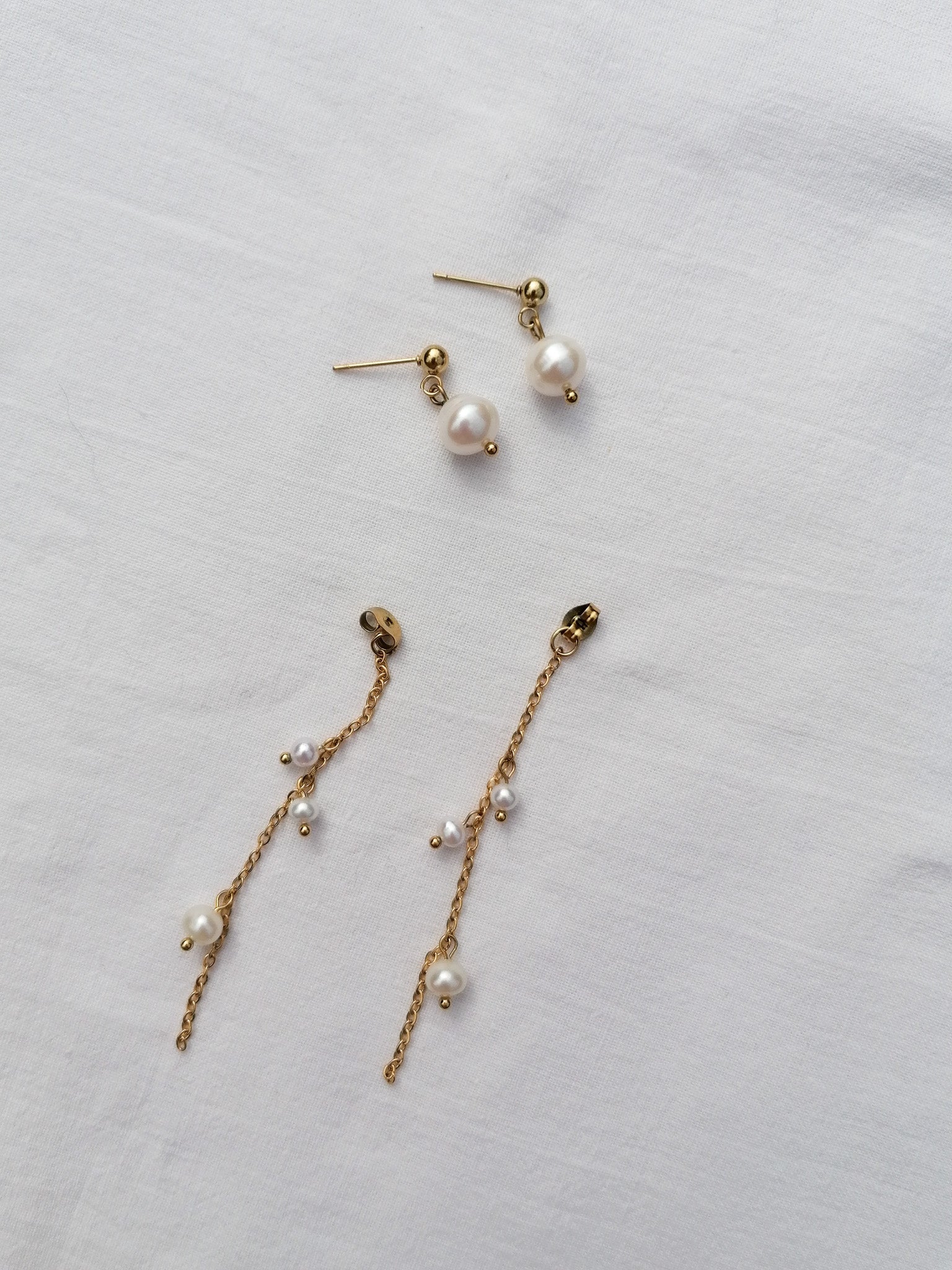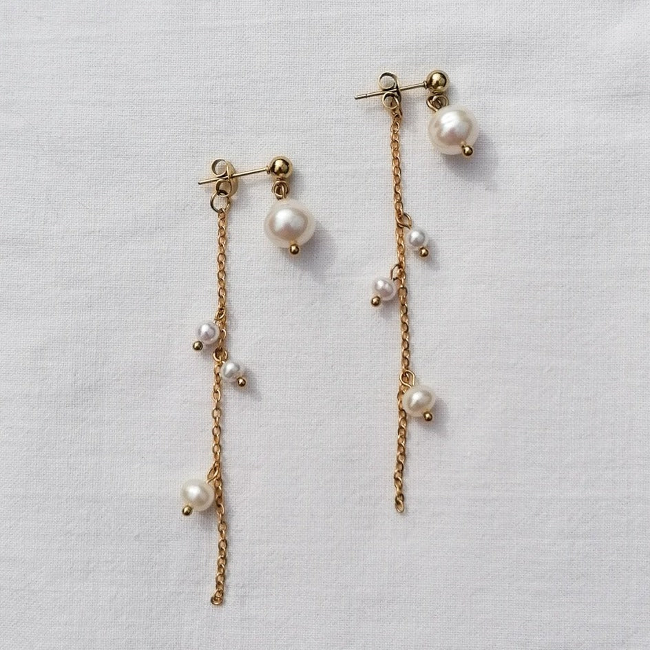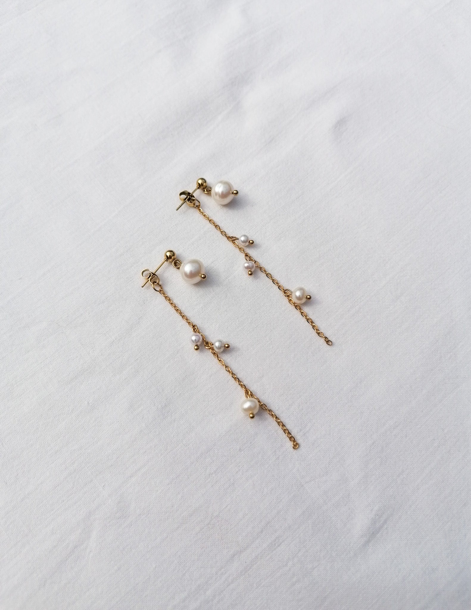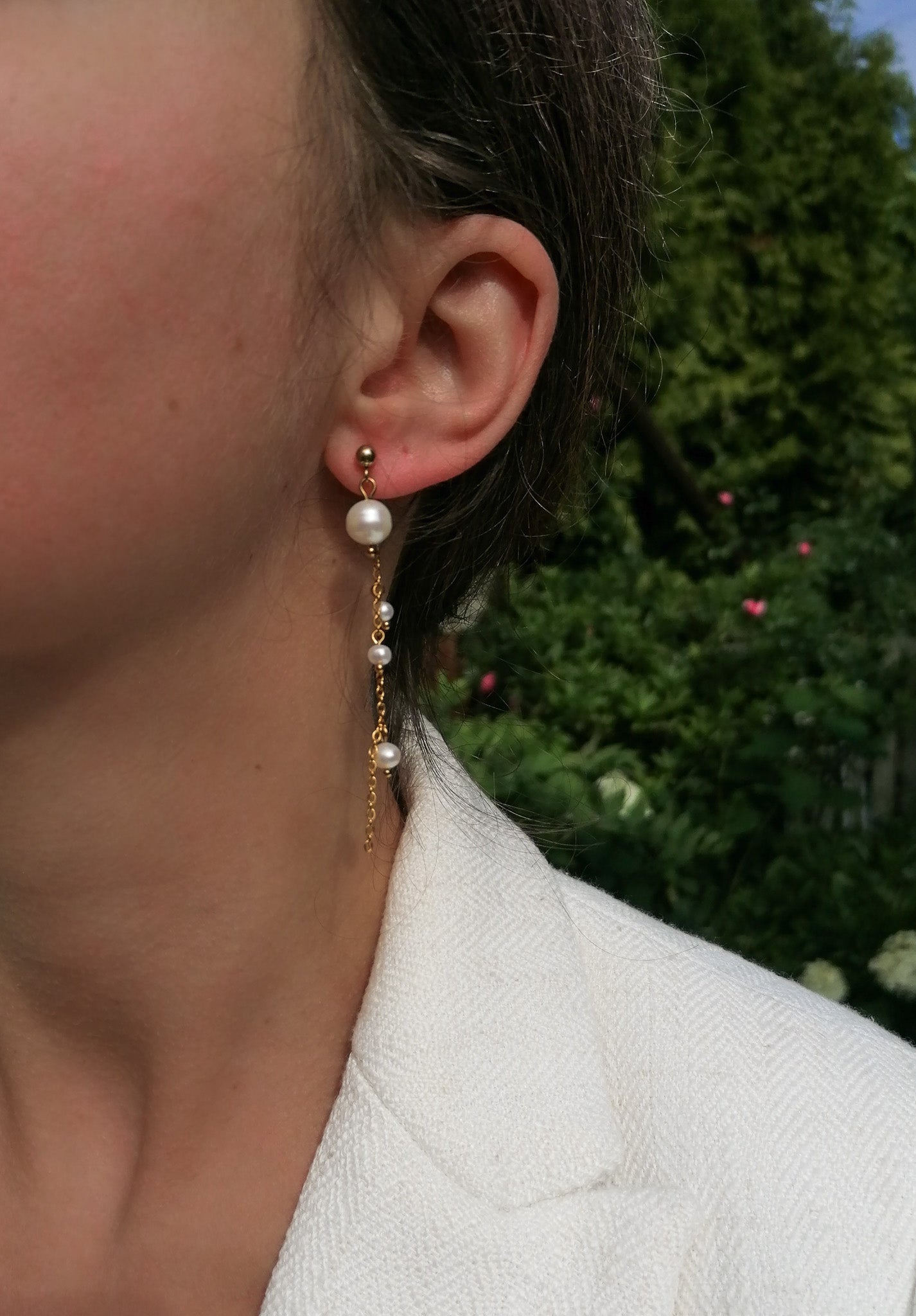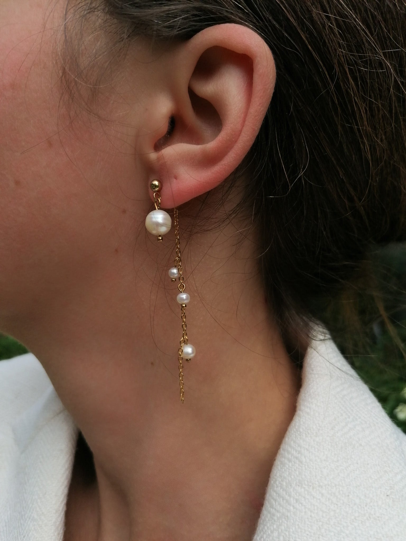 The earrings can be worn in two ways - with a long chain decorated with small freshwater pearls for fastening or just as simple pearl studs (you will also receive a second fastening without a chain)