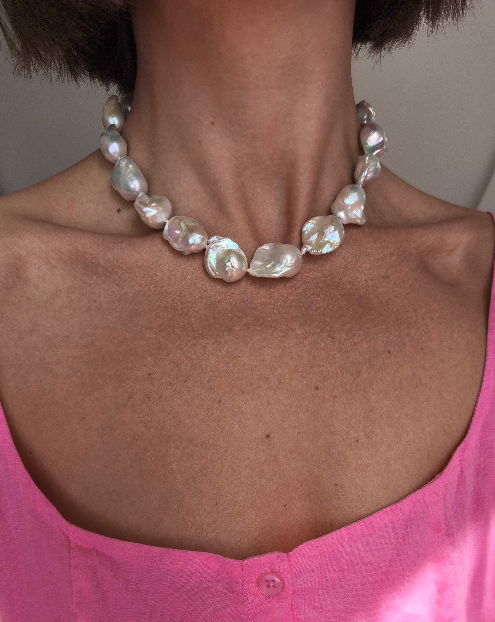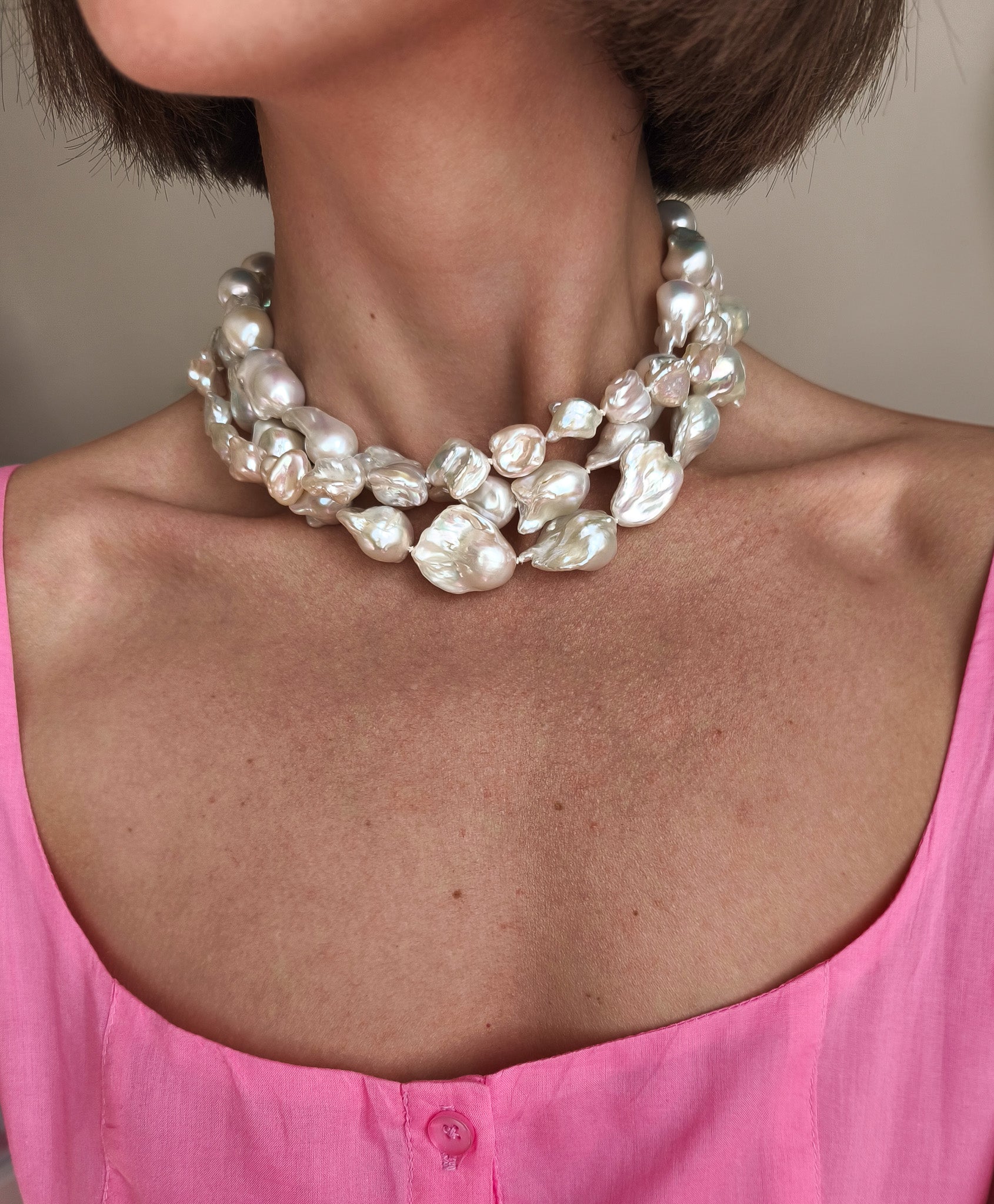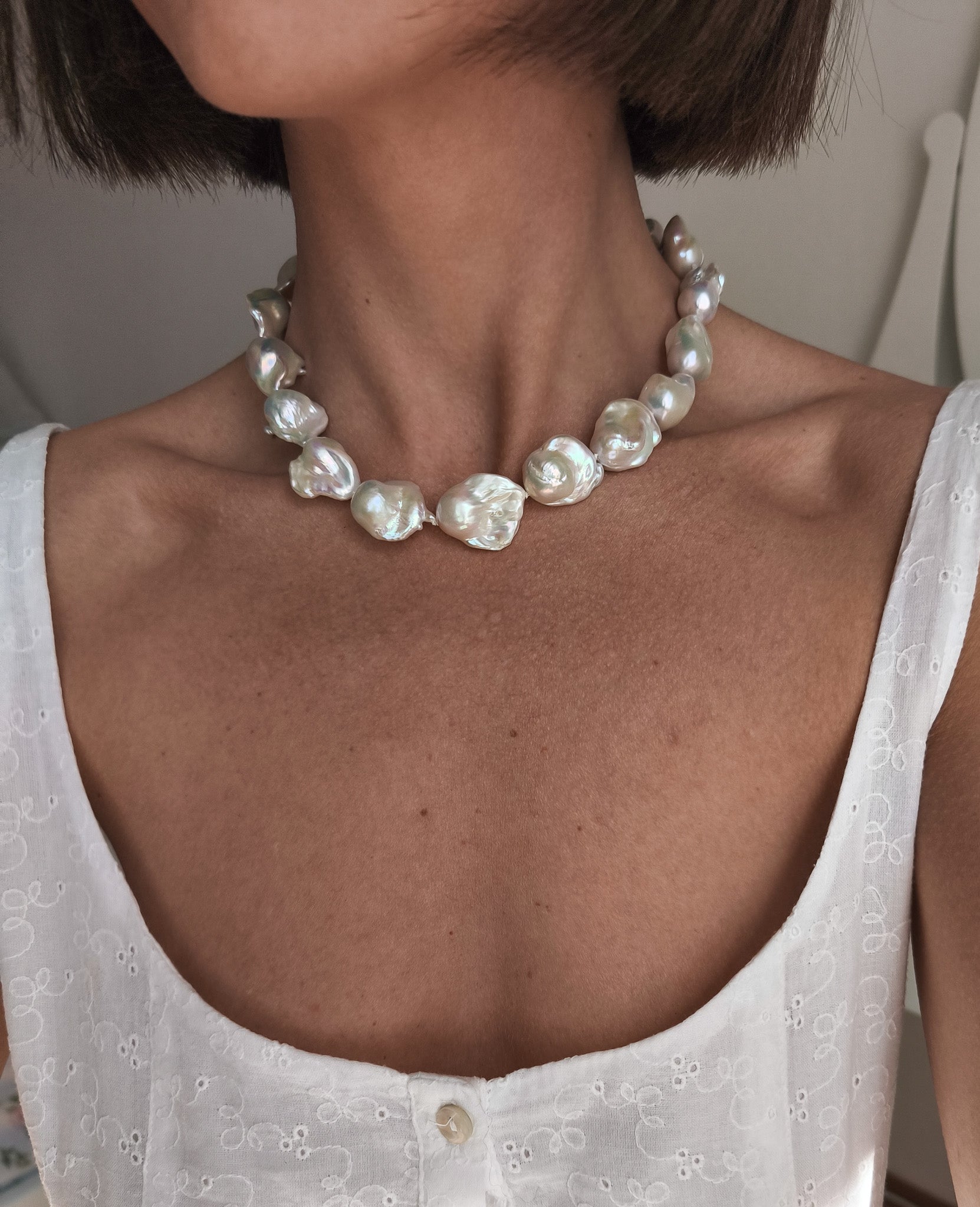 It looks great even with a T-shirt, you don't have to wear these pearls only with elegant clothes, they look good with everything