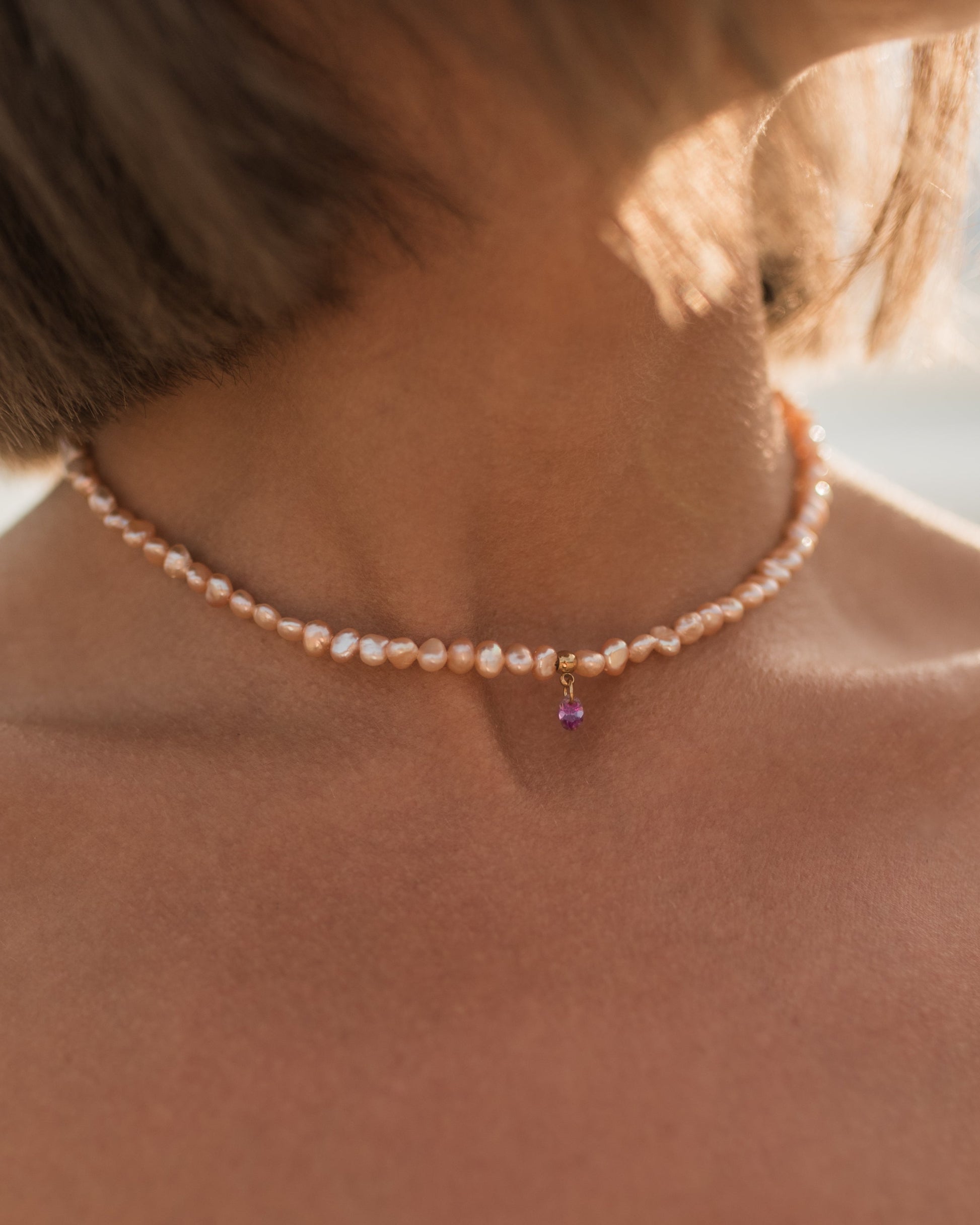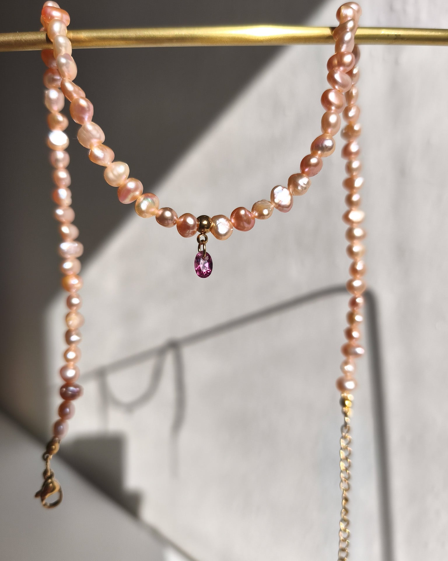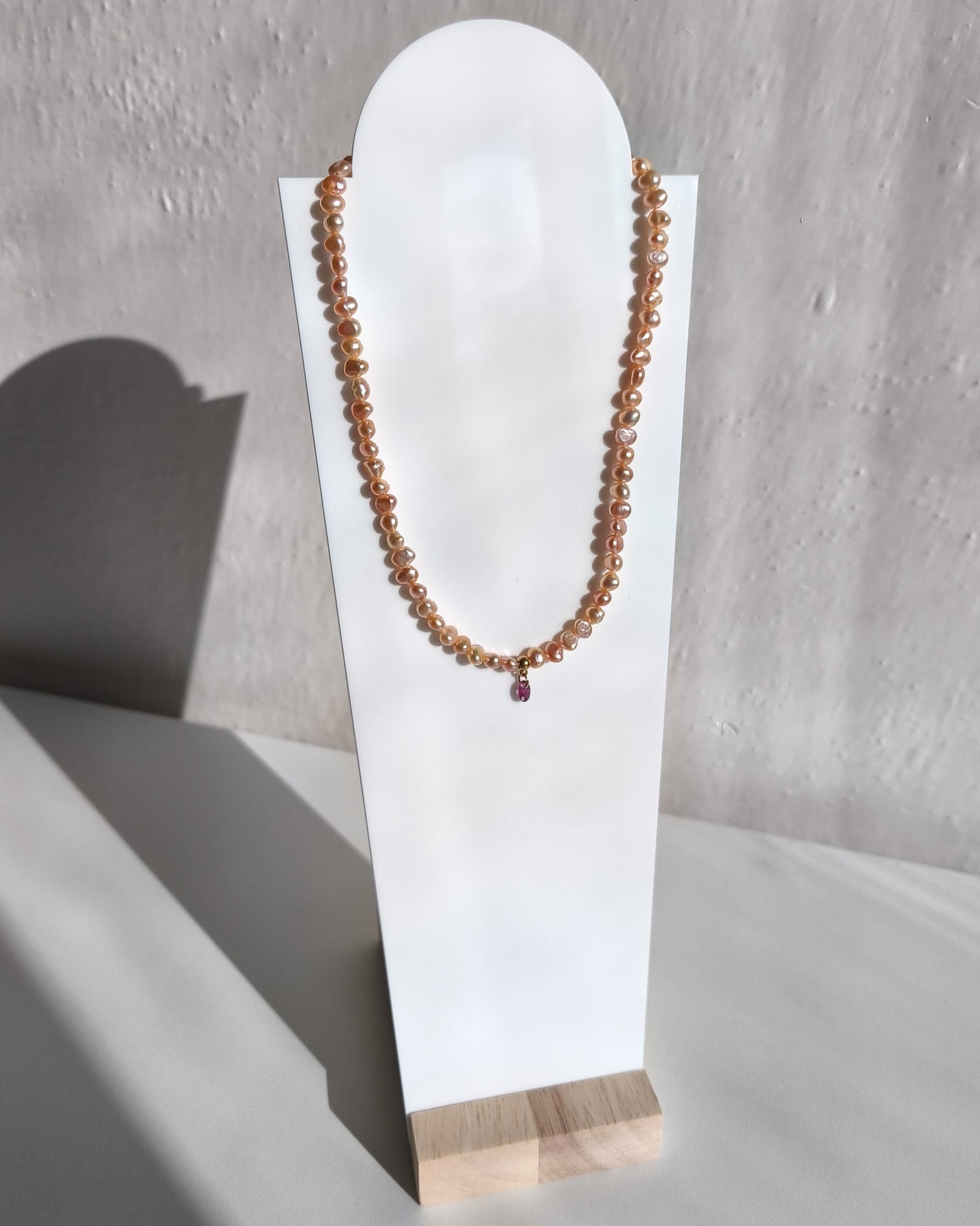 Náhrdelník z meruňkově oranžových perel s broušeným rhodolitem (typ granátu)