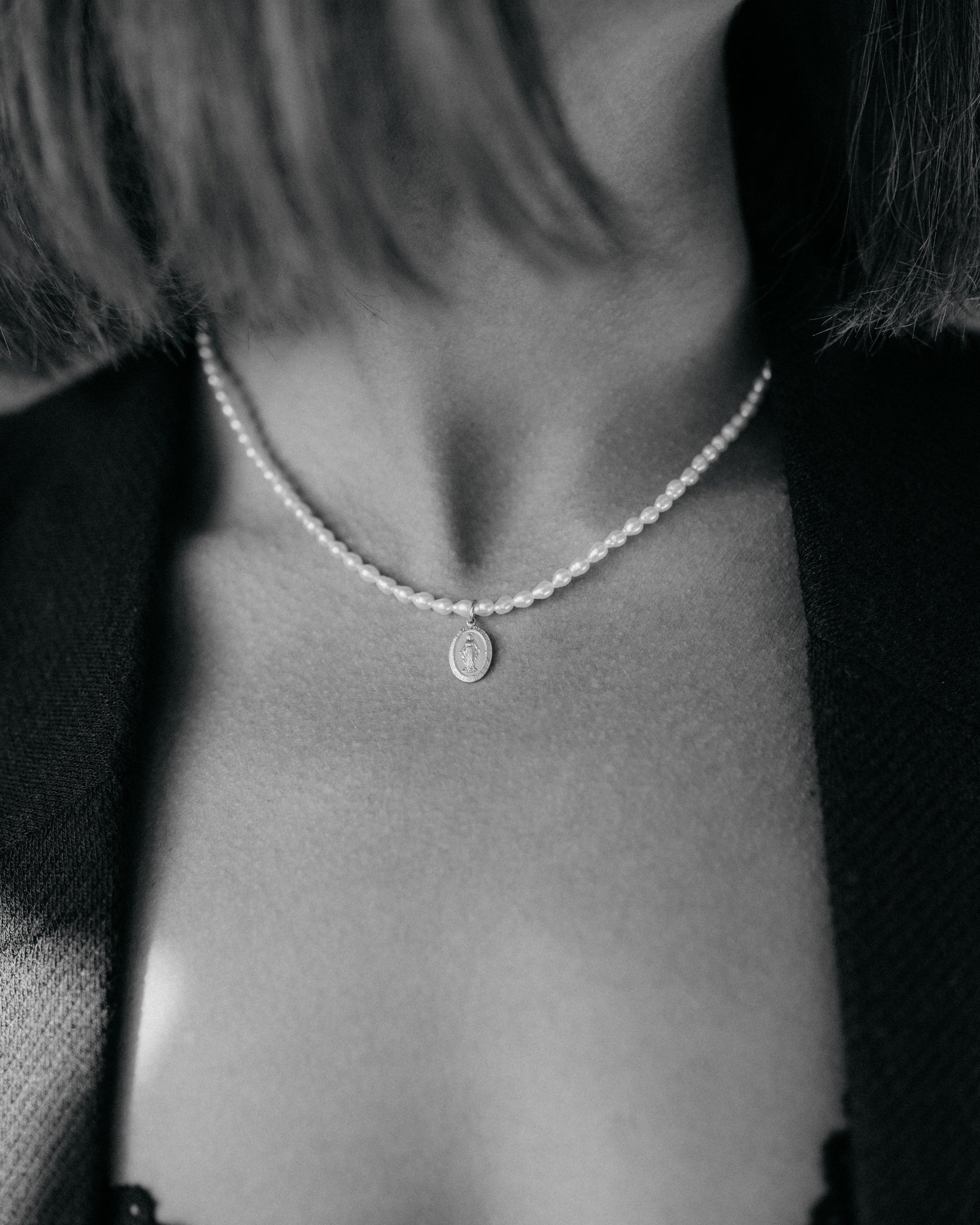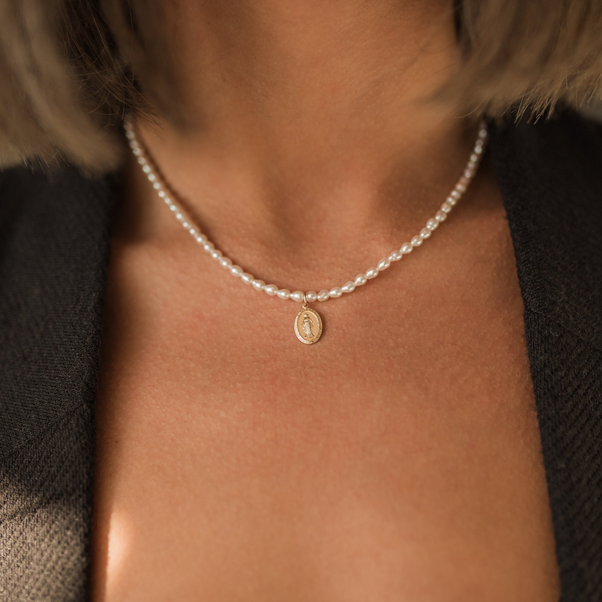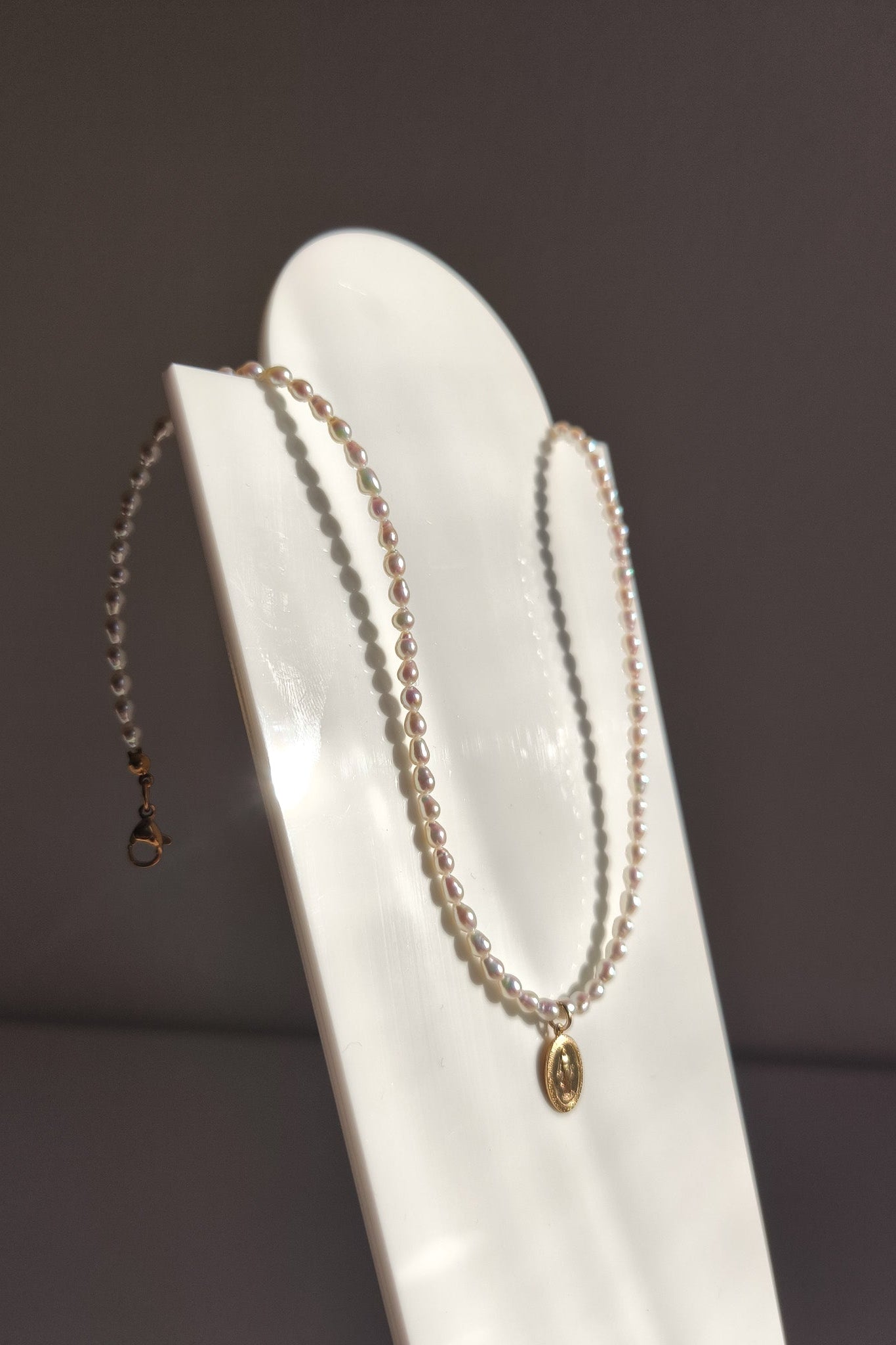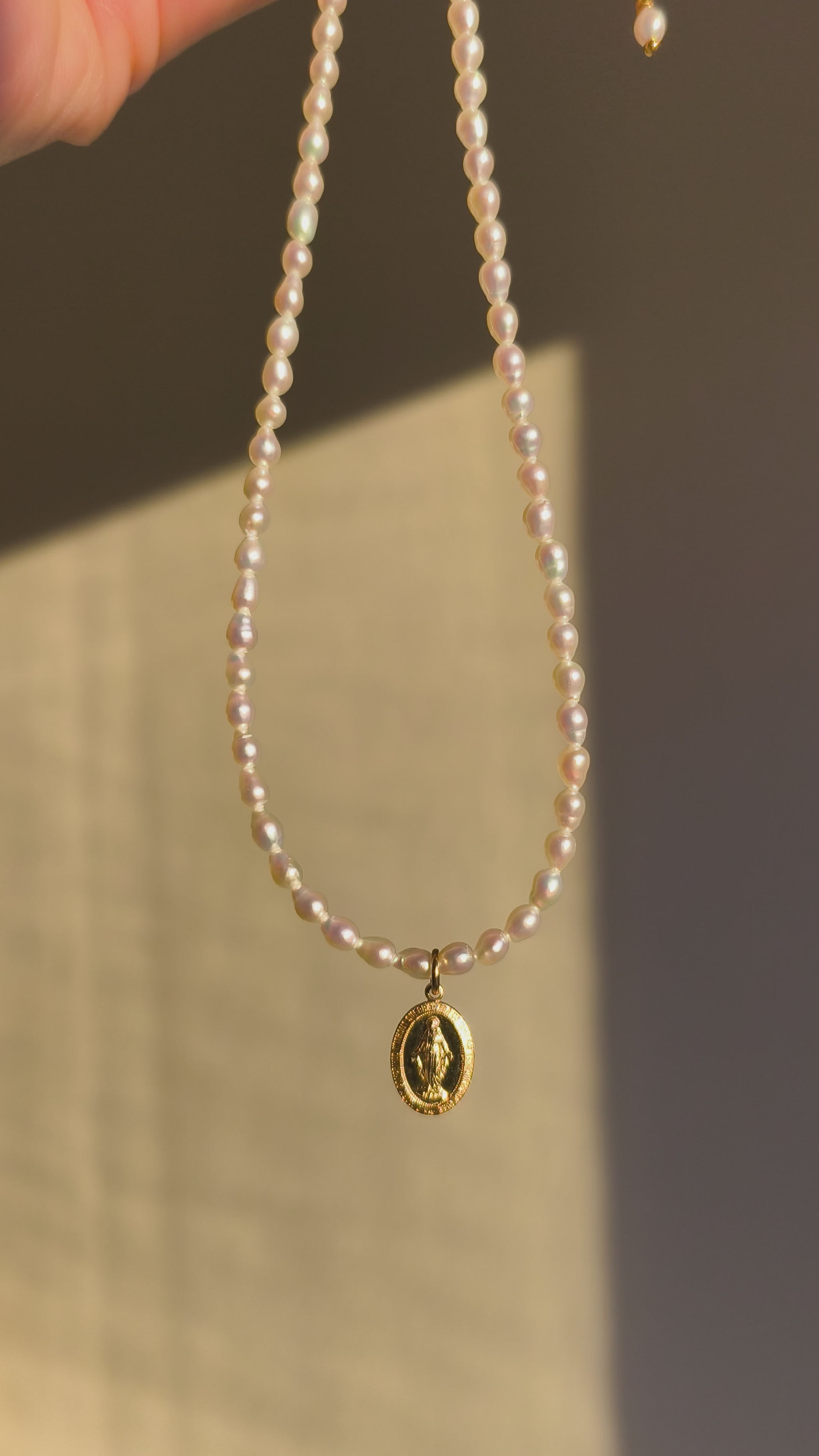 Náhrdelník ze sladkovodních perel s vysokým leskem, přívěsek madonky